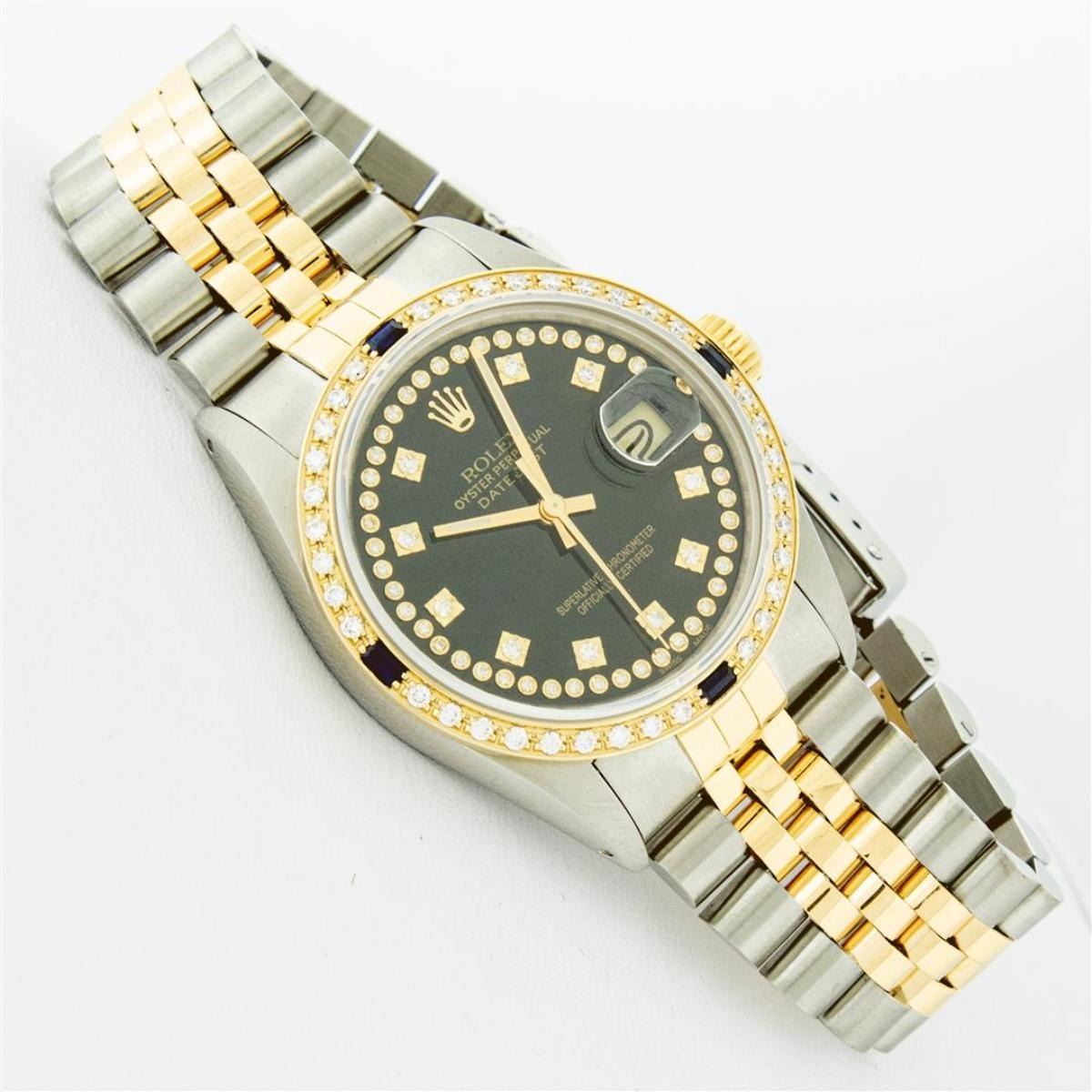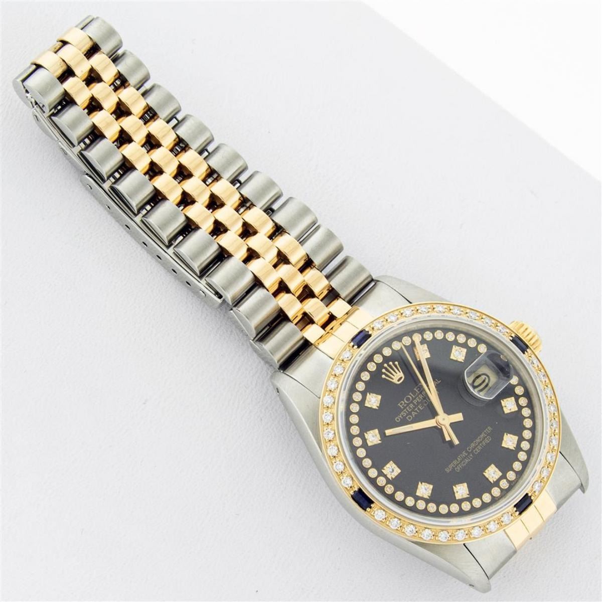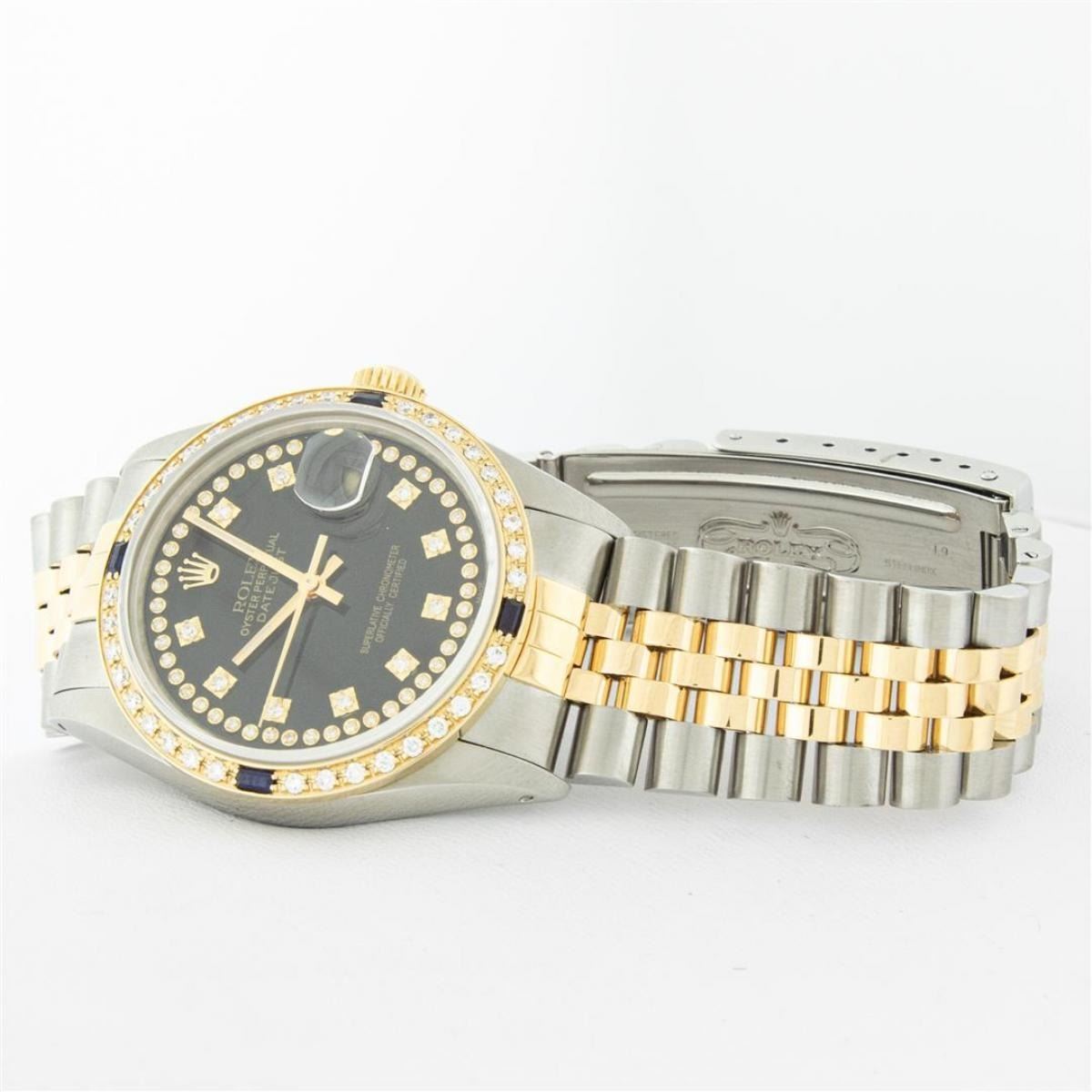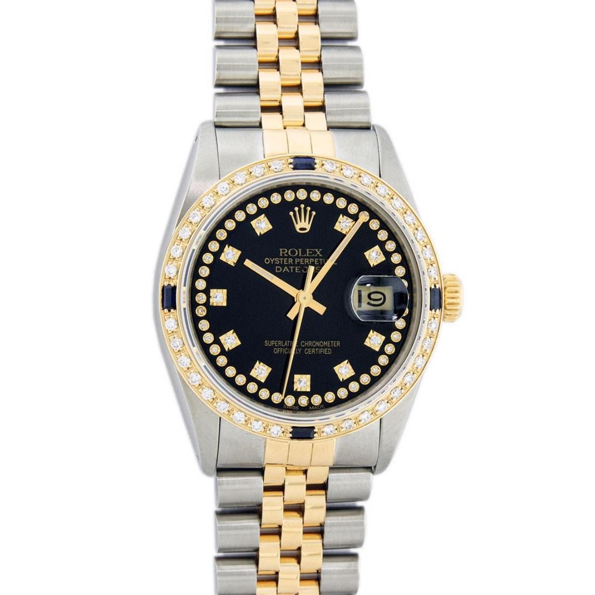 One Mens Yellow Gold Two Tone Rolex Datejust Polished, Serviced & Electronically Tested, Yellow Gold & Stainless Steel Case: 36mm, Yellow Gold Crown, Custom Bezel: 18K Yellow Gold Sapphire Beadset Diamond Bezel, Diamond Count: 36 Diamonds + 4 Sapphires, Total Weight 1.0 Carat, Clarity: SI-VS, Color: G to H. Custom Crystal: New Scratch Resistant Synthetic Sapphire Cyclops Lens. Custom Hands: New Luminecent Hands. Movement: Automatic Winding Movement. Custom Dial: Black String Single Cut Diamond Dial, Diamond Count: 58 Diamonds In Dial, Color: G to H, Clairty: SI-VS Date Window: 3 O'Clock Position Date Display, Quickset, Model: Datejust, Condition: G-6 Extra Fine. Bracelet: Two Tone Yellow Gold & Stainless Steel Jubilee Band. Bright Polish. 7.0 Inch Length, Adjustable. Standard Clasp, With Rolex Logo. This Watch Has Been Serviced Time Tested And Is In Excellent Condition It Is Free Of All Scratches And Dents.