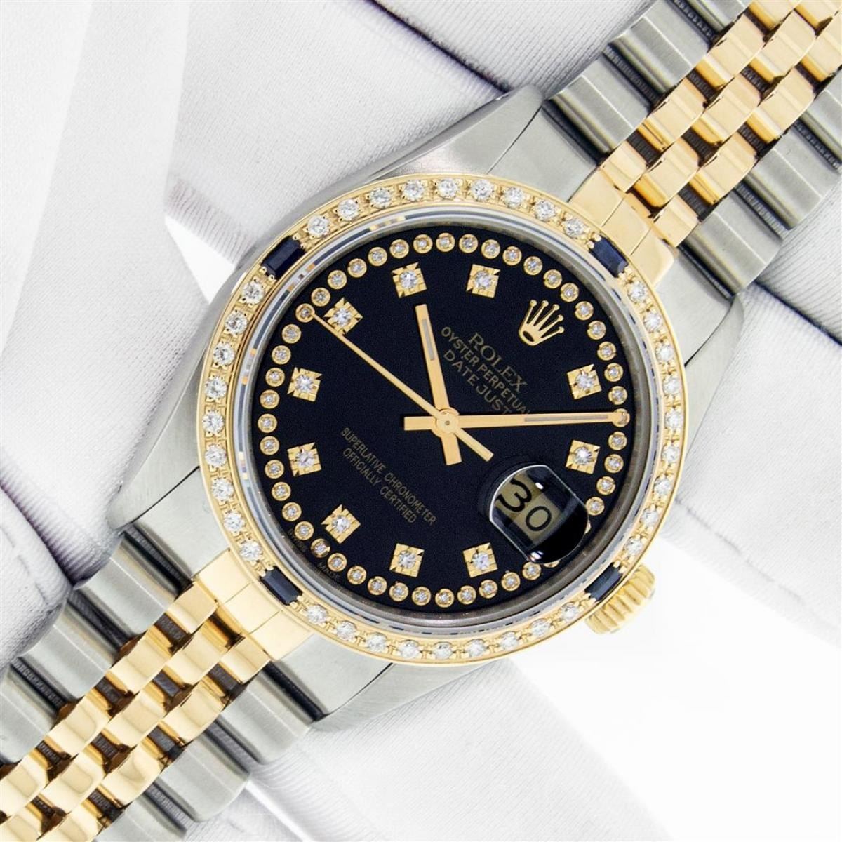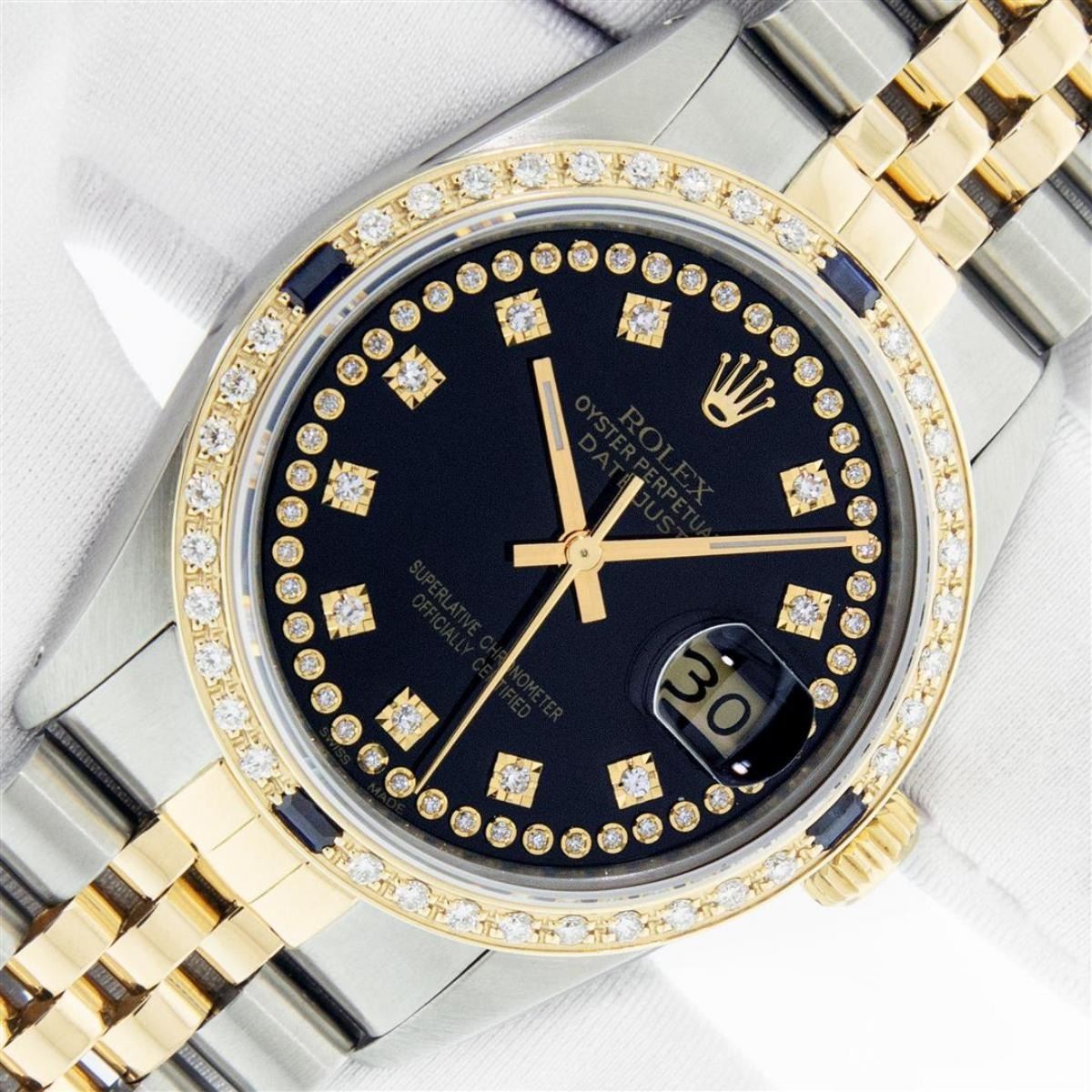 One Mens Yellow Gold Two Tone Rolex Datejust Polished, Serviced & Electronically Tested, Yellow Gold & Stainless Steel Case: 36mm, Yellow Gold Crown, Custom Bezel: 18K Yellow Gold Sapphire Beadset Diamond Bezel, Diamond Count: 36 Diamonds + 4 Sapphires, Total Weight 1.0 Carat, Clarity: SI-VS, Color: G to H. Custom Crystal: New Scratch Resistant Synthetic Sapphire Cyclops Lens. Custom Hands: New Luminecent Hands. Movement: Automatic Winding Movement. Custom Dial: Black String Single Cut Diamond Dial, Diamond Count: 58 Diamonds In Dial, Color: G to H, Clairty: SI-VS Date Window: 3 O'Clock Position Date Display, Quickset, Model: Datejust, Condition: G-6 Extra Fine. Bracelet: Two Tone Yellow Gold & Stainless Steel Jubilee Band. Bright Polish. 7.0 Inch Length, Adjustable. Standard Clasp, With Rolex Logo. This Watch Has Been Serviced Time Tested And Is In Excellent Condition It Is Free Of All Scratches And Dents.