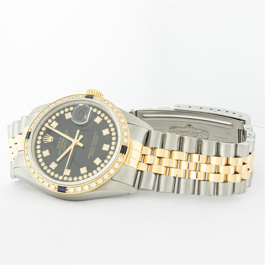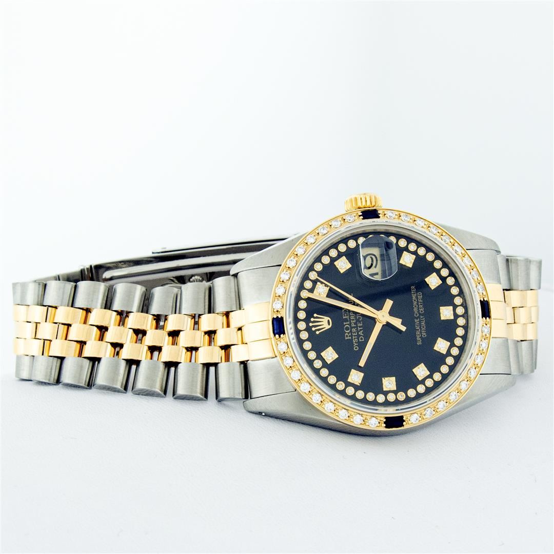 One Mens Pre Owned Yellow Gold Two Tone Rolex Datejust Polished, Serviced & Electronically Tested, Yellow Gold & Stainless Steel Case: 36mm, Yellow Gold Crown, Custom Bezel: New 18K Yellow Gold Sapphire Beadset Diamond Bezel, Diamond Count: 36 Diamonds + 4 Sapphires In Bezel, Clarity: SI-VS, Color: G to H. Custom Crystal: New Sapphire With Date Window. Custom Hands: New Luminescent Hands. Rolex Movement: Automatic Winding Movement. Custom Dial: Refinished To Black With Custom Added Diamonds, Diamond Count: 58 Diamonds In Dial, Color: G to H, Clarity: VS2 Date Window: 3 O'Clock Position Date Display, Quickset, Model: Datejust, Condition: G-6 Extra Fine. Rolex Bracelet: Two Tone Yellow Gold & Stainless Steel Jubilee Band. Bright Polish. 7.0 Inch Length, Adjustable. Standard Clasp, With Rolex Logo. This Watch Has Been Serviced Time Tested And Is In Excellent Condition It Is Free Of All Scratches And Dents.