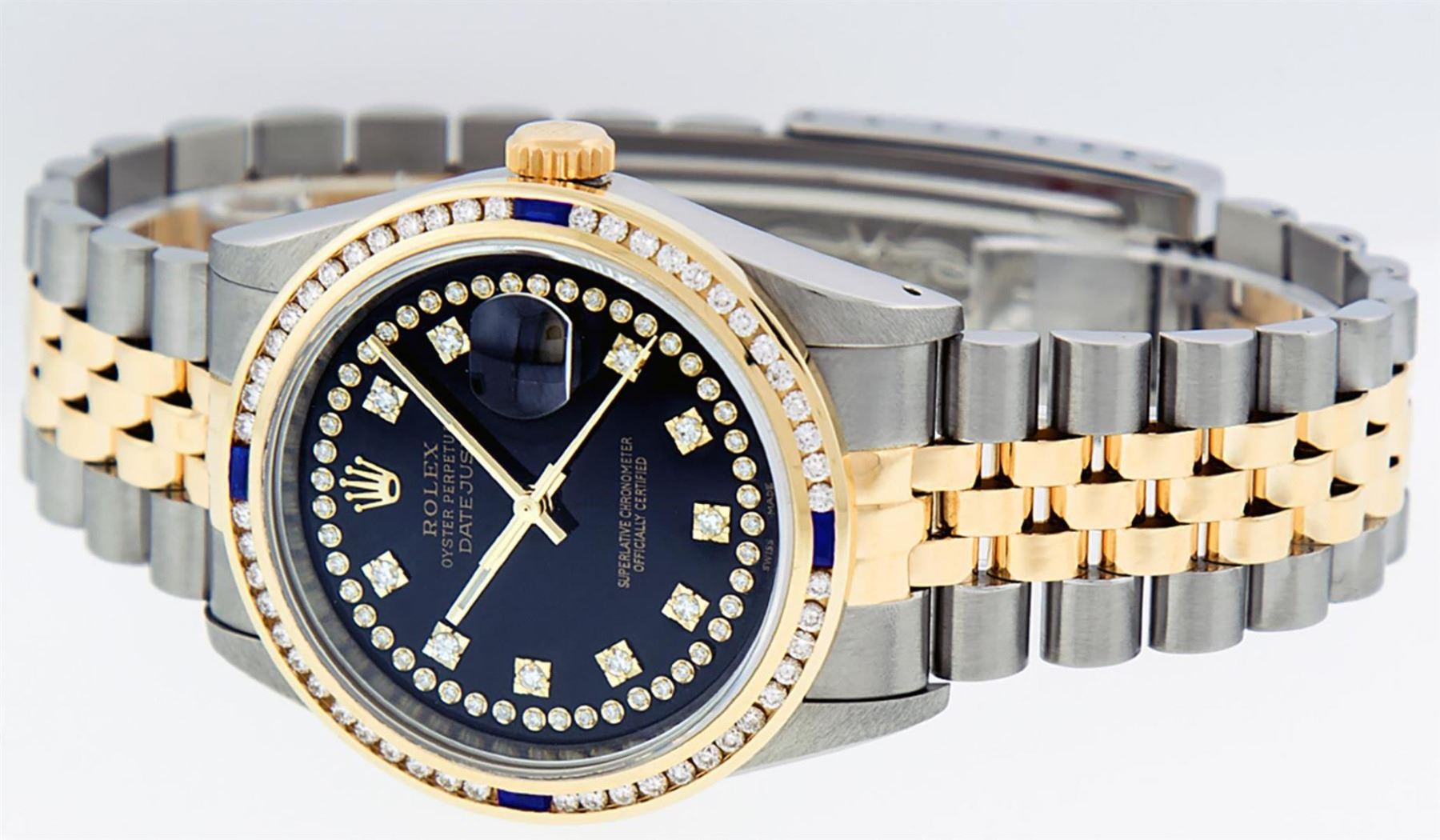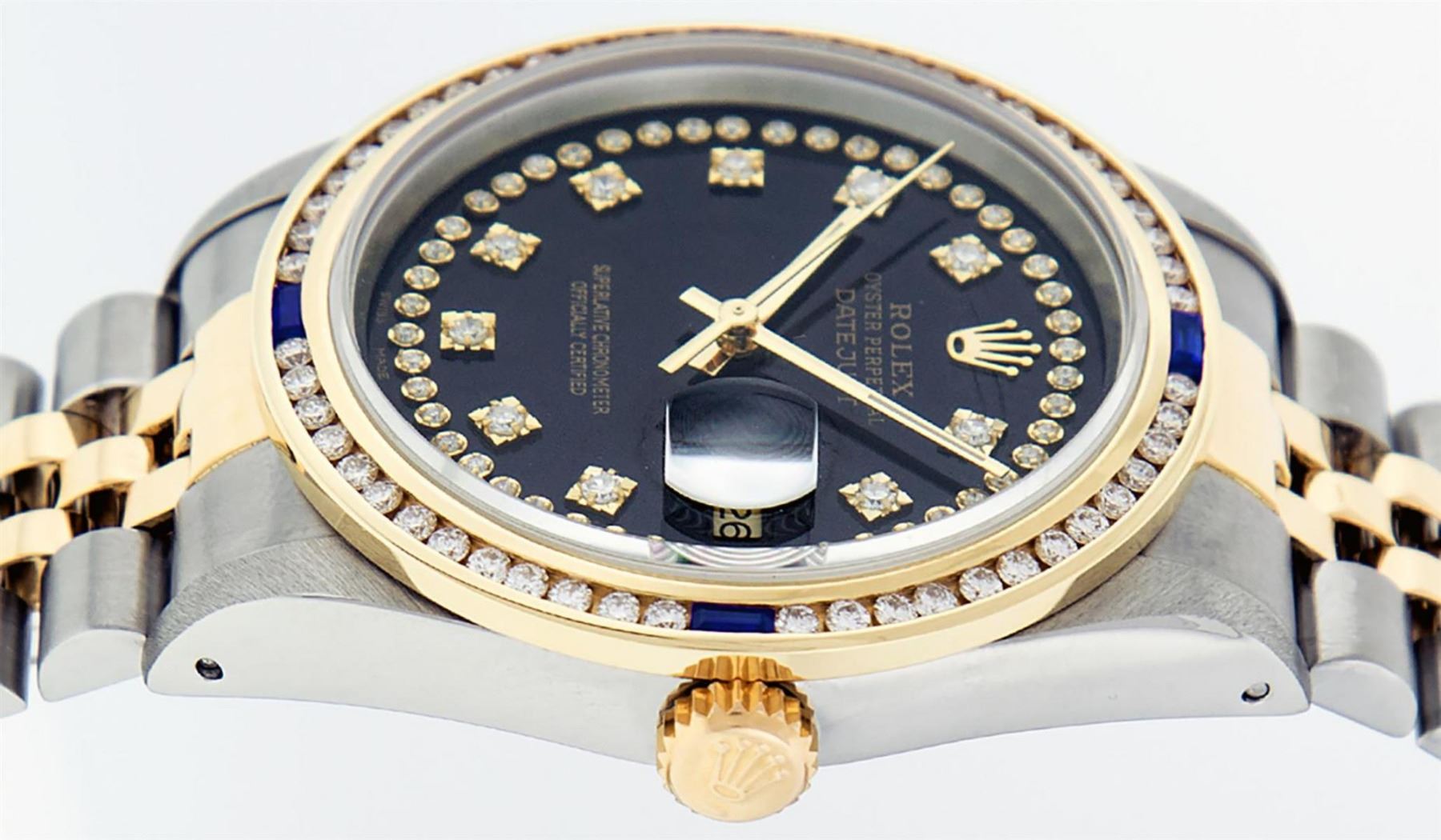 One Mens Yellow Gold Two Tone Rolex Datejust Polished, Serviced & Electronically Tested, Yellow Gold & Stainless Steel Case: 36mm, Yellow Gold Crown, Custom Bezel: New 18K Yellow Gold Sapphire Channel Set Diamond Bezel, Diamond Count: 52 Diamonds + 4 Sapphires, Total Weight 1.30 Carat, Clarity: SI-VS, Color: G to H. Custom Crystal: New Scratch Resistant Synthetic Sapphire Cyclops Lens. Custom Hands: New Luminecent Hands. Movement: Automatic Winding Movement . Custom Dial: Black String Diamond Dial With Single Cut Diamonds, Diamond Count: 58 Diamonds in Dial. Date Window: 3 O'Clock Position Date Display, Quickset, Model: Datejust. Condition: G-6 Extra Fine. Bracelet:Two Tone Yellow Gold & Stainless Steel Jubilee Band. Bright Polish. 7.0 Inch Length, Adjustable. Standard Clasp, With Rolex Logo. This Watch Has Been Serviced Time Tested And Is In Excellent Condition It Is Free Of All Scratches And Dents.