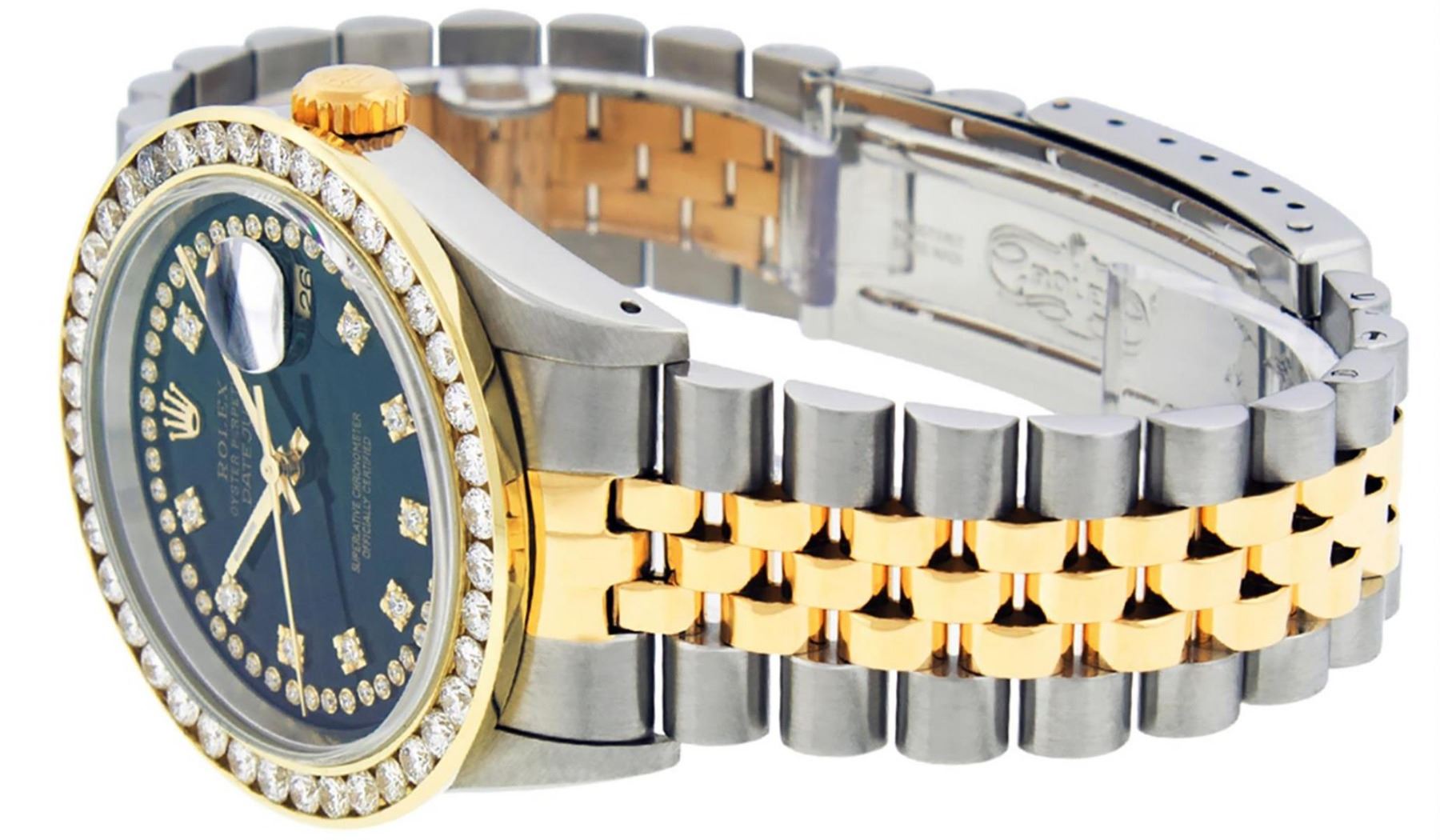 One Mens Yellow Gold Rolex Datejust Polished Bright with Satin Finish, Serviced & Electronically Tested, Stainless Steel Case: 36mm, Yellow Gold Crown, Custom Bezel: New 18K Yellow Gold 3ct Channel Set Diamond Bezel, Diamond Count: 40 Diamonds, Total Weight 3.00 Carat, Clarity: SI-VS, Color: G to H. Custom Crystal: New Scratch Resistant Synthetic Sapphire Cyclops Lens. Custom Hands: New Luminecent Hands. Movement: Automatic Winding Movement. Custom Dial: Black String Diamond Dial, Diamond Count: 58 Diamonds In Dial, Color: G to H, Clarity: VS. Date Window: 3 O'Clock Position Date Display, Quickset, Model: Datejust. Condition: G-6 Extra Fine. Bracelet: Yellow Gold And Stainless Steel Jubilee Band. Bright Polish & Satin Finish. 7.0 Inch Length, Adjustable. Standard Clasp, With Rolex Logo. This Watch Has Been Serviced And Polished It Is Free Of All Scratches And Dents.
