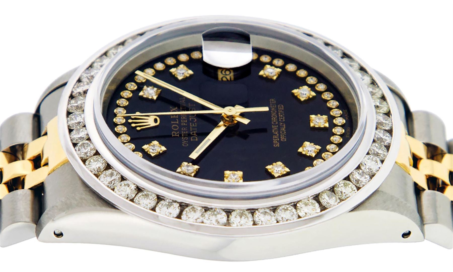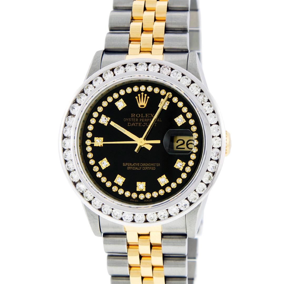 One Mens 14K Yellow Gold Rolex Datejust Polished Bright with Satin Finish, Serviced & Electronically Tested, Stainless Steel Case: 36mm, Yellow Gold Crown, Custom Bezel: New 18K White Gold 3ct Channel Set Diamond Bezel, Diamond Count: 40 Diamonds, Total Weight 3.00 Carat, Clarity: SI-VS, Color: G to H. Custom Crystal: New Synthetic Sapphire Cyclops Lens. Custom Hands: New Luminecent Hands. Movement: Automatic Winding Movement Caliber 3035. Custom Dial: Black String Diamond Dial, Diamond Count: 58 Diamonds In Dial, Color: G to H, Clarity: VS. Date Window: 3 O'Clock Position Date Display, Quickset, Model: 16013 Datejust. Condition: G-6 Extra Fine. Bracelet: 14K Yellow Gold And Stainless Steel Jubilee Band. Bright Polish & Satin Finish. 7.0 Inch Length, Adjustable. Standard Clasp, With Rolex Logo. This Watch Has Been Serviced And Polished It Is Free Of All Scratches And Dents.