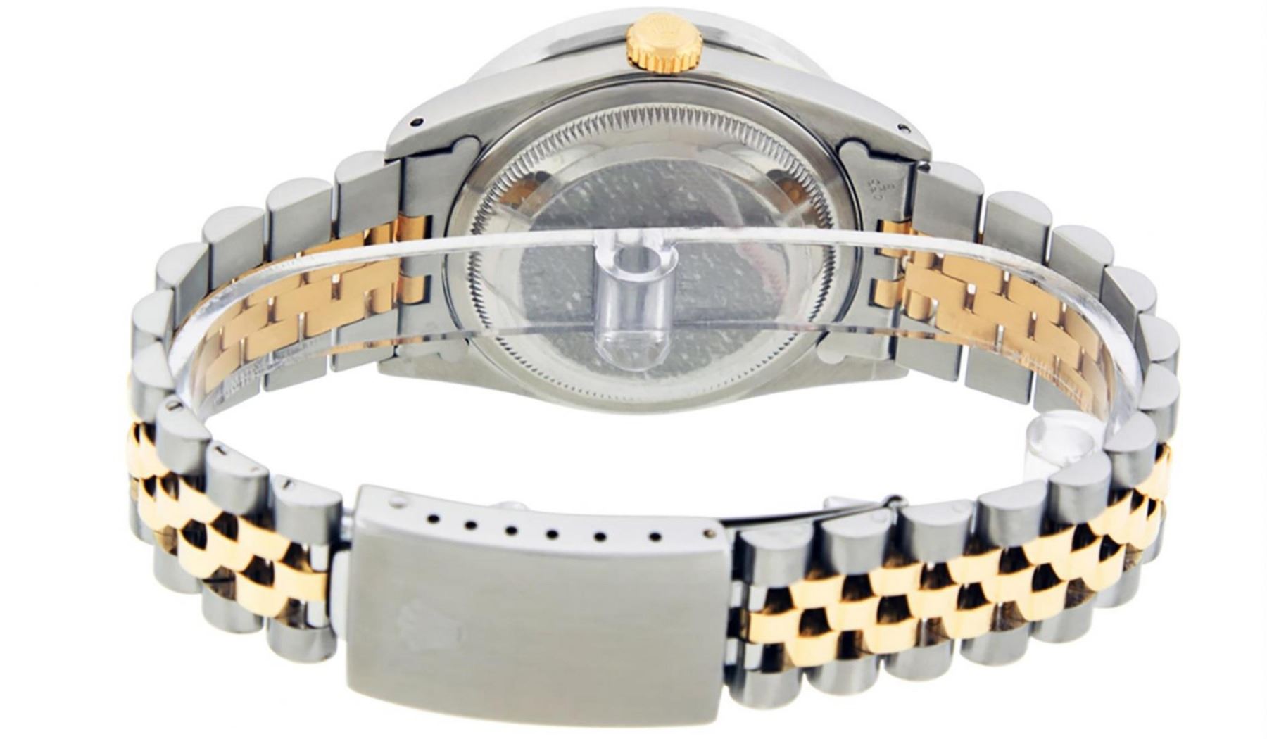 One Mens 14K Yellow Gold Rolex Datejust Polished Bright with Satin Finish, Serviced & Electronically Tested, Stainless Steel Case: 36mm, Yellow Gold Crown, Custom Bezel: New 18K White Gold 3ct Channel Set Diamond Bezel, Diamond Count: 40 Diamonds, Total Weight 3.00 Carat, Clarity: SI-VS, Color: G to H. Custom Crystal: New Synthetic Sapphire Cyclops Lens. Custom Hands: New Luminecent Hands. Movement: Automatic Winding Movement Caliber 3035. Custom Dial: Black String Diamond Dial, Diamond Count: 58 Diamonds In Dial, Color: G to H, Clarity: VS. Date Window: 3 O'Clock Position Date Display, Quickset, Model: 16013 Datejust. Condition: G-6 Extra Fine. Bracelet: 14K Yellow Gold And Stainless Steel Jubilee Band. Bright Polish & Satin Finish. 7.0 Inch Length, Adjustable. Standard Clasp, With Rolex Logo. This Watch Has Been Serviced And Polished It Is Free Of All Scratches And Dents.