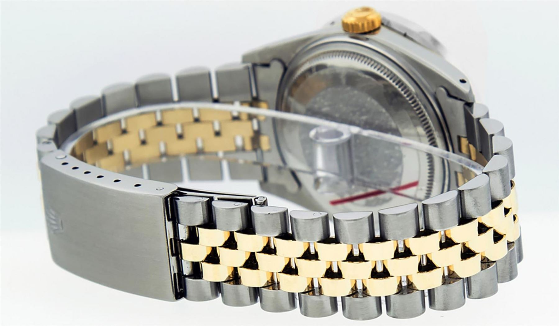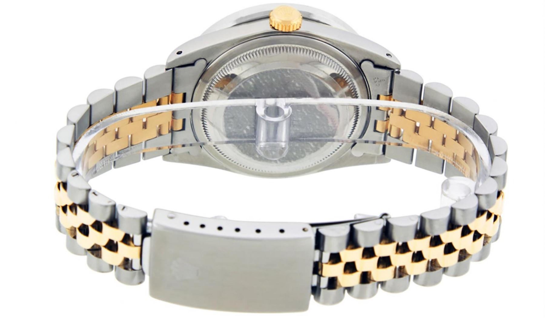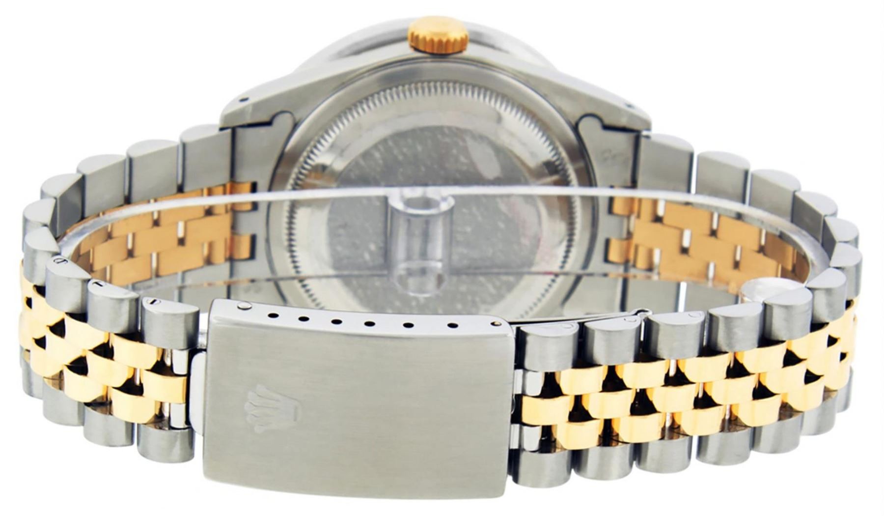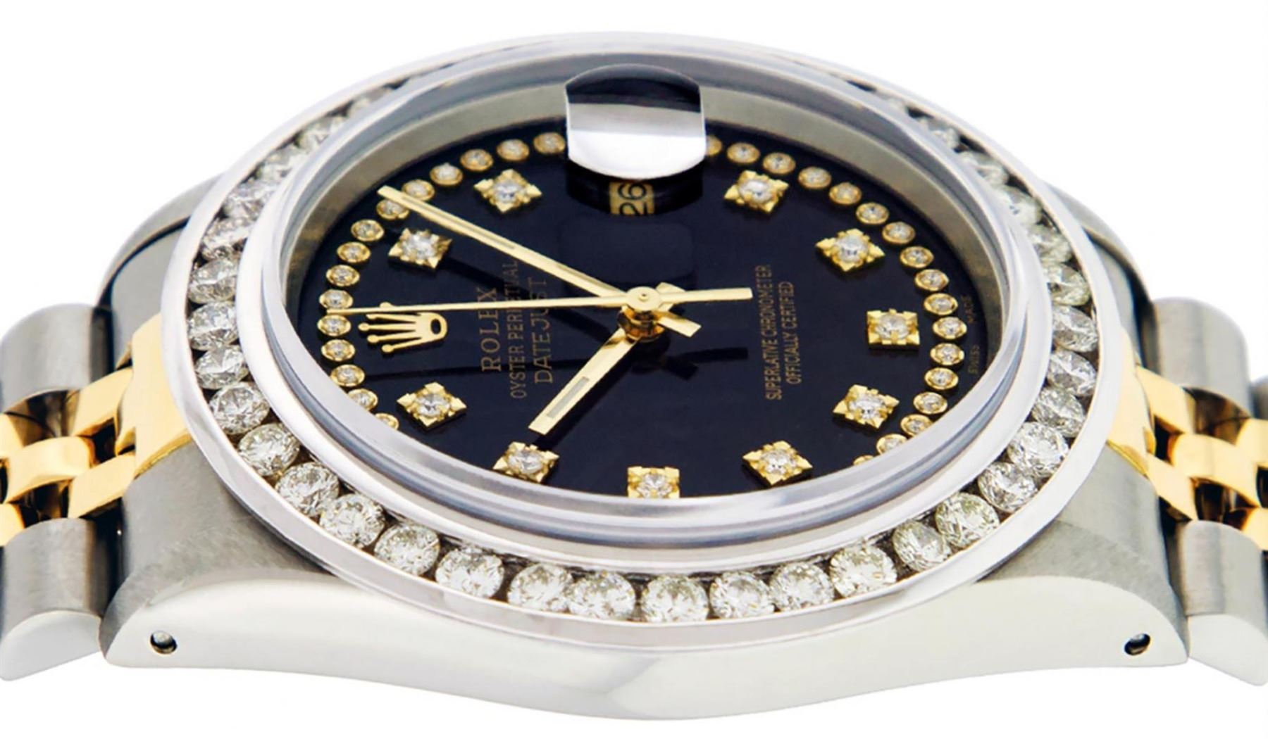 One Mens Yellow Gold Rolex Datejust Polished Bright with Satin Finish, Serviced & Electronically Tested, Stainless Steel Case: 36mm, Yellow Gold Crown, Custom Bezel: New 18K White Gold 3ct Channel Set Diamond Bezel, Diamond Count: 40 Diamonds, Total Weight 3.00 Carat, Clarity: SI-VS, Color: G to H. Custom Crystal: New Scratch Resistant Synthetic Sapphire Cyclops Lens. Custom Hands: New Luminecent Hands. Movement: Automatic Winding Movement. Custom Dial: Black String Diamond Dial, Diamond Count: 58 Diamonds In Dial, Color: G to H, Clarity: VS. Date Window: 3 O'Clock Position Date Display, Quickset, Model: Datejust. Condition: G-6 Extra Fine. Bracelet: Yellow Gold And Stainless Steel Jubilee Band. Bright Polish & Satin Finish. 7.0 Inch Length, Adjustable. Standard Clasp, With Rolex Logo. This Watch Has Been Serviced And Polished It Is Free Of All Scratches And Dents.