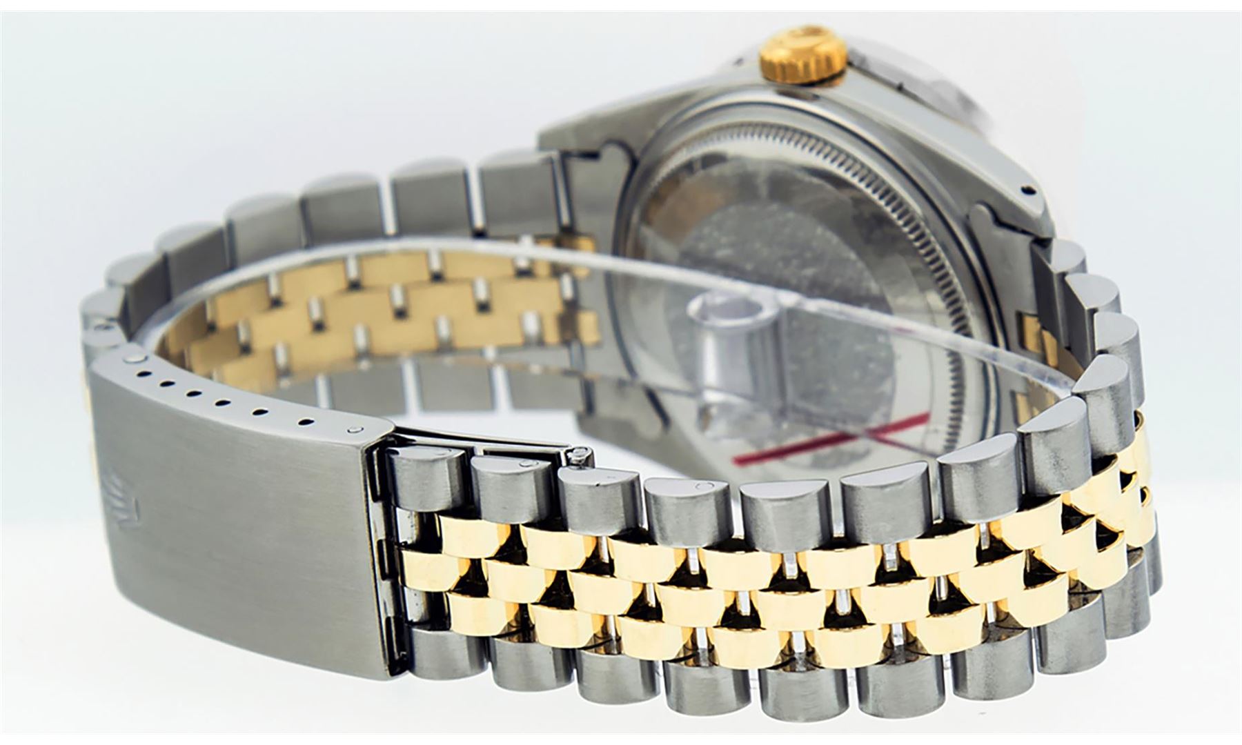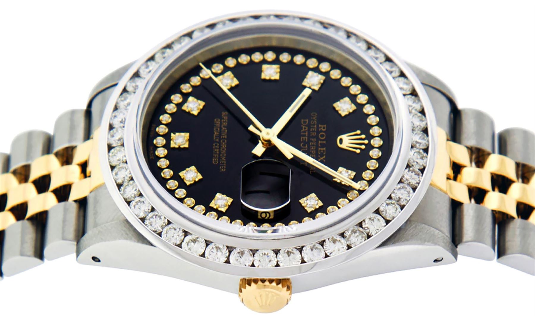 One Mens Pre Owned Yellow Gold Rolex Datejust Polished Bright with Satin Finish, Serviced & Electronically Tested, Rolex Stainless Steel Case: 36mm, Rolex Yellow Gold Crown, Custom Bezel: New 18K White Gold 3ct Channel Set Diamond Bezel, Diamond Count: 40