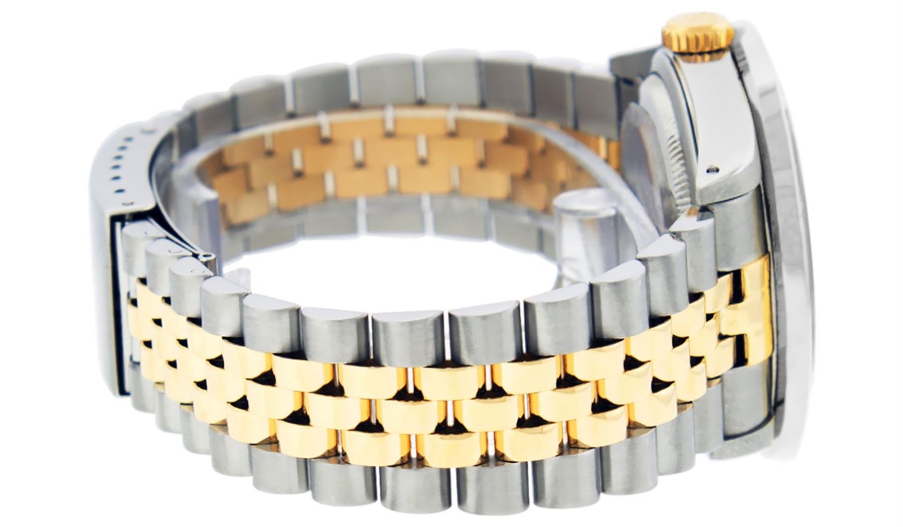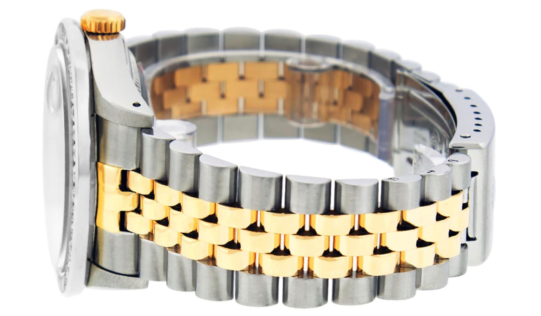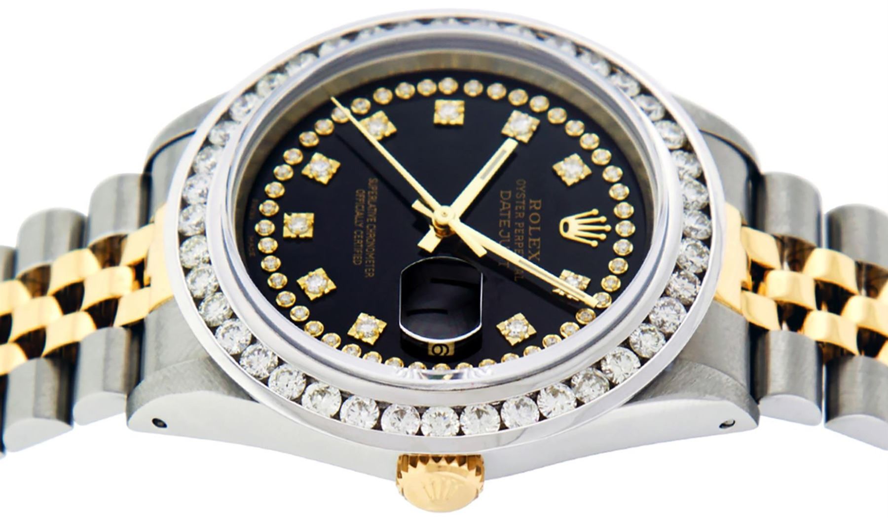 One Mens Pre Owned Yellow Gold Rolex Datejust Polished Bright with Satin Finish, Serviced & Electronically Tested, Rolex Stainless Steel Case: 36mm, Rolex Yellow Gold Crown, Custom Bezel: New 18K White Gold 3ct Channel Set Diamond Bezel, Diamond Count: 40 Diamonds, Total Weight 3.00 Carat, Clarity: SI-VS, Color: G to H. Custom Crystal: New Sapphire With Date Window. Custom Hands: New Luminescent Hands. Rolex Movement: Automatic Winding Movement. Custom Dial: Refinished To Black With Custom Added Diamonds, Diamond Count: 58 Diamonds In Dial, Color: G to H, Clarity: VS. Date Window: 3 O'clock Position Date Display, Quickset, Model: Datejust. Condition: G-6 Extra Fine. Rolex Bracelet: Yellow Gold And Stainless Steel Jubilee Band. Bright Polish & Satin Finish. 7.0 Inch Length, Adjustable. Standard Clasp, With Rolex Logo. This Watch Has Been Serviced And Polished It Is Free Of All Scratches And Dents.