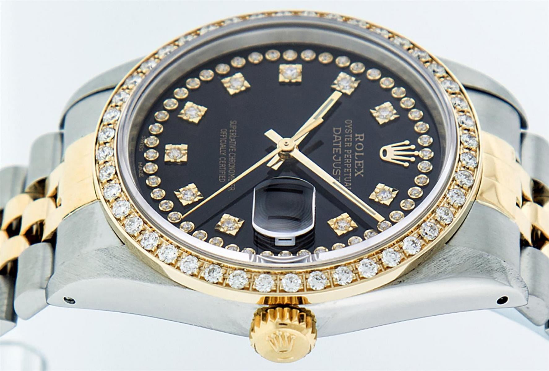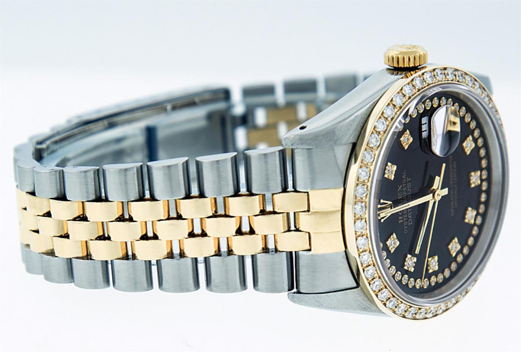 One Mens Pre Owned Yellow Gold Two Tone Rolex Datejust Polished, Serviced & Electronically Tested, Rolex Yellow Gold & Stainless Steel Case: 36mm, Rolex Yellow Gold Crown, Custom Bezel: New 18K Yellow Gold Bead set Diamond Bezel, Diamond Count: 44 Diamond