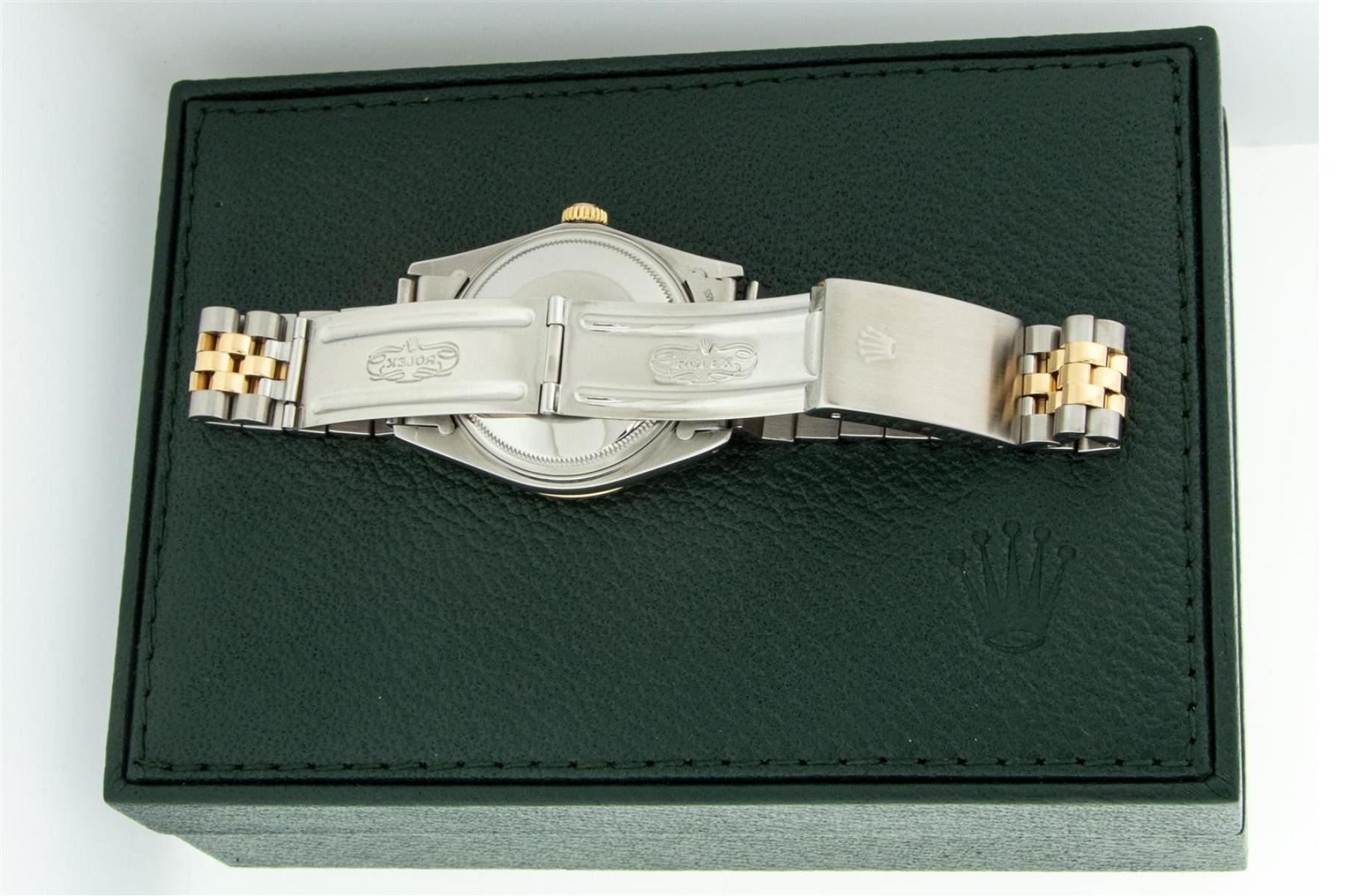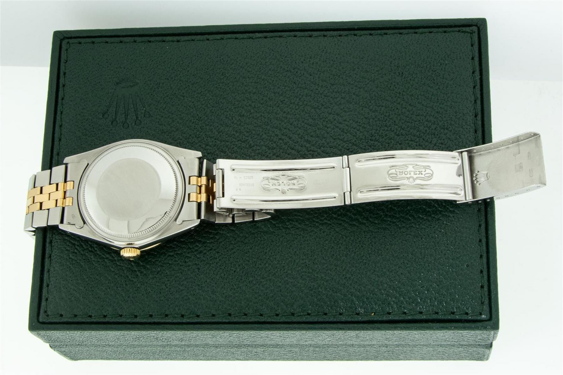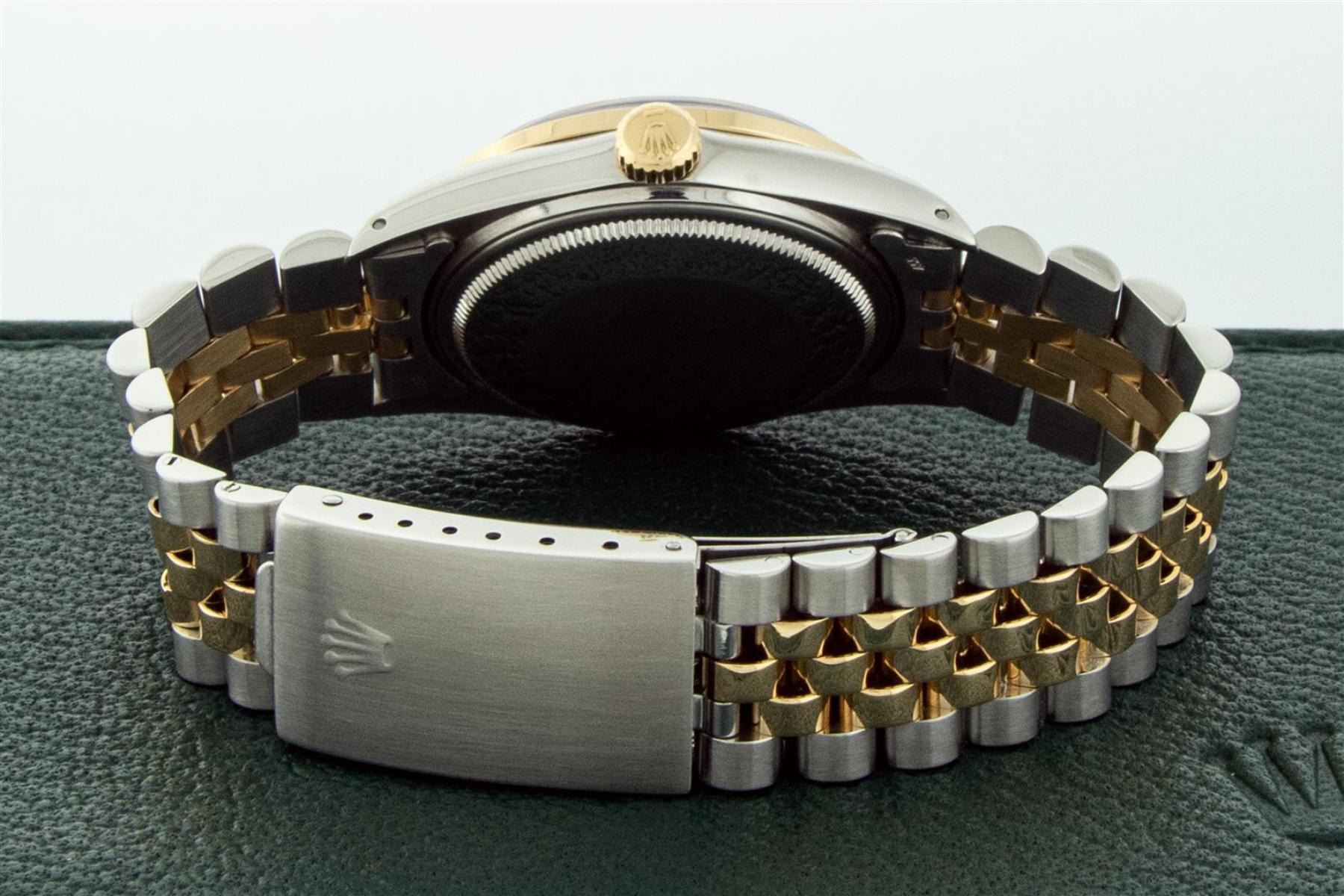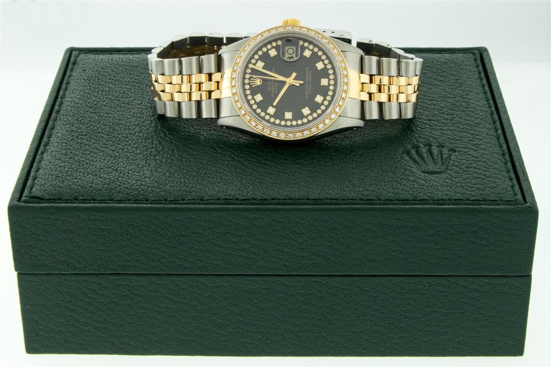 One Mens Yellow Gold Two Tone Rolex Datejust Polished, Serviced & Electronically Tested, Yellow Gold & Stainless Steel Case: 36mm, Yellow Gold Crown, Custom Bezel: New 18K Yellow Gold Beadset Diamond Bezel, Diamond Count: 44 Diamonds, Total Weight 1.00 Carat, Clarity: SI-VS, Color: G to H. Custom Crystal: New Scratch Resistant Synthetic Sapphire Cyclops Lens. Custom Hands: New Luminecent Hands. Movement: Automatic Winding Movement. Custom Dial: Black VS Single Cut String Diamond Dial, Diamond Count: 58 Diamonds in Dial G To H In Color, VS In Clarity. Date Window: 3 O'Clock Position Date Display, Quickset, Model: Datejust. Condition: G-6 Extra Fine. Bracelet:Two Tone Yellow Gold & Stainless Steel Jubilee. Bright Polish. 7.0 Inch Length, Adjustable. Standard Clasp, With Rolex Logo. This Watch Has Been Serviced Time Tested And Is In Excellent Condition It Is Free Of All Scratches And Dents.