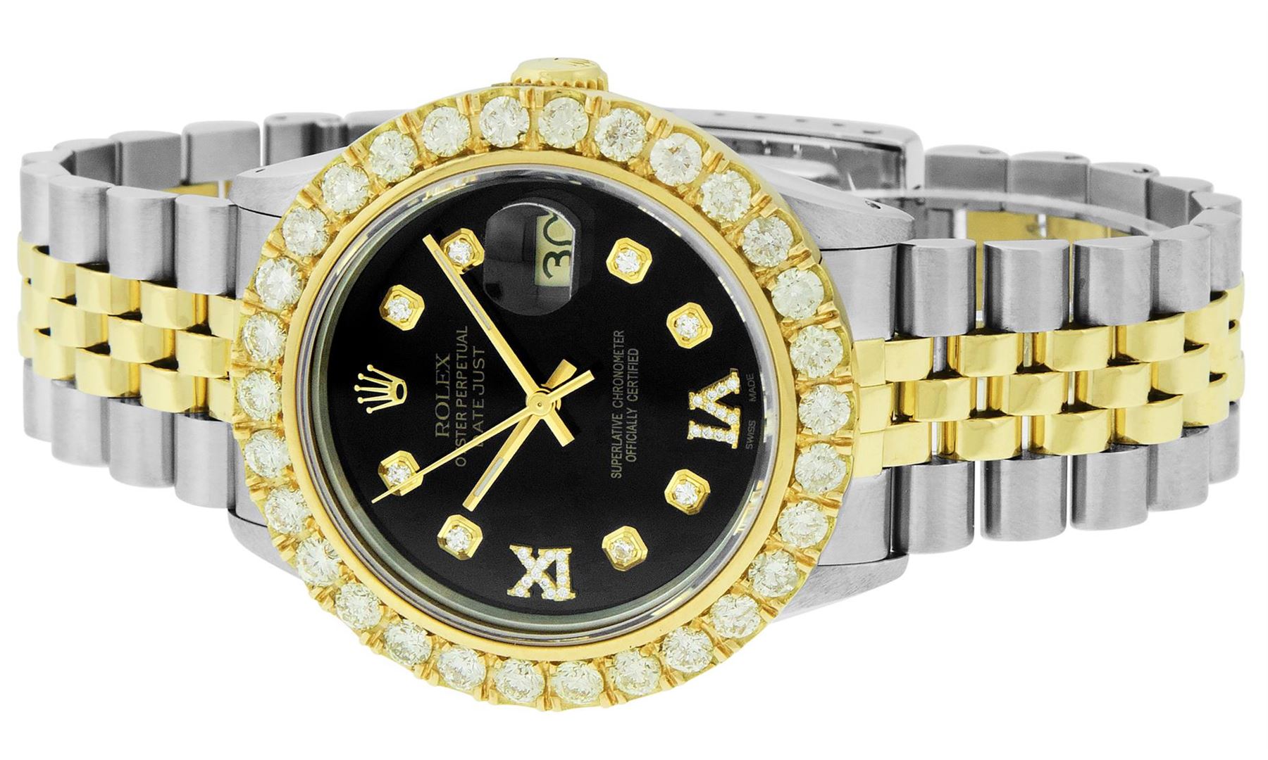 One Mens 14K Yellow Gold Rolex Datejust Polished Bright with Satin Finish, Serviced & Electronically Tested, Stainless Steel Case: 36mm, Yellow Gold Crown, Custom Bezel: New 18K Yellow Gold 4ct beadset Diamond Bezel, Diamond Count: 30 Diamonds, Total Bezel Weight 4.00 Carat, Clarity: SI-VS, Color: G to H. Custom Crystal: New Synthetic Sapphire Cyclops Lens. Custom Hands: New Luminecent Hands. Movement: Automatic Winding Movement Caliber 3035. Custom Dial: Black Diamond Dial, Diamond Count: 8 Diamonds + 2 Roman Diamonds On Dial, Color: G to H, Clarity: VS. Date Window: 3 O'Clock Position Date Display, Quickset, Model: Datejust. Condition: G-6 Extra Fine. Bracelet: 14K Yellow Gold And Stainless Steel Jubilee Band. Bright Polish & Satin Finish. 7.0 Inch Length, Adjustable. Standard Clasp, With Rolex Logo. This Watch Has Been Serviced And Polished It Is Free Of All Scratches And Dents. This Watch Comes With A Rolex Box.
