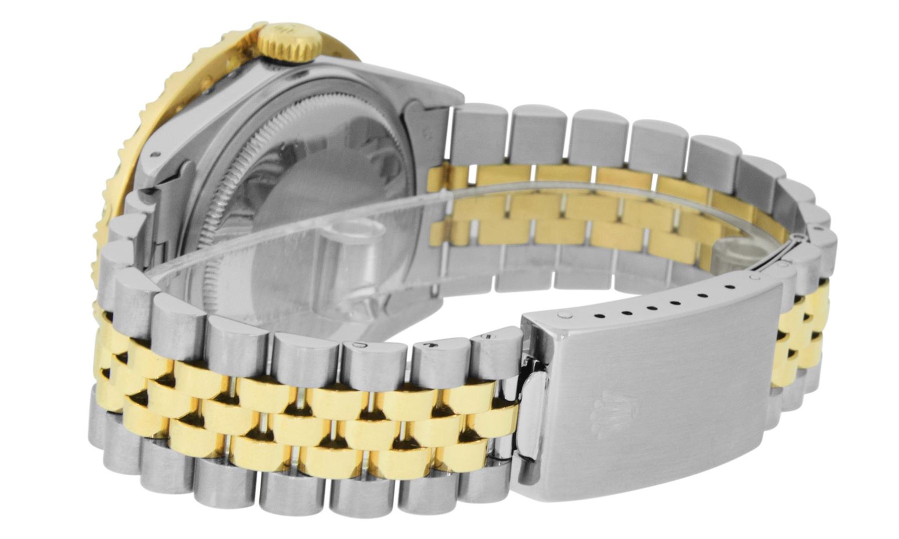One Mens 14K Yellow Gold Rolex Datejust Polished Bright with Satin Finish, Serviced & Electronically Tested, Stainless Steel Case: 36mm, Yellow Gold Crown, Custom Bezel: New 18K Yellow Gold 4ct beadset Diamond Bezel, Diamond Count: 30 Diamonds, Total Bezel Weight 4.00 Carat, Clarity: SI-VS, Color: G to H. Custom Crystal: New Synthetic Sapphire Cyclops Lens. Custom Hands: New Luminecent Hands. Movement: Automatic Winding Movement Caliber 3035. Custom Dial: Black Diamond Dial, Diamond Count: 8 Diamonds + 2 Roman Diamonds On Dial, Color: G to H, Clarity: VS. Date Window: 3 O'Clock Position Date Display, Quickset, Model: Datejust. Condition: G-6 Extra Fine. Bracelet: 14K Yellow Gold And Stainless Steel Jubilee Band. Bright Polish & Satin Finish. 7.0 Inch Length, Adjustable. Standard Clasp, With Rolex Logo. This Watch Has Been Serviced And Polished It Is Free Of All Scratches And Dents. This Watch Comes With A Rolex Box.