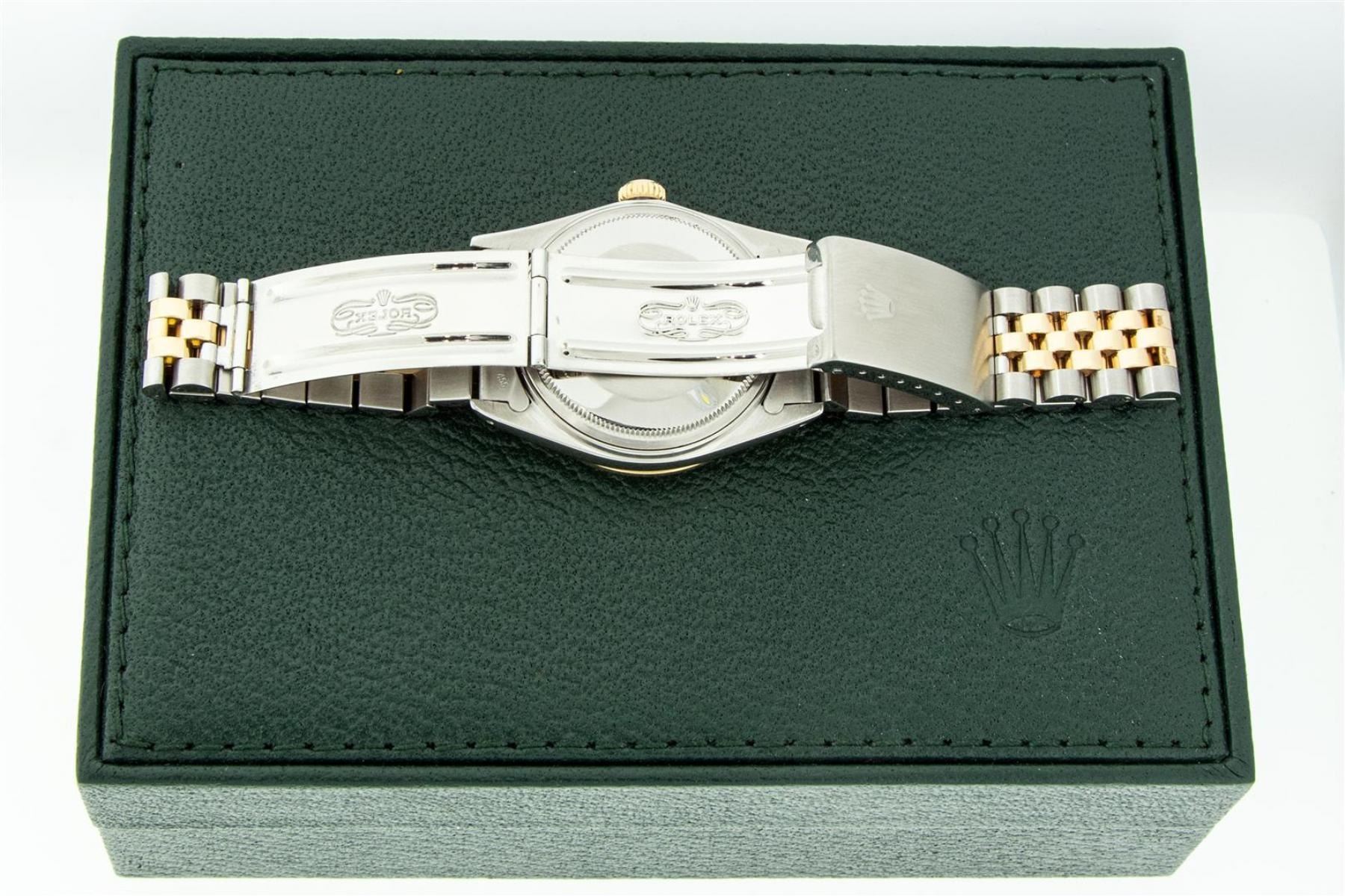 One Mens Yellow Gold Two Tone Rolex Datejust Polished, Serviced & Electronically Tested, Yellow Gold & Stainless Steel Case: 36mm, Yellow Gold Crown, Custom Bezel: New 18K Yellow Gold Beadset Diamond Bezel, Diamond Count: 44 Diamonds, Total Weight 1.00 Carat, Clarity: SI-VS, Color: G to H. Custom Crystal: New Scratch Resistant Synthetic Sapphire Cyclops Lens. Movement: Automatic Winding Movement . Custom Dial: Blue Diamond Dial with 9 & 6 Diamond Hour Markers, Diamond Count: 8 Diamonds + 28 Diamonds On 6 & 9 Hour Markers, Color: G To H In Color, Clarity: SI-VS, Date Window: 3 O'Clock Position Date Display, Quickset, Model: Datejust. Condition: G-6 Extra Fine. Bracelet: Two Tone Yellow Gold & Stainless Steel Jubilee. Bright Polish. 7.0 Inch Length, Adjustable. Standard Clasp, With Rolex Logo. This Watch Has Been Serviced Time Tested And Is In Excellent Condition It Is Free Of All Scratches And Dents. This Watch Comes With A Rolex Box.