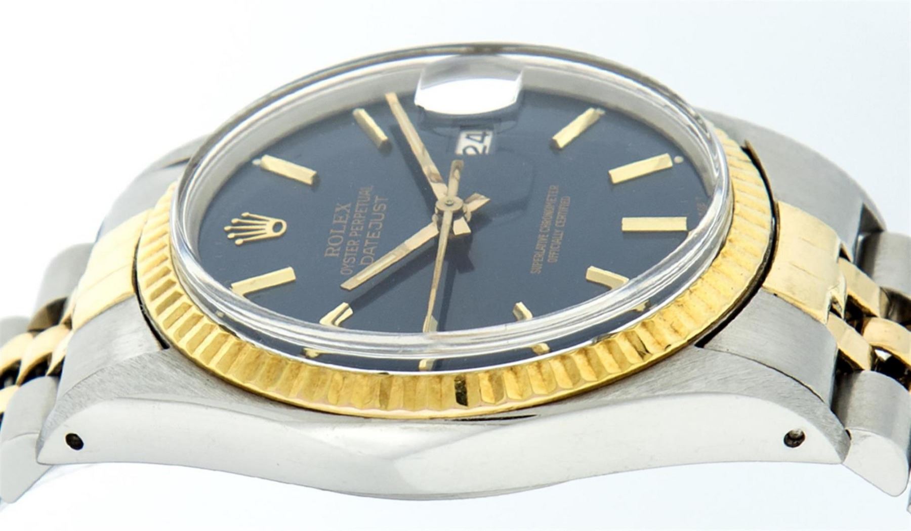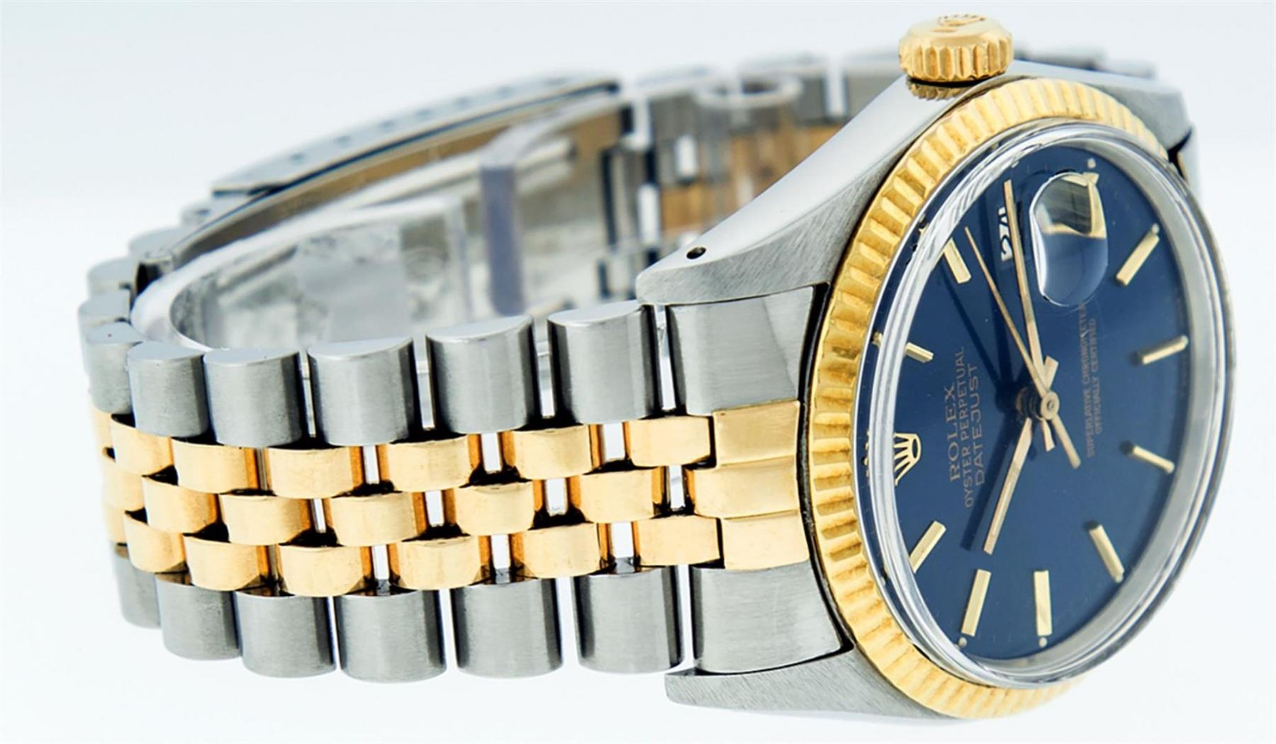 One Mens Yellow Gold Two Tone Rolex Datejust Polished, Serviced & Electronically Tested, Yellow Gold & Stainless Steel Case: 36mm, Yellow Gold Crown, Bezel: Yellow Gold Fluted Bezel. Custom Crystal: New Acrylic Cyclops Lens. Custom Hands: New Luminecent Hands. Movement: Automatic Winding Movement. Custom Dial: Blue Index Dial With Index Track. Date Window: 3 O'Clock Position Date Display, Quickset, Model: Datejust. Condition: G-6 Extra Fine. Bracelet: Two Tone Yellow Gold & Stainless Steel Jubilee. Bright Polish. 7.0 Inch Length, Adjustable. Standard Clasp, With Rolex Logo. This Watch Has Been Serviced Time Tested And Is In Excellent Condition It Is Free Of All Scratches And Dents.