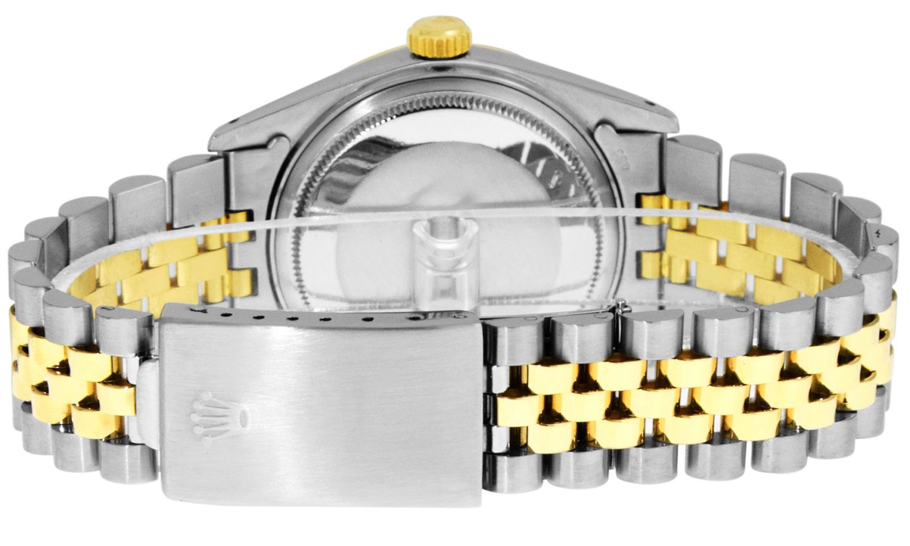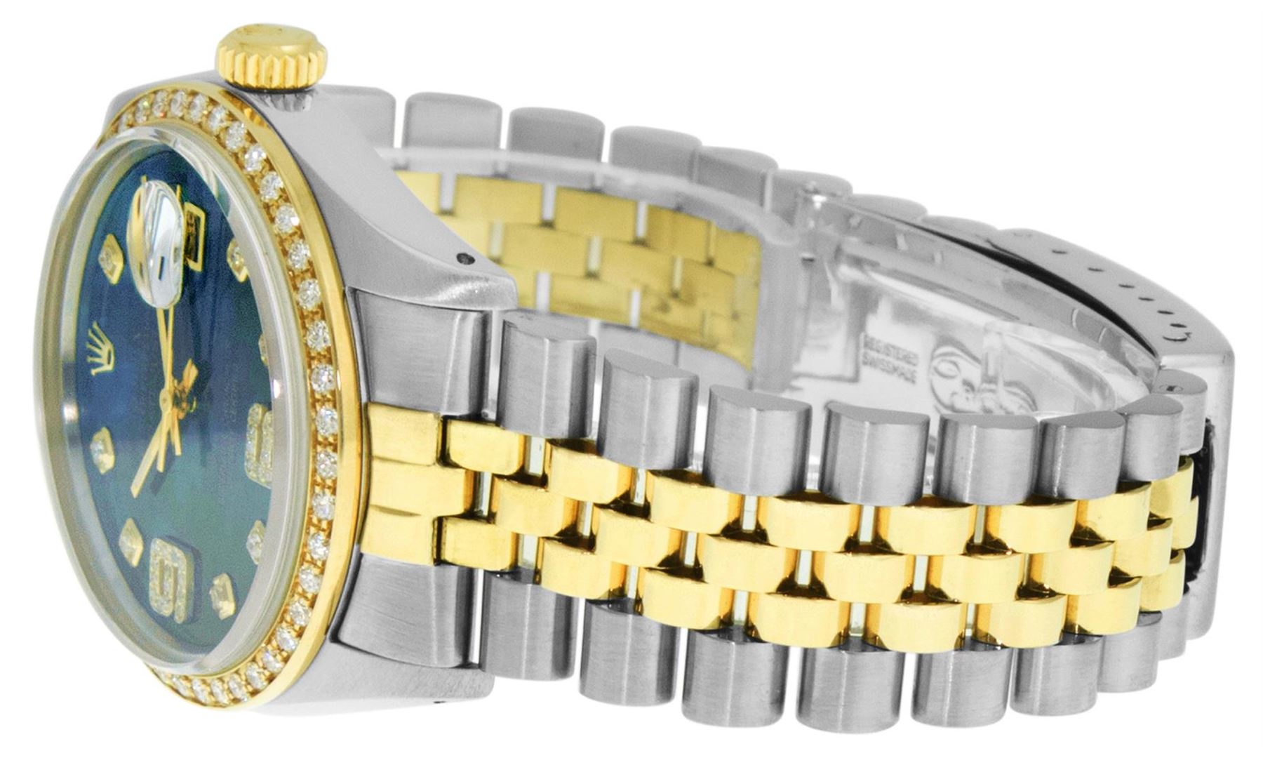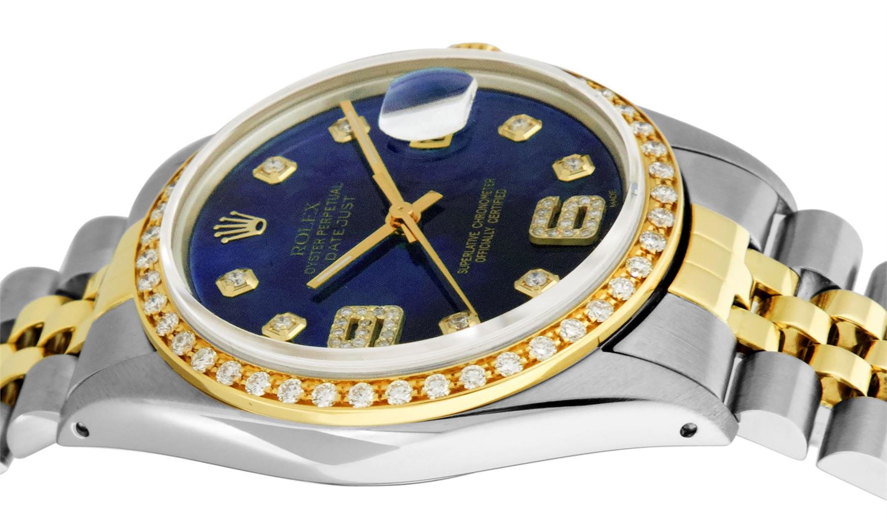One Mens Yellow Gold Two Tone Rolex Datejust Polished, Serviced & Electronically Tested, Yellow Gold & Stainless Steel Case: 36mm, Yellow Gold Crown, Custom Bezel: New 18K Yellow Gold Beadset Diamond Bezel, Diamond Count: 44 Diamonds On Bezel, Total Weight 1.00 Carat, Clarity: SI-VS, Color: G to H. Custom Crystal: New Scratch Resistant Synthetic Sapphire Cyclops Lens. Movement: Automatic Winding Movement . Custom Dial: Blue MOP Diamond Dial with 9 & 6 Diamond Hour Markers, Diamond Count: 8 Diamonds + 28 Diamonds On 6 & 9 Hour Markers, Color: G To H In Color, Clarity: SI-VS, Date Window: 3 O'Clock Position Date Display, Quickset, Model: Datejust. Condition: G-6 Extra Fine. Bracelet: Two Tone Yellow Gold & Stainless Steel Jubilee. Bright Polish. 7.0 Inch Length, Adjustable. Standard Clasp, With Rolex Logo. This Watch Has Been Serviced Time Tested And Is In Excellent Condition It Is Free Of All Scratches And Dents.