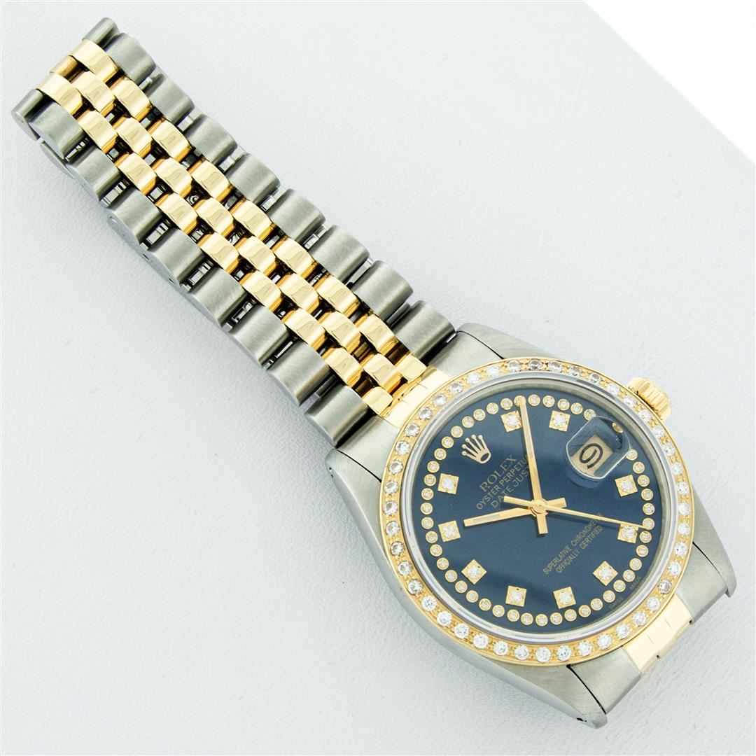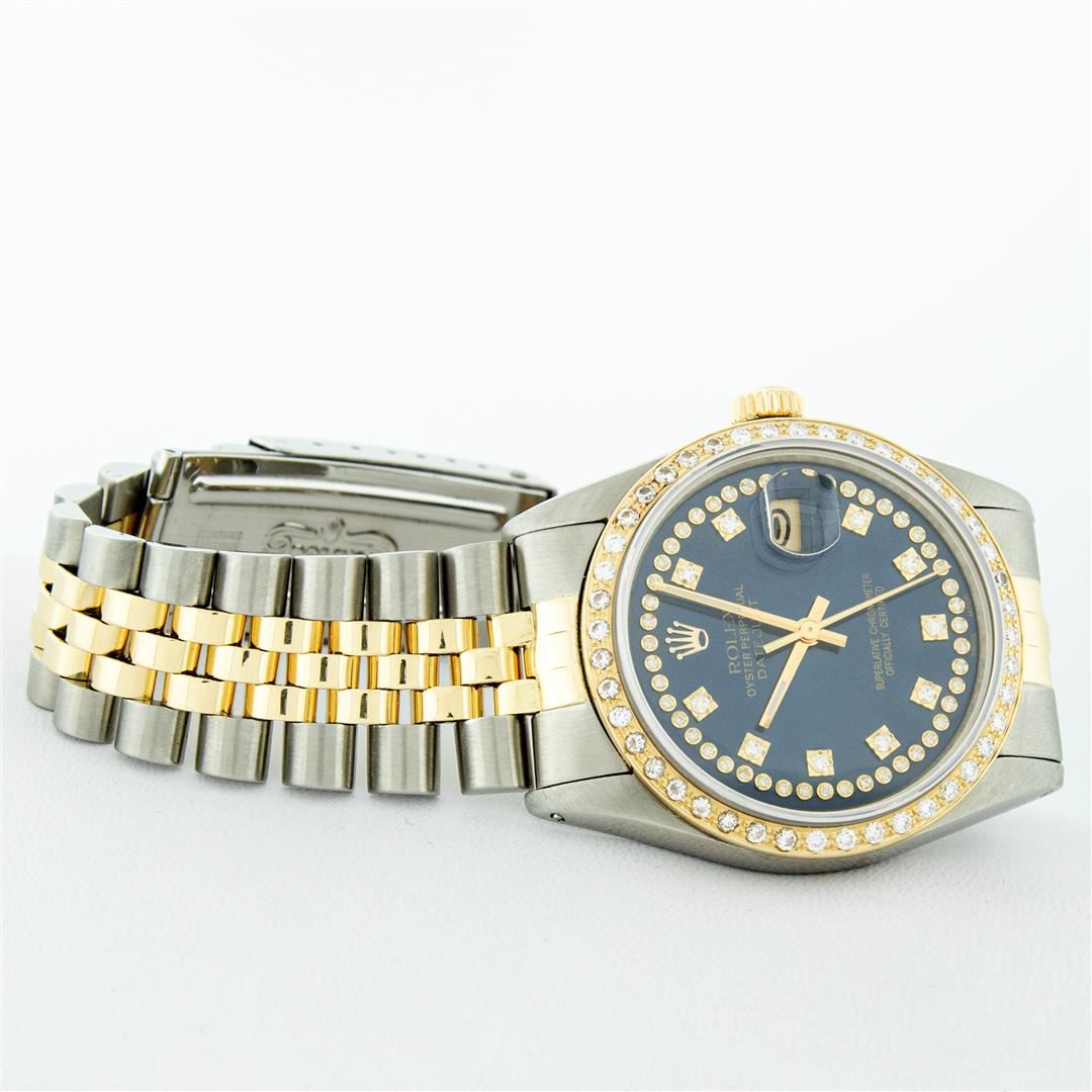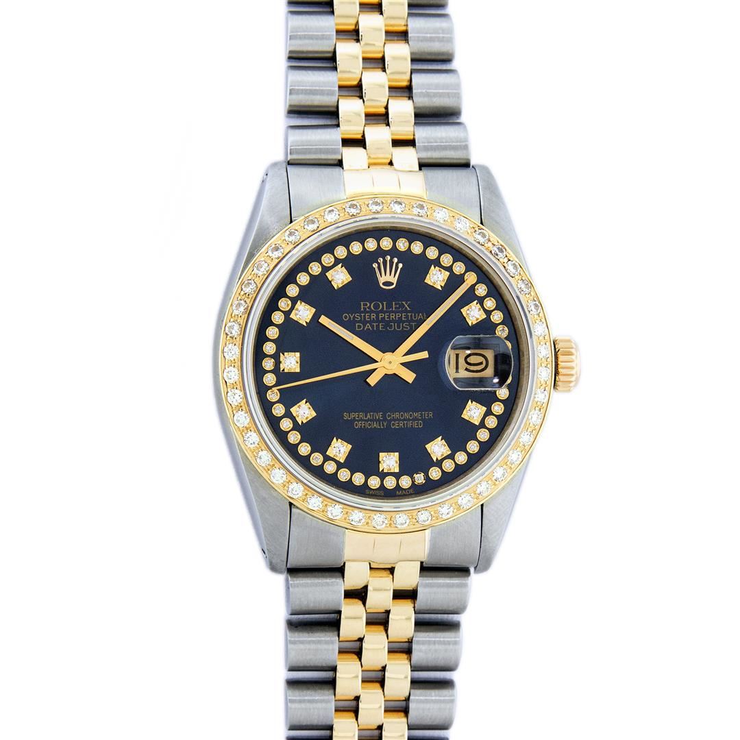 One Mens Pre Owned Yellow Gold Two Tone Rolex Datejust Polished, Serviced & Electronically Tested, Yellow Gold & Stainless Steel Case: 36mm, Yellow Gold Crown, Custom Bezel: New 18K Yellow Gold Bead set Diamond Bezel, Diamond Count: 44 Diamonds, Clarity: