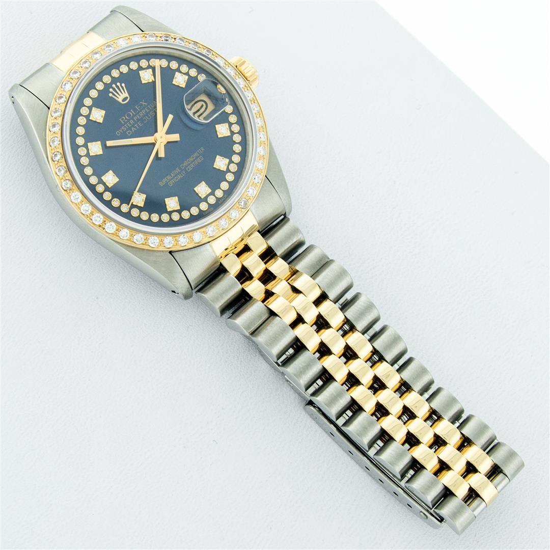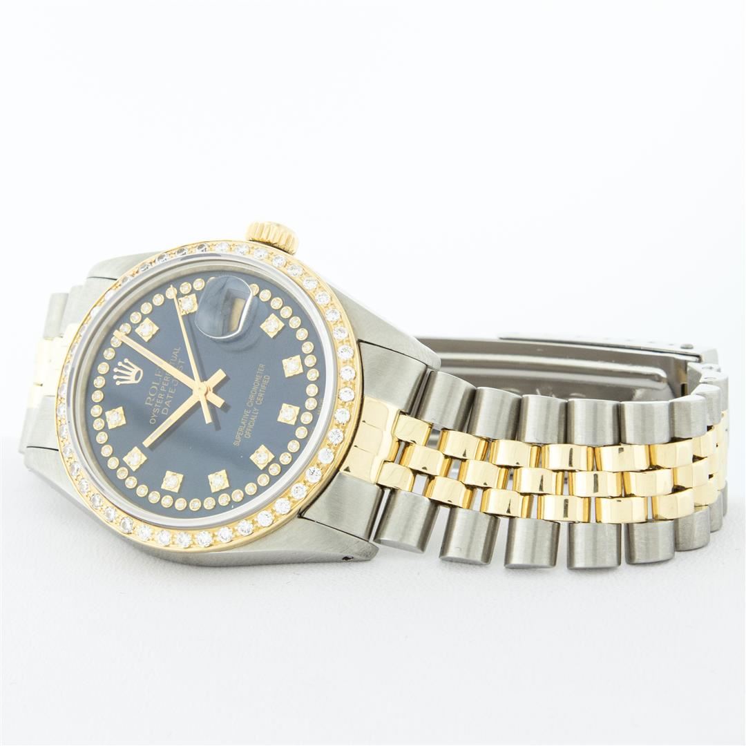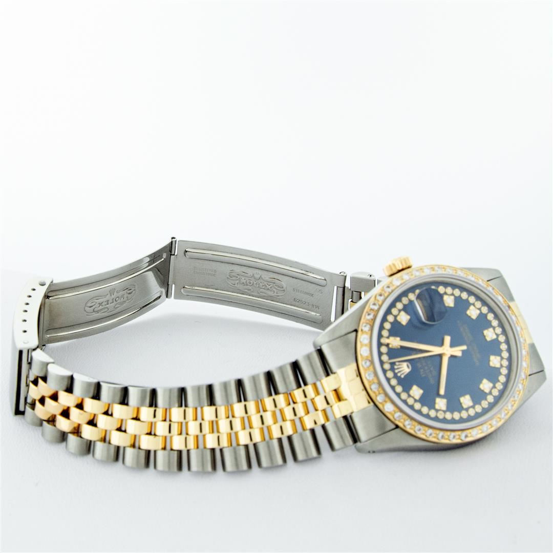 One Mens Pre Owned Yellow Gold Two Tone Rolex Datejust Polished, Serviced & Electronically Tested, Yellow Gold & Stainless Steel Case: 36mm, Yellow Gold Crown, Custom Bezel: New 18K Yellow Gold Bead set Diamond Bezel, Diamond Count: 44 Diamonds, Clarity: