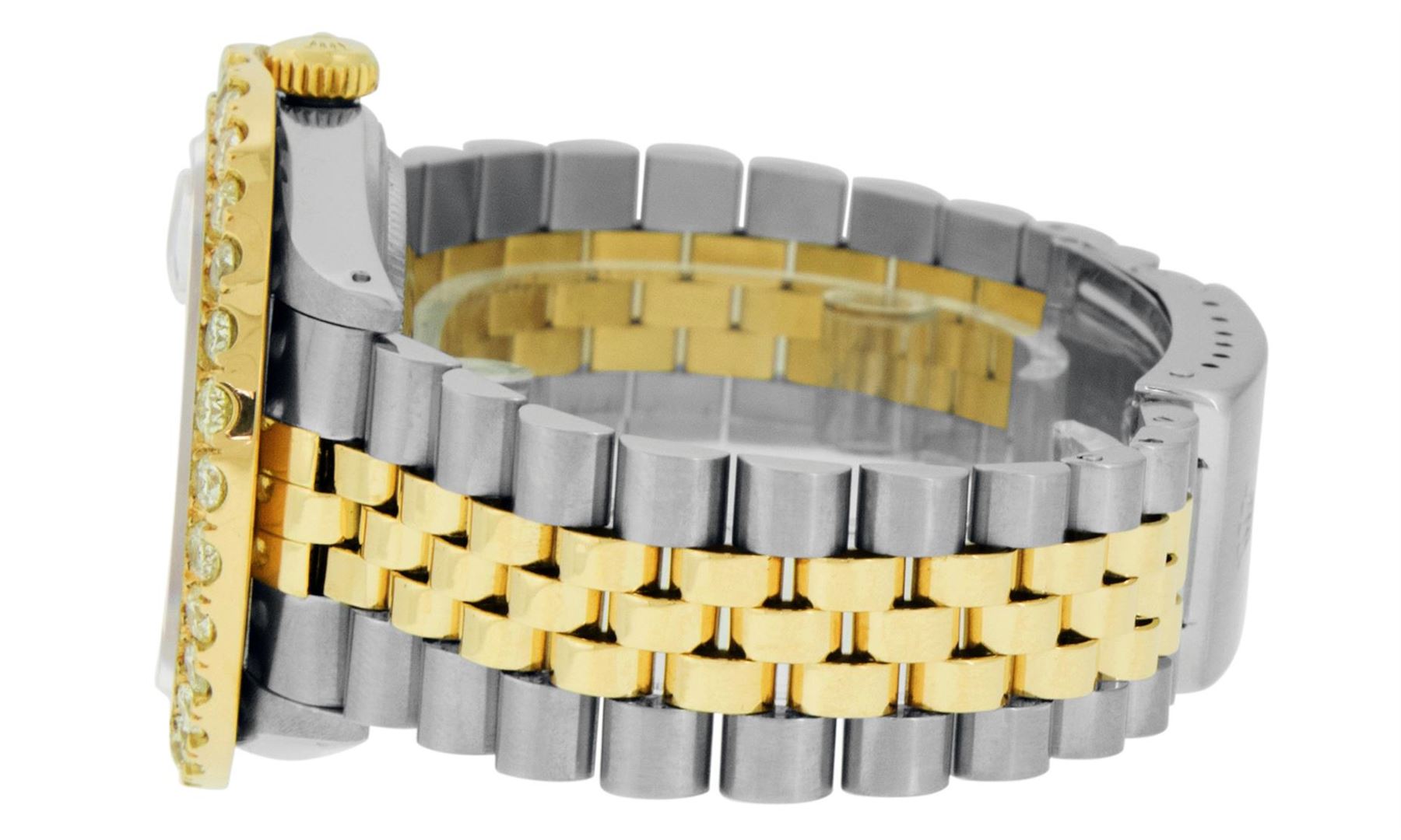 One Mens 14K Yellow Gold Rolex Datejust Polished Bright with Satin Finish, Serviced & Electronically Tested, Stainless Steel Case: 36mm, Yellow Gold Crown, Custom Bezel: New 18K Yellow Gold 4ct beadset Diamond Bezel, Diamond Count: 30 Diamonds, Total Bezel Weight 4.00 Carat, Clarity: SI-VS, Color: G to H. Custom Crystal: New Synthetic Sapphire Cyclops Lens. Custom Hands: New Luminecent Hands. Movement: Automatic Winding Movement Caliber 3035. Custom Dial: Blue Diamond Dial, Diamond Count: 8 Diamonds + 2 Roman Diamonds On Dial, Color: G to H, Clarity: VS. Date Window: 3 O'Clock Position Date Display, Quickset, Model: Datejust. Condition: G-6 Extra Fine. Bracelet: 14K Yellow Gold And Stainless Steel Jubilee Band. Bright Polish & Satin Finish. 7.0 Inch Length, Adjustable. Standard Clasp, With Rolex Logo. This Watch Has Been Serviced And Polished It Is Free Of All Scratches And Dents. This Watch Comes With A Rolex Box.