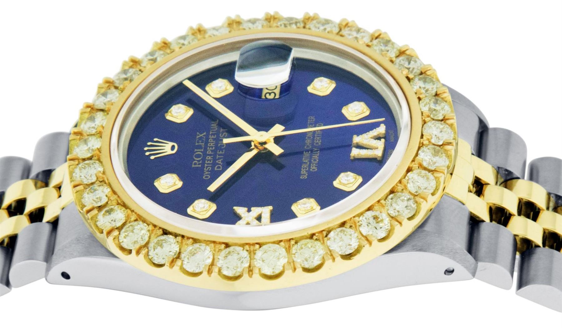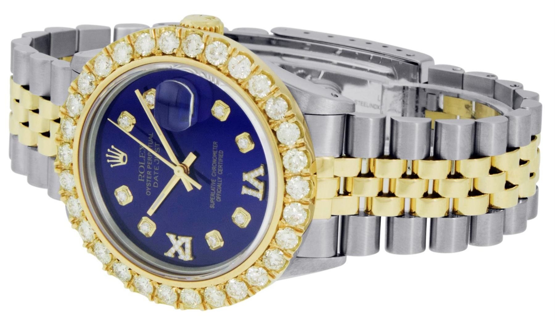 One Mens Pre Owned Yellow Gold Rolex Datejust Polished Bright with Satin Finish, Serviced & Electronically Tested, Stainless Steel Case: 36mm, Yellow Gold Crown, Custom Bezel: New 18K Yellow Gold 4ct Beadset Diamond Bezel, Diamond Count: 30 Diamonds, Tota