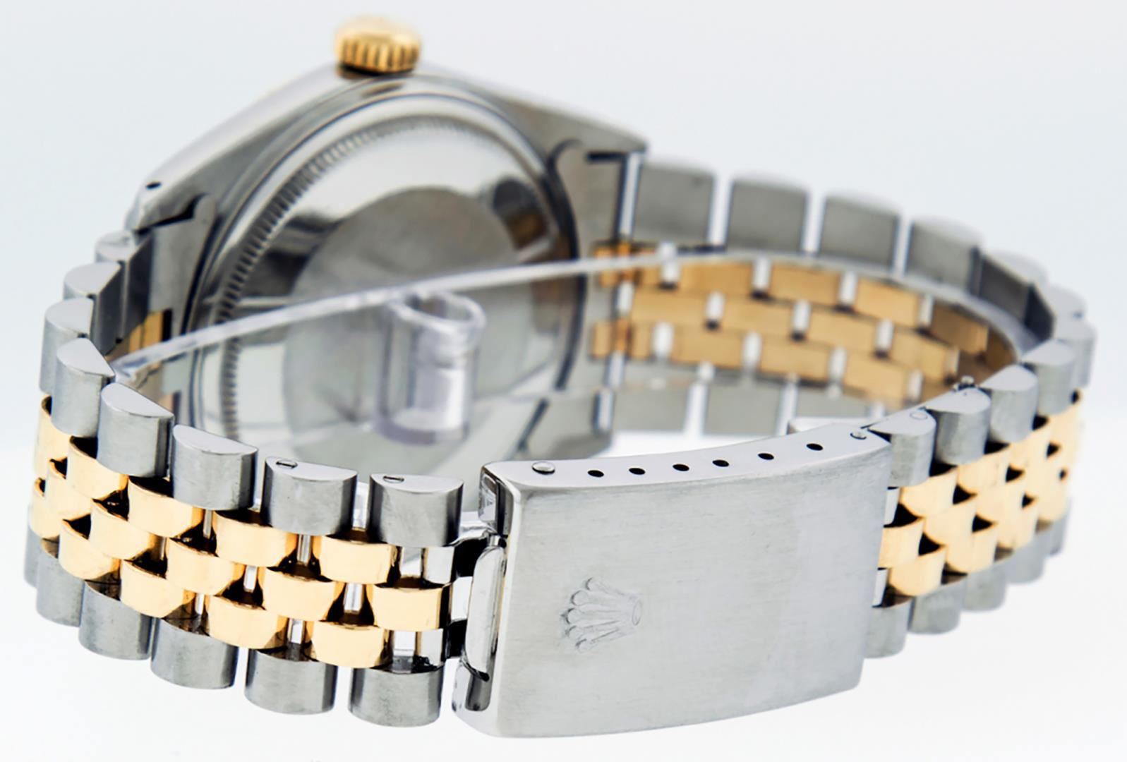 One Mens Pre Owned Yellow Gold Two Tone Rolex Datejust Polished, Serviced And Electronically Tested, Rolex Yellow Gold And Stainless Steel Case: 36mm, Rolex Yellow Gold Crown, Rolex Bezel: Yellow Gold Fluted Bezel. Custom Crystal: New Acrylic With Magnified Date Window. Custom Hands: New Luminecent Hands. Rolex Movement: Automatic Winding Movement 3035. Custom Dial: Custom Blue Vignette Dial With Added Diamond Hour Markers, Diamond Count: 10 Diamonds. Date Window: 3 O'Clock Position Date Display, Quickset, Model: Quickset Datejust. Condition: G-6 Extra Fine. Rolex Bracelet: Two Tone Yellow Gold And Stainless Steel Jubilee. Bright Polish. 7.0 Inch Length, Adjustable. Standard Clasp, With Rolex Logo. This Watch Has Been Serviced And Polished It Is Free Of All Scratches And Dents.