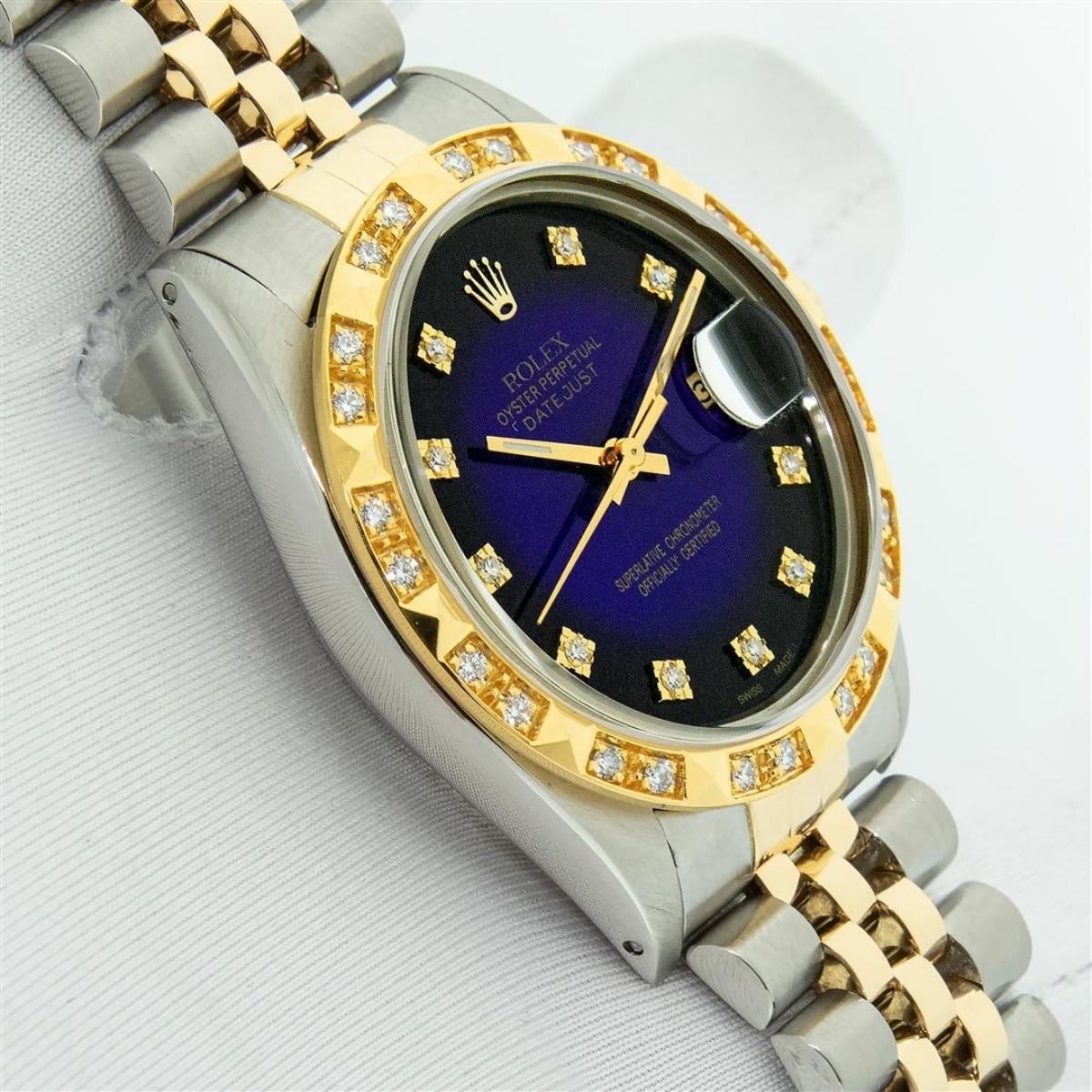 One Mens Yellow Gold Rolex Datejust Polished Bright with Satin Finish, Serviced & Electronically Tested, Stainless Steel Case: 36mm, Yellow Gold Crown, Custom Bezel: New 18K Yellow Gold Pyramid Diamond Bezel, Diamond Count: 24 Diamonds In Bezel, Total Weight 0.75 Carat, Clarity: SI-VS, Color: G to H. Custom Crystal: New Scratch Resistent Synthetic Sapphire Cyclops Lens. Custom Hands: New Luminecent Hands. Movement: Automatic Winding Movement. Custom Dial: Blue Vignette String Diamond Dial, Diamond Count: 10 Diamonds In Dial, Color: G to H, Clarity: VS. Date Window: 3 O'Clock Position Date Display, Quickset, Model: Datejust. Condition: G-6 Extra Fine. Bracelet: Yellow Gold And Stainless Steel Jubilee Band. Bright Polish & Satin Finish. 7.0 Inch Length, Adjustable. Standard Clasp, With Rolex Logo. This Watch Has Been Serviced And Polished It Is Free Of All Scratches And Dents. This Watch Comes With A Rolex Box.