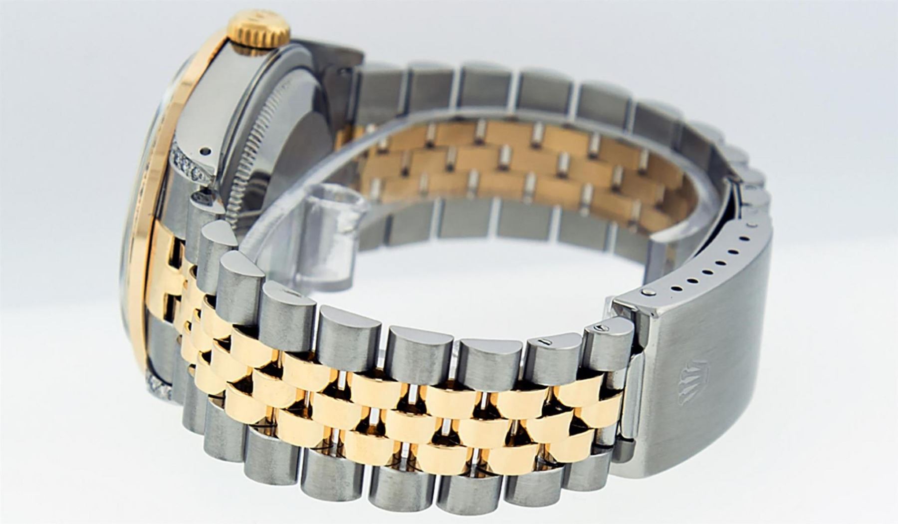 One Mens Yellow Gold & Stainless Steel Datejust Polished Bright with Satin Finish, Serviced & Electronically Tested, Stainless Steel Case: 36mm, Custom Diamond Lugs: 28 Diamonds On Lugs, Color: G to H, Clarity: SI-VS. Yellow Gold Crown, Custom Bezel: New 18K Yellow Gold Beadset Diamond Bezel, Diamond Count: 44 Diamonds, Total Weight 1.00 Carat, Clarity: SI-VS, Color: G to H. Custom Crystal: New Scratch Resistant Synthetic Sapphire Cyclops Lens. Custom Hands: New Luminecent Hands. Movement: Automatic Winding Movement. Custom Dial: Blue Vignette Single Cut String Diamond Dial, Stone Count: 58 Diamonds In Dial, Color: G to H, Clarity: VS2. Date Window: 3 O'Clock Position Date Display, Quickset, Model: Datejust. Condition: G-6 Extra Fine. Bracelet: Yellow Gold And Stainless Steel Jubilee Band. Bright Polish & Satin Finish. 7.0 Inch Length, Adjustable. Standard Clasp, With Rolex Logo. This Watch Has Been Serviced And Polished It Is Free Of All Scratches And Dents.