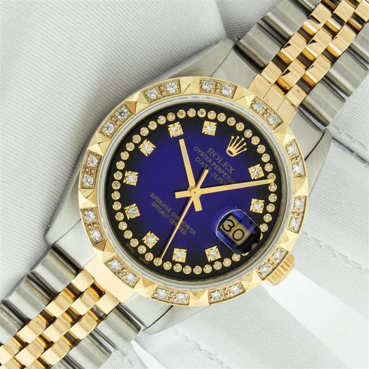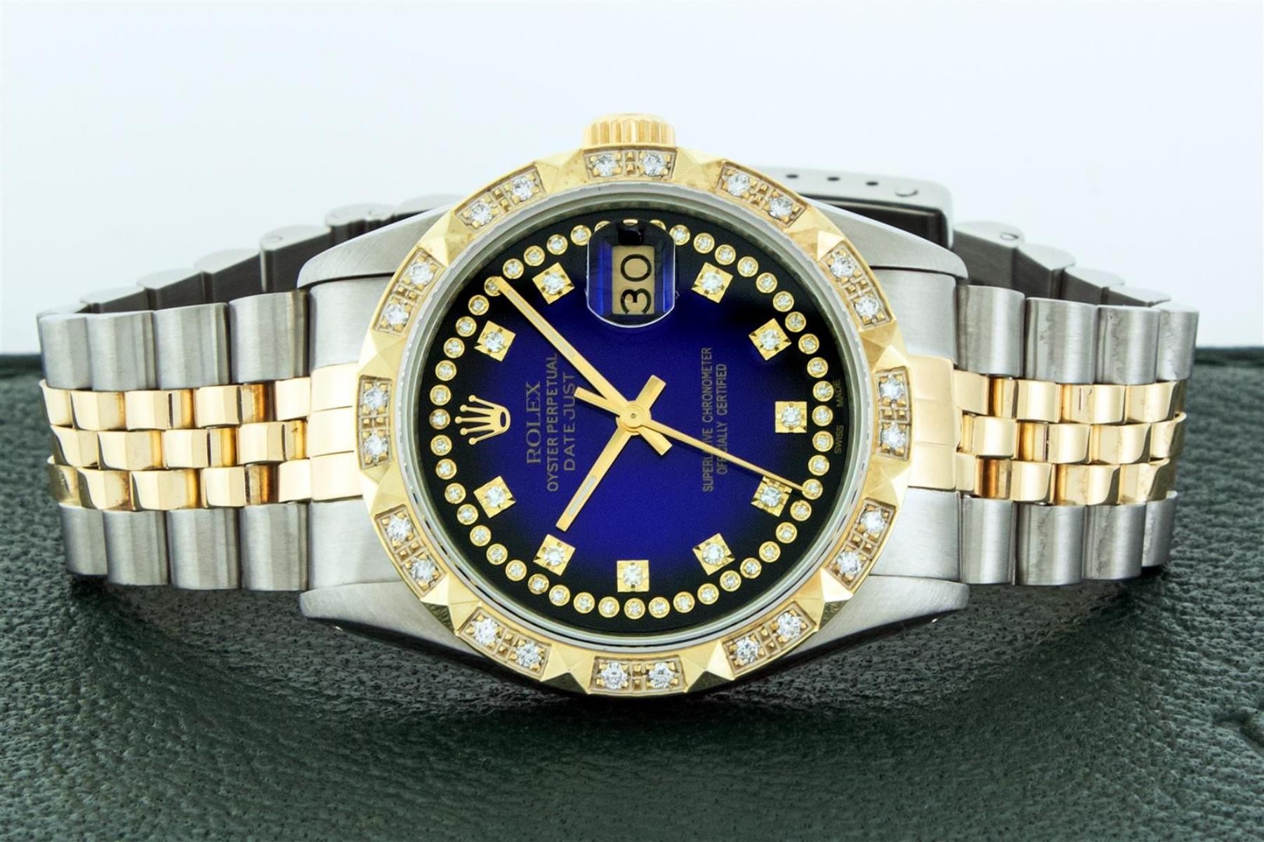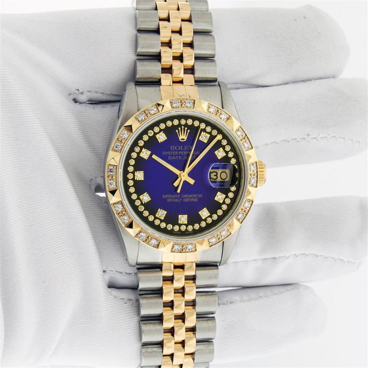 One Mens Yellow Gold Rolex Datejust Polished Bright with Satin Finish, Serviced & Electronically Tested, Stainless Steel Case: 36mm, Yellow Gold Crown, Custom Bezel: New 18K Yellow Gold Pyramid Diamond Bezel, Diamond Count: 24 Diamonds, Total Weight .75 Carat, Clarity: SI-VS, Color: G to H. Custom Crystal: New Synthetic Sapphire Cyclops Lens. Custom Hands: New Luminecent Hands. Movement: Automatic Winding Movement. Custom Dial: Blue Vignette String Diamond Dial, Diamond Count: 58 Diamonds In Dial, Color: G to H, Clarity: VS. Date Window: 3 O'Clock Position Date Display, Quickset, Model: Datejust. Condition: G-6 Extra Fine. Bracelet: Yellow Gold And Stainless Steel Jubilee Band. Bright Polish & Satin Finish. 7.0 Inch Length, Adjustable. Standard Clasp, With Rolex Logo. This Watch Has Been Serviced And Polished It Is Free Of All Scratches And Dents. This Watch Comes With A Rolex Box.