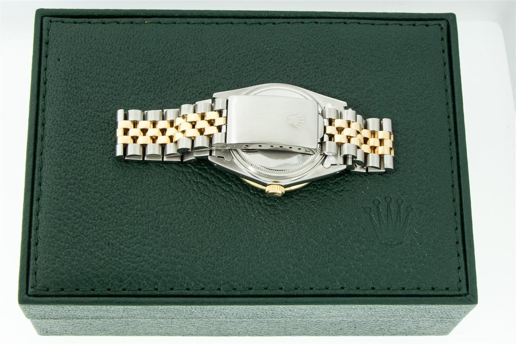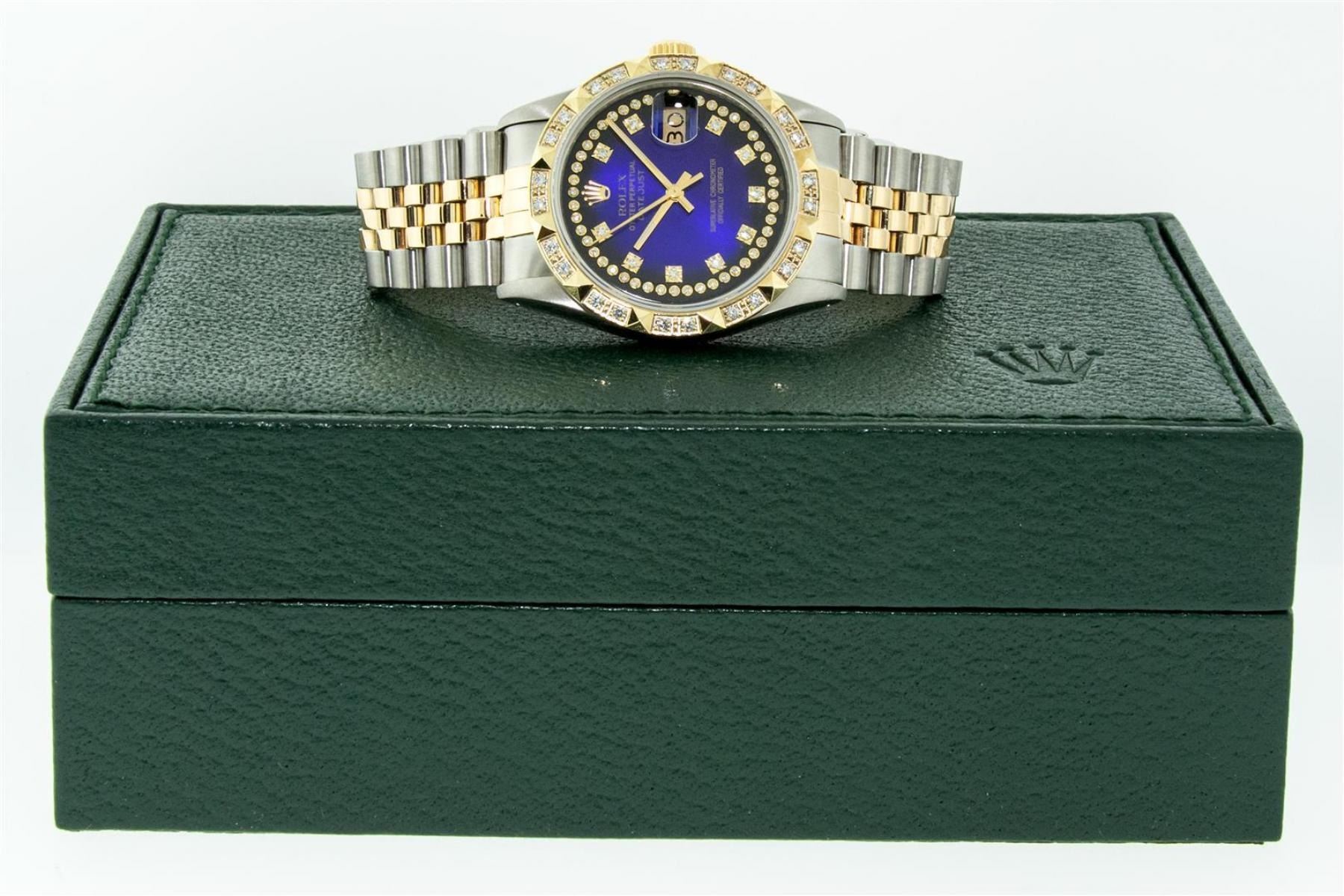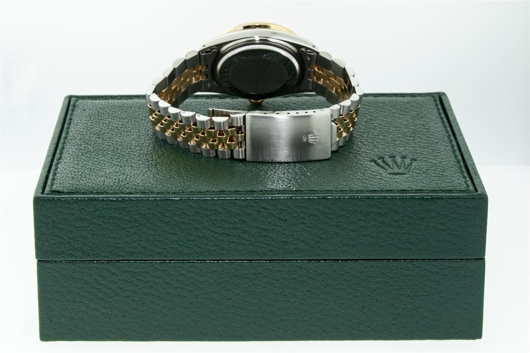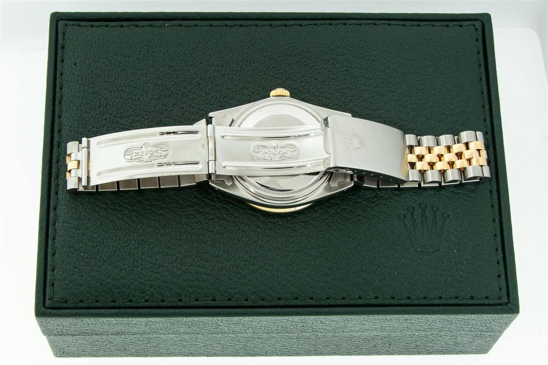 One Mens Yellow Gold Rolex Datejust Polished Bright with Satin Finish, Serviced & Electronically Tested, Stainless Steel Case: 36mm, Yellow Gold Crown, Custom Bezel: New 18K Yellow Gold Pyramid Diamond Bezel, Diamond Count: 24 Diamonds, Total Weight .75 Carat, Clarity: SI-VS, Color: G to H. Custom Crystal: New Synthetic Sapphire Cyclops Lens. Custom Hands: New Luminecent Hands. Movement: Automatic Winding Movement. Custom Dial: Blue Vignette String Diamond Dial, Diamond Count: 58 Diamonds In Dial, Color: G to H, Clarity: VS. Date Window: 3 O'Clock Position Date Display, Quickset, Model: Datejust. Condition: G-6 Extra Fine. Bracelet: Yellow Gold And Stainless Steel Jubilee Band. Bright Polish & Satin Finish. 7.0 Inch Length, Adjustable. Standard Clasp, With Rolex Logo. This Watch Has Been Serviced And Polished It Is Free Of All Scratches And Dents. This Watch Comes With A Rolex Box.