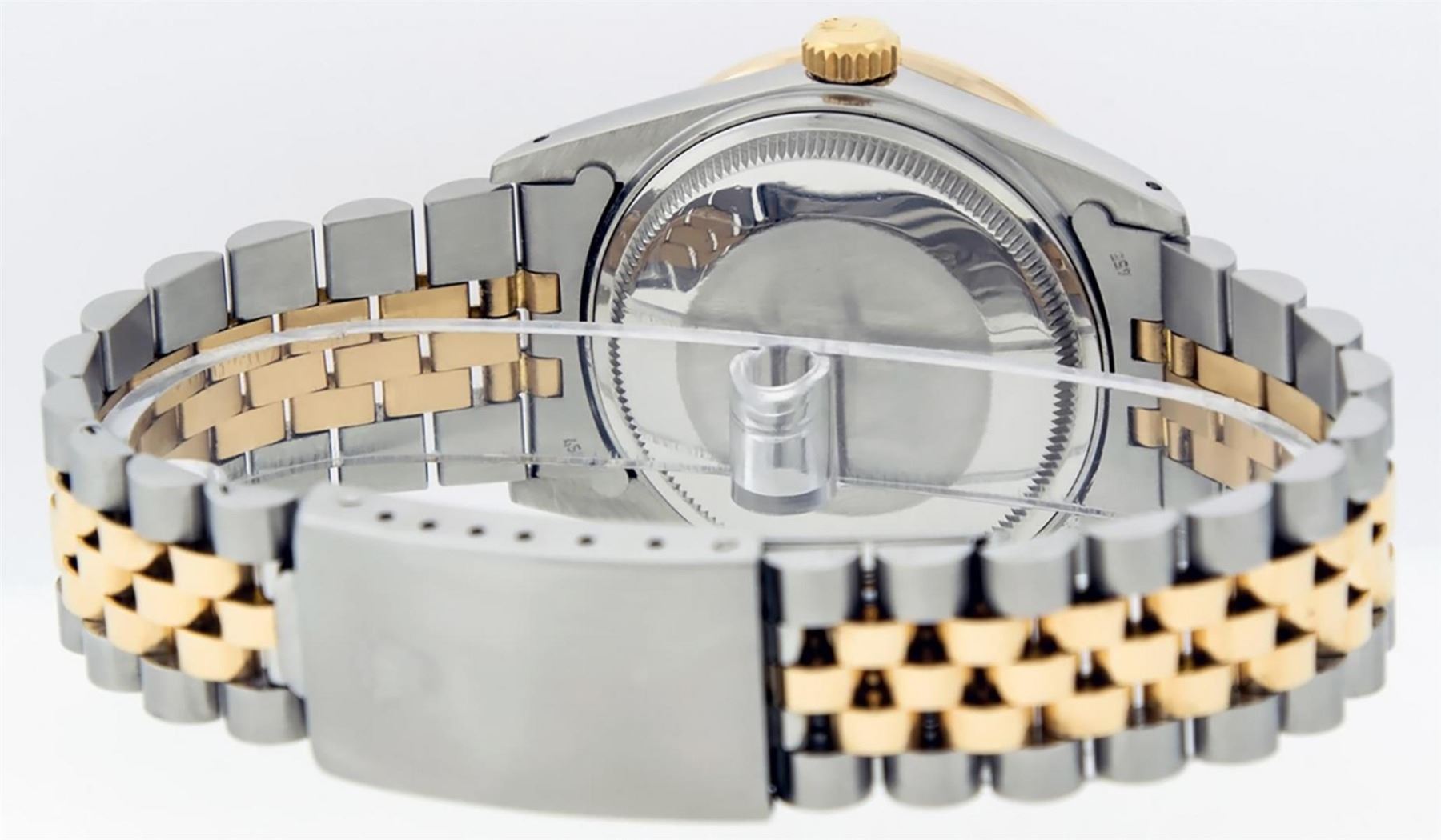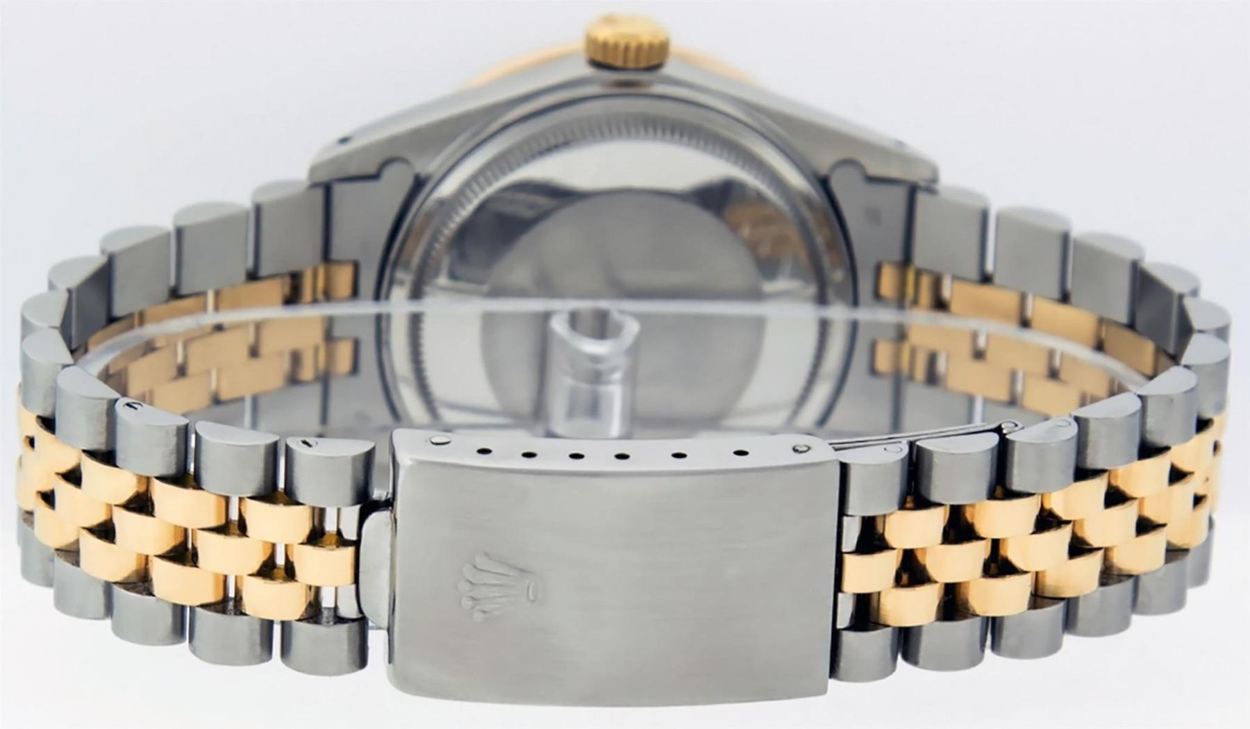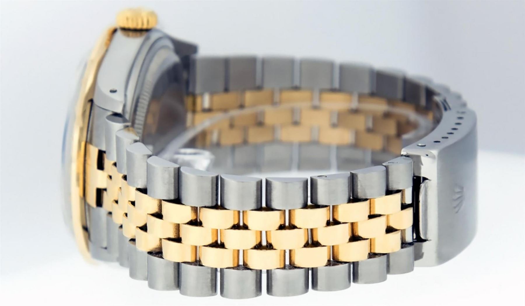 One Mens Yellow Gold Rolex Datejust Polished Bright with Satin Finish, Serviced & Electronically Tested, Stainless Steel Case: 36mm, Yellow Gold Crown, Custom Bezel: New 18K Yellow Gold Pyramid Diamond Bezel, Diamond Count: 24 Diamonds, Total Weight .75 Carat, Clarity: SI-VS, Color: G to H. Custom Crystal: New Scratch Resistant Synthetic Sapphire Cyclops Lens. Custom Hands: New Luminecent Hands. Movement: Automatic Winding Movement. Custom Dial: Blue Vignette String Diamond Dial, Diamond Count: 58 Diamonds In Dial, Color: G to H, Clarity: VS. Date Window: 3 O'Clock Position Date Display, Quickset, Model: Datejust. Condition: G-6 Extra Fine. Bracelet: Yellow Gold And Stainless Steel Jubilee Band. Bright Polish & Satin Finish. 7.0 Inch Length, Adjustable. Standard Clasp, With Rolex Logo. This Watch Has Been Serviced And Polished It Is Free Of All Scratches And Dents.