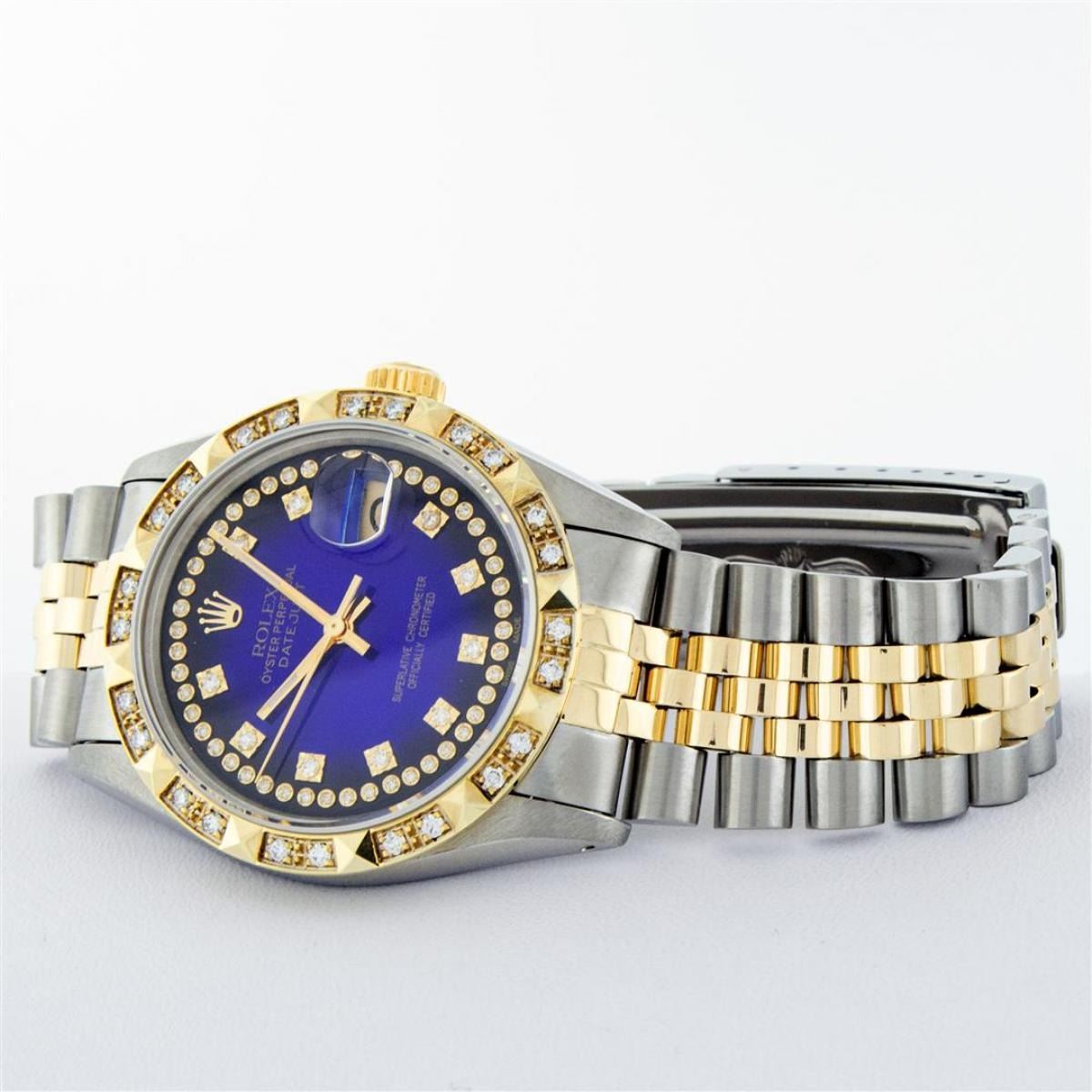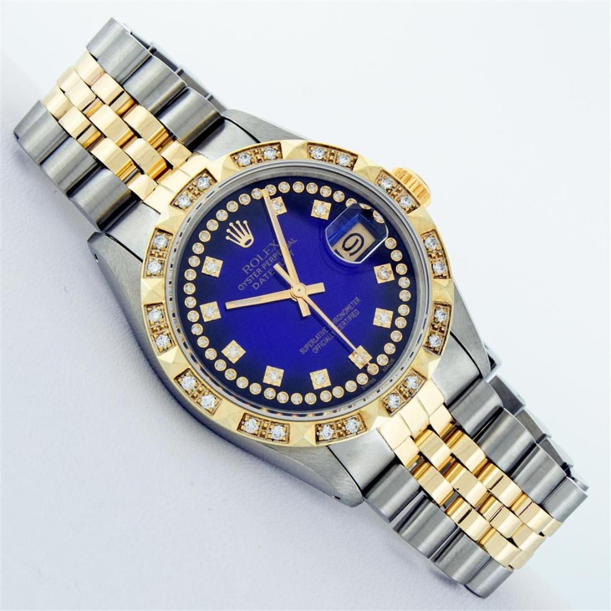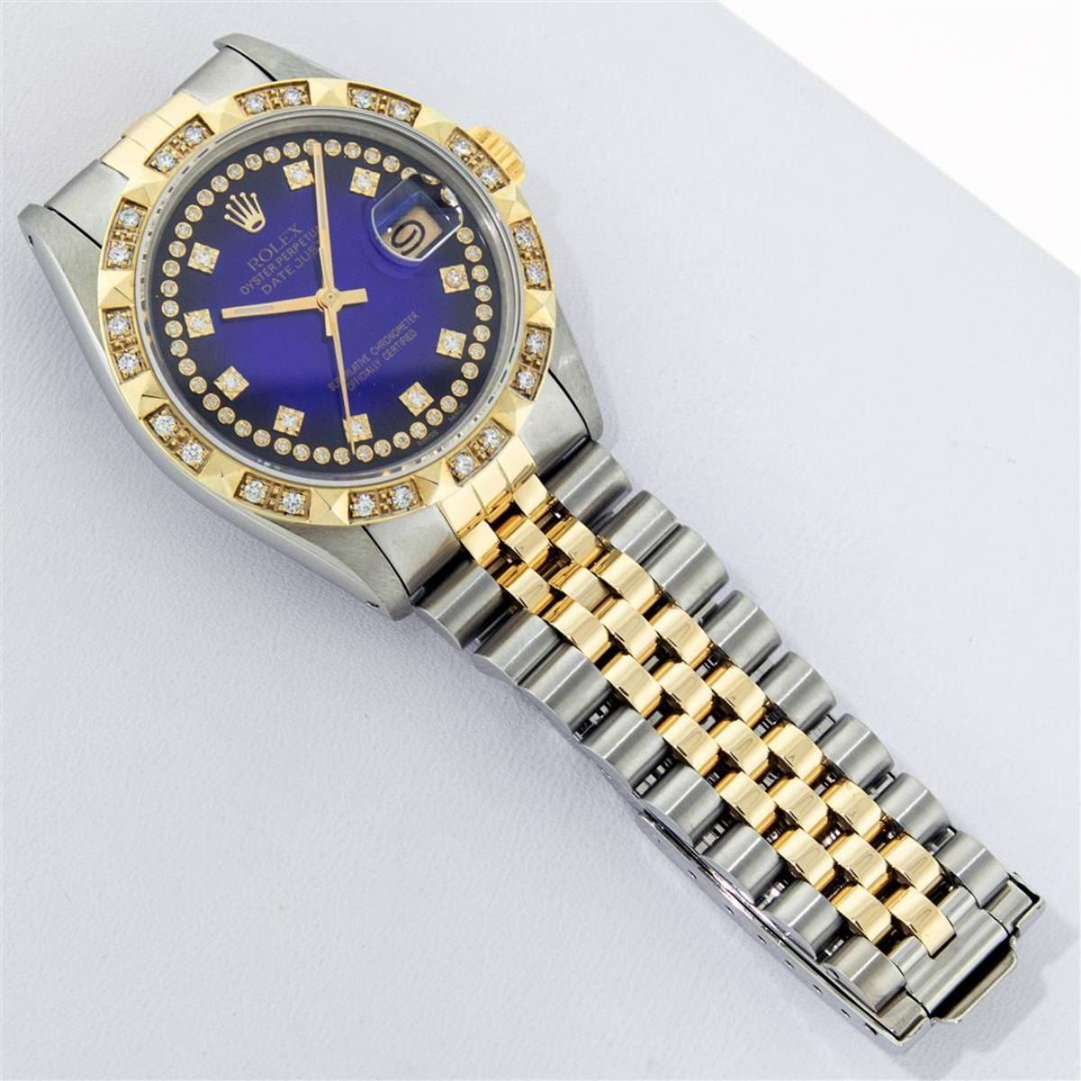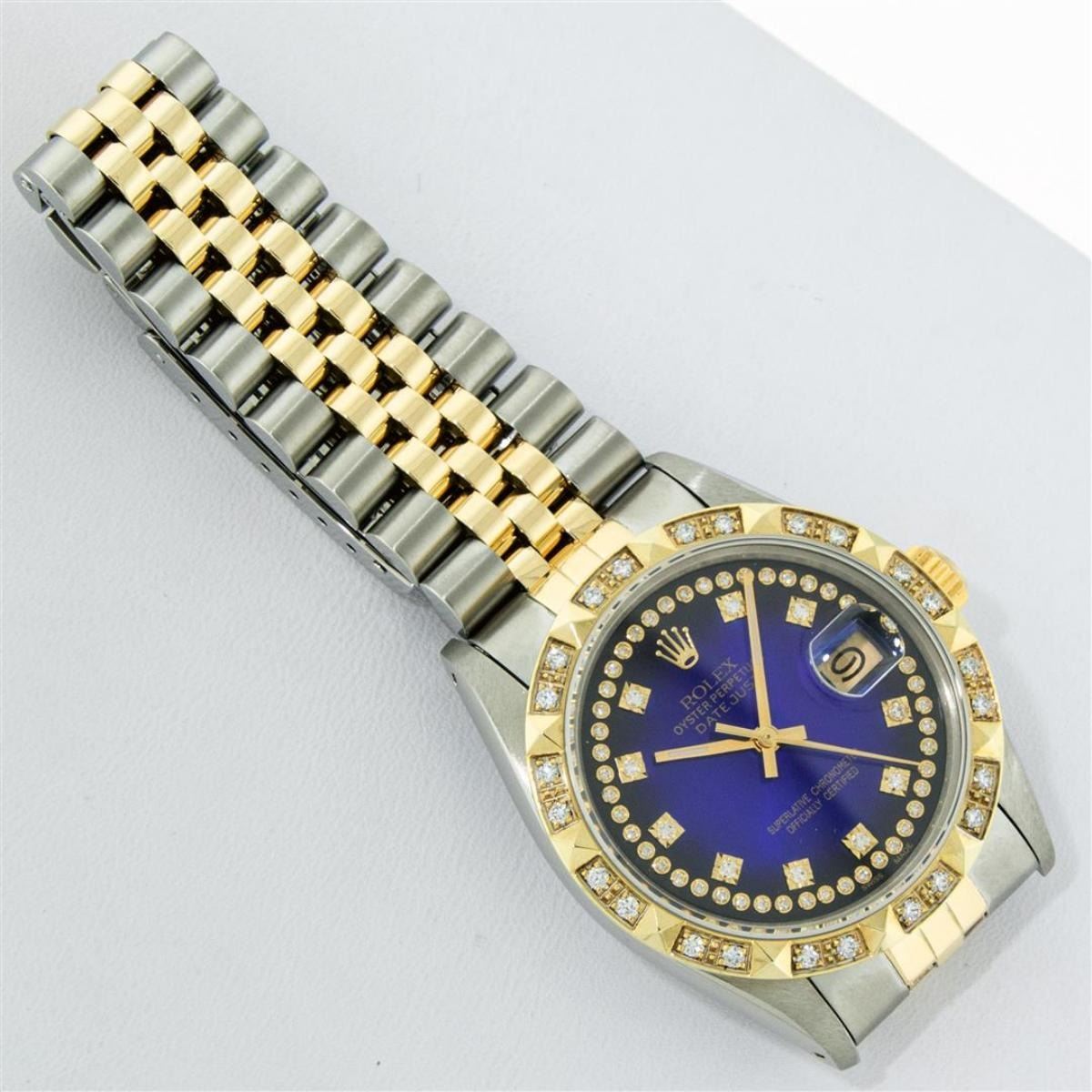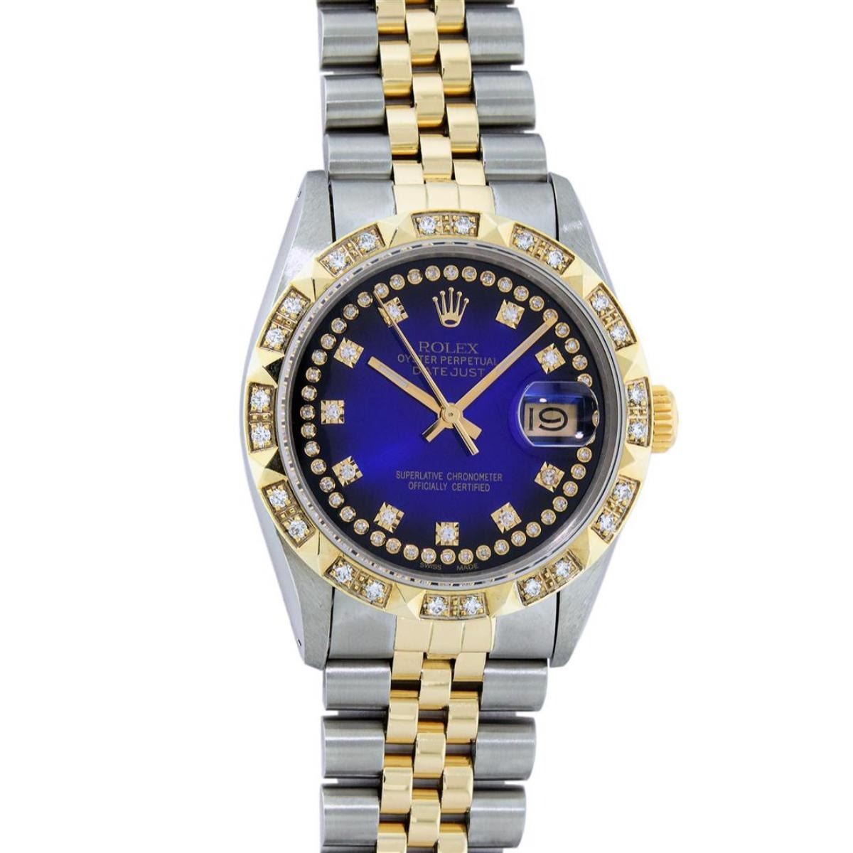One Mens Yellow Gold Rolex Datejust Polished Bright with Satin Finish, Serviced & Electronically Tested, Stainless Steel Case: 36mm, Yellow Gold Crown, Custom Bezel: New 18K Yellow Gold Pyramid Diamond Bezel, Diamond Count: 24 Diamonds, Total Weight .75 Carat, Clarity: SI-VS, Color: G to H. Custom Crystal: New Synthetic Sapphire Cyclops Lens. Custom Hands: New Luminecent Hands. Movement: Automatic Winding Movement. Custom Dial: Blue Vignette String Diamond Dial, Diamond Count: 58 Diamonds In Dial, Color: G to H, Clarity: VS. Date Window: 3 O'Clock Position Date Display, Quickset, Model: Datejust. Condition: G-6 Extra Fine. Bracelet: Yellow Gold And Stainless Steel Jubilee Band. Bright Polish & Satin Finish. 7.0 Inch Length, Adjustable. Standard Clasp, With Rolex Logo. This Watch Has Been Serviced And Polished It Is Free Of All Scratches And Dents.