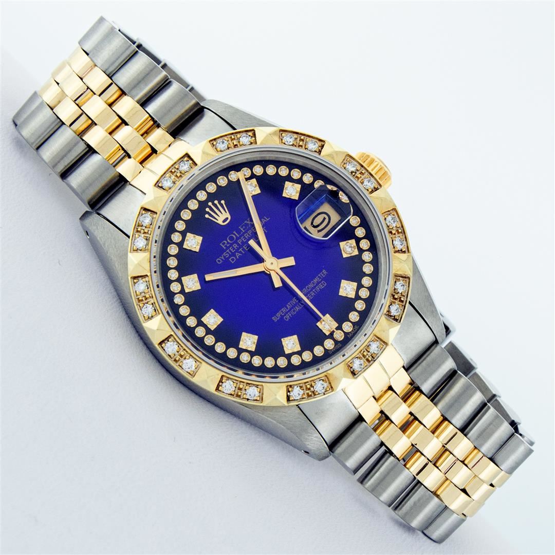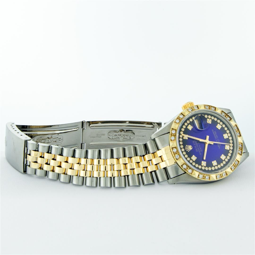 One Mens Pre Owned Yellow Gold Rolex Datejust Polished Bright with Satin Finish, Serviced & Electronically Tested, Rolex Stainless Steel Case: 36mm, Yellow Gold Crown, Custom Bezel: New 18K Yellow Gold Pyramid Diamond Bezel, Diamond Count: 24 Diamonds, Total Weight .75 Carat, Clarity: SI-VS, Color: G to H. Custom Crystal: New Sapphire Magnified Lens. Custom Hands: New Luminescent Hands. Rolex Movement: Automatic Winding Movement. Custom Dial: Refinished Blue Vignette With Custom Diamonds, Diamond Count: 58 Diamonds In Dial, Color: G to H, Clarity: VS. Date Window: 3 O'Clock Position Date Display, Quickset, Model: Datejust. Condition: G-6 Extra Fine. Rolex Bracelet: Yellow Gold And Stainless Steel Jubilee Band. Bright Polish & Satin Finish. 7.0 Inch Length, Adjustable. Standard Clasp, With Rolex Logo. This Watch Has Been Serviced And Polished It Is Free Of All Scratches And Dents. This Watch Comes With A Rolex Box.