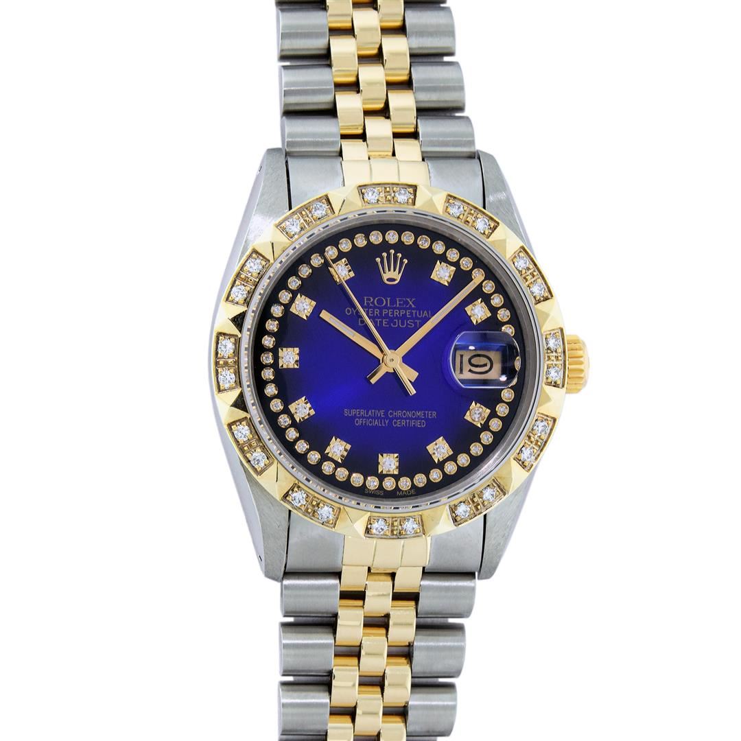 One Mens Pre Owned Yellow Gold Rolex Datejust Polished Bright with Satin Finish, Serviced & Electronically Tested, Rolex Stainless Steel Case: 36mm, Yellow Gold Crown, Custom Bezel: New 18K Yellow Gold Pyramid Diamond Bezel, Diamond Count: 24 Diamonds, Total Weight .75 Carat, Clarity: SI-VS, Color: G to H. Custom Crystal: New Sapphire Magnified Lens. Custom Hands: New Luminescent Hands. Rolex Movement: Automatic Winding Movement. Custom Dial: Refinished Blue Vignette With Custom Diamonds, Diamond Count: 58 Diamonds In Dial, Color: G to H, Clarity: VS. Date Window: 3 O'Clock Position Date Display, Quickset, Model: Datejust. Condition: G-6 Extra Fine. Rolex Bracelet: Yellow Gold And Stainless Steel Jubilee Band. Bright Polish & Satin Finish. 7.0 Inch Length, Adjustable. Standard Clasp, With Rolex Logo. This Watch Has Been Serviced And Polished It Is Free Of All Scratches And Dents. This Watch Comes With A Rolex Box.