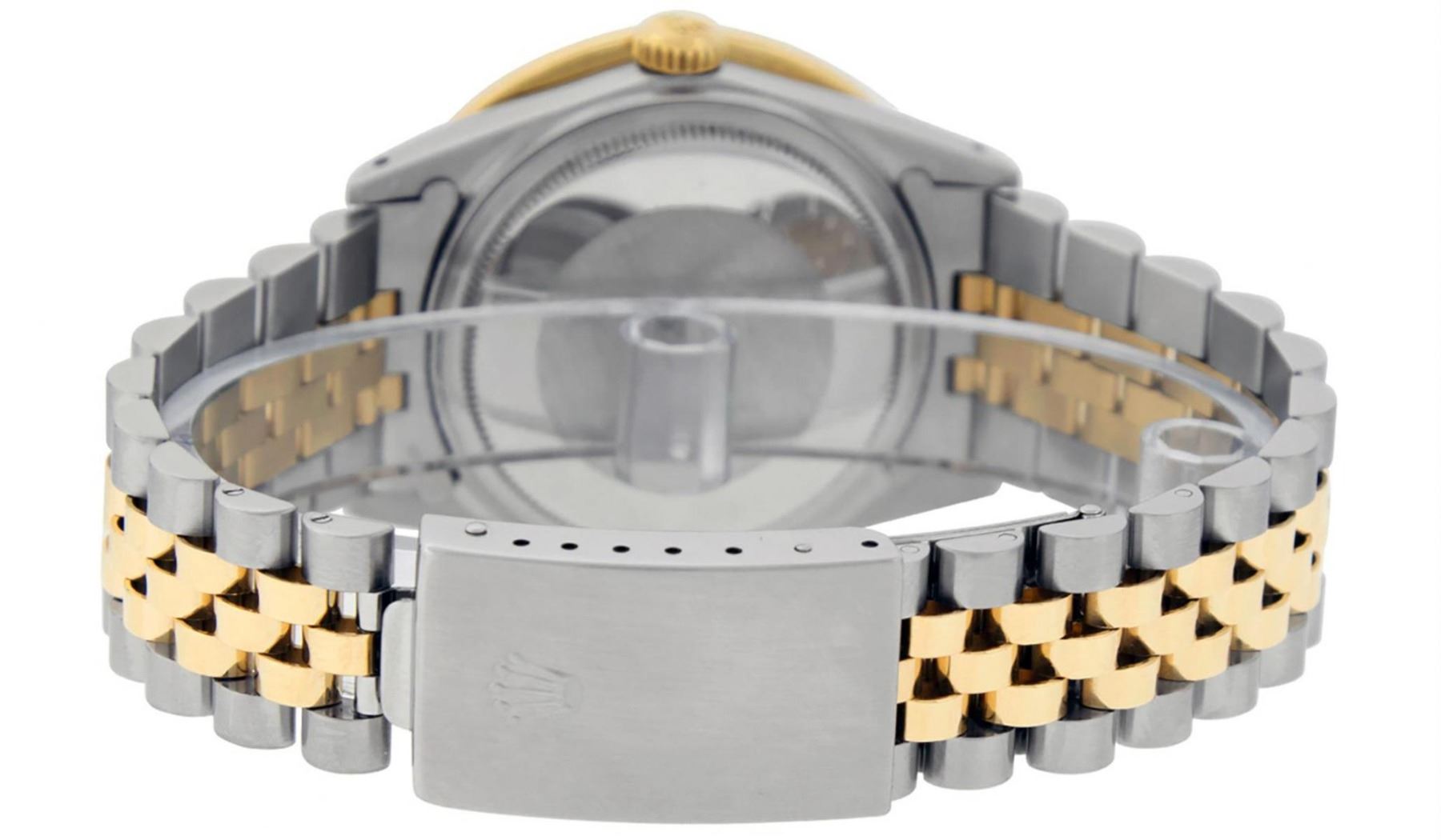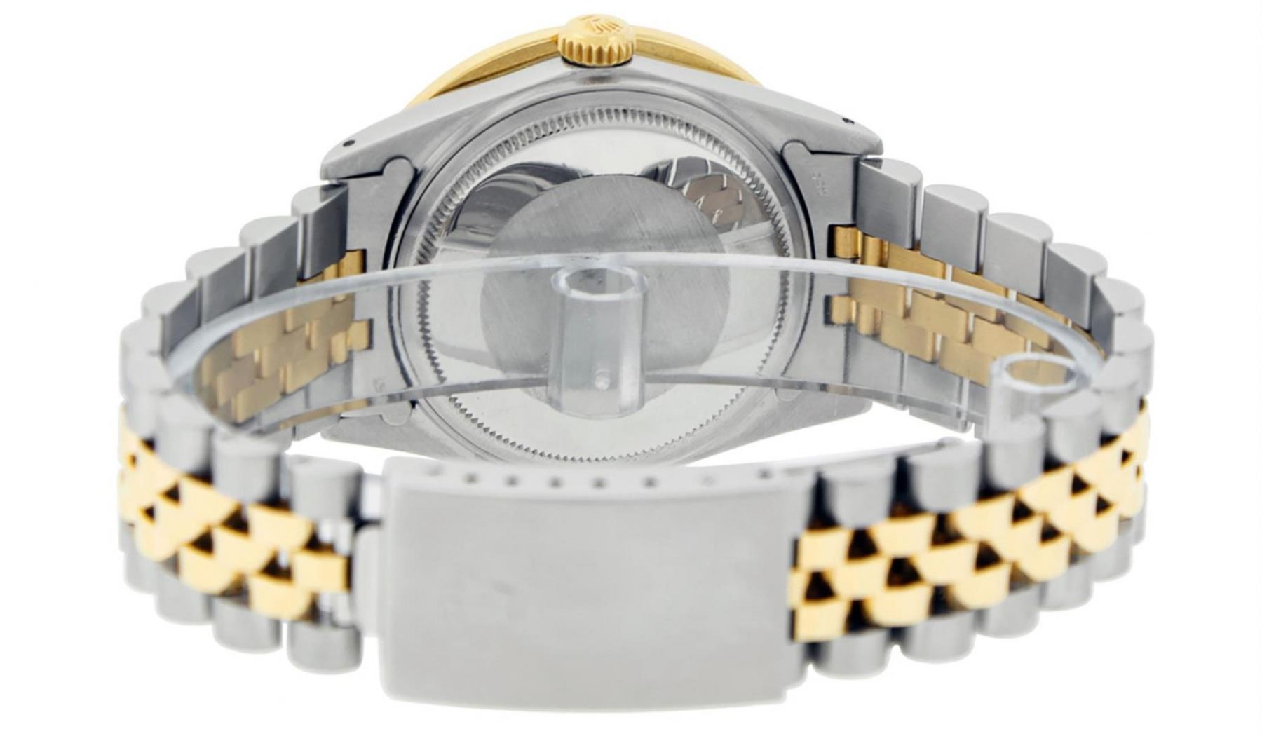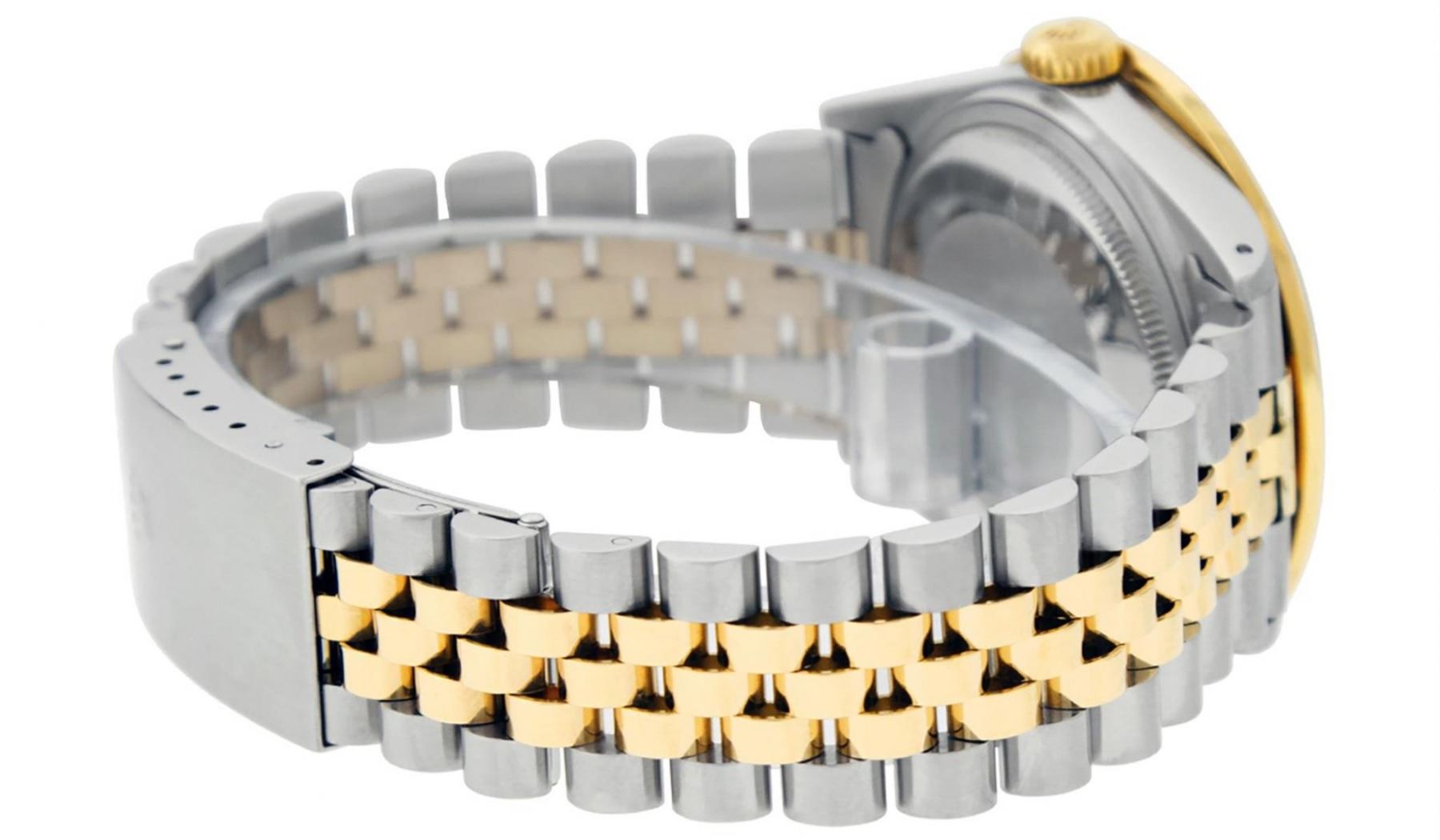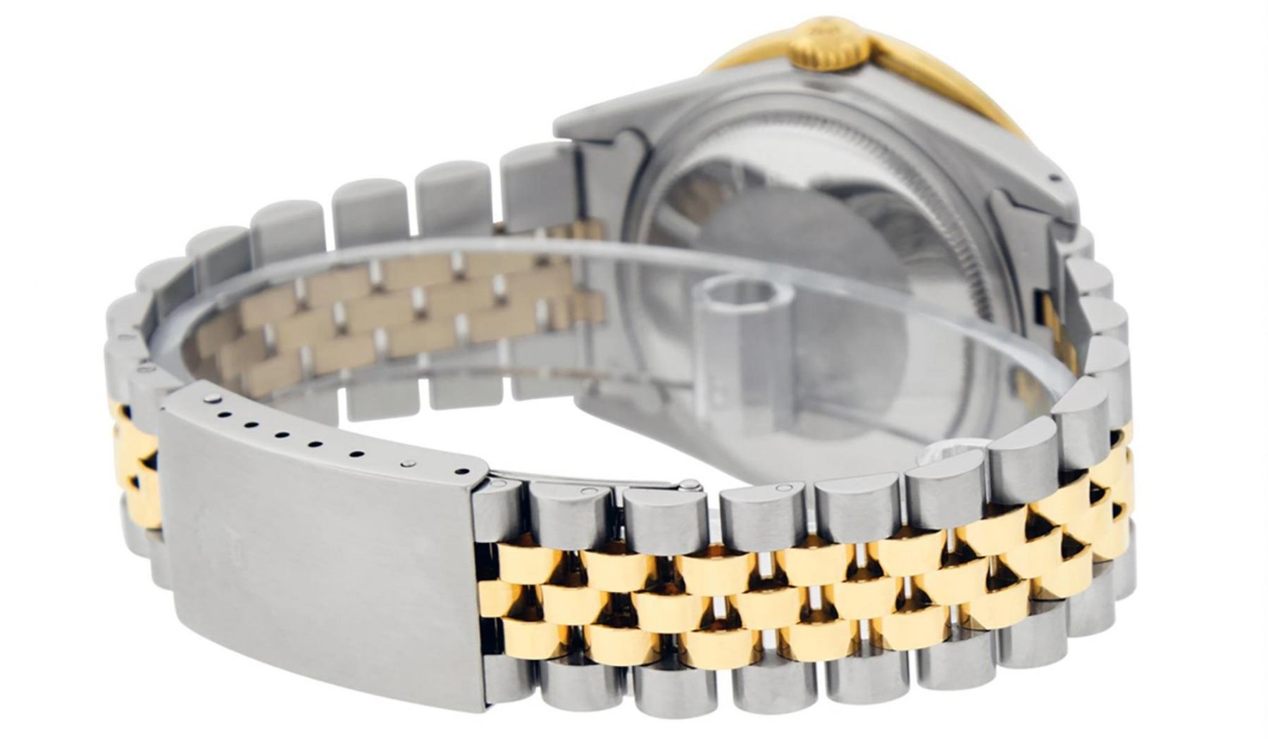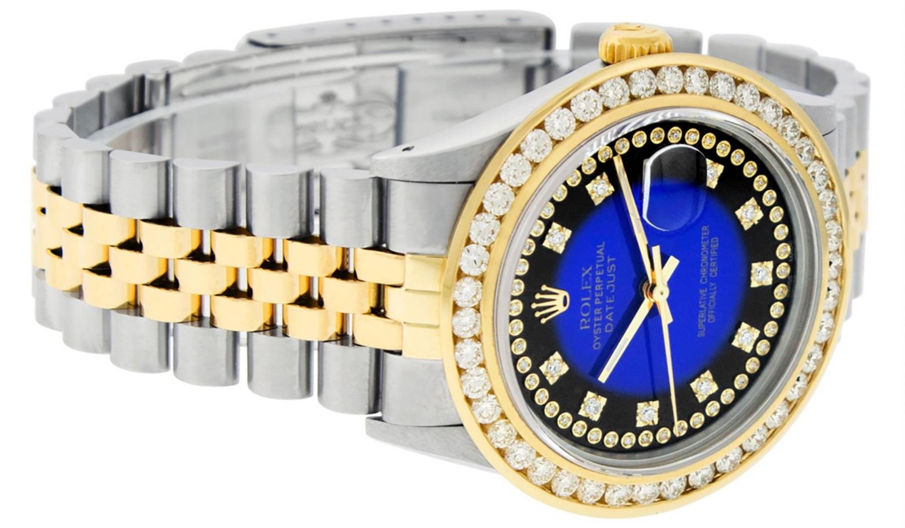 One Mens Yellow Gold Rolex Datejust Polished Bright with Satin Finish, Serviced & Electronically Tested, Stainless Steel Case: 36mm, Yellow Gold Crown, Custom Bezel: New 18K Yellow Gold 3ct Channel Set Diamond Bezel, Diamond Count: 40 Diamonds In Bezel, Total Weight 3.00 Carat, Clarity: SI-VS, Color: G to H. Custom Crystal: New Scratch Resistent Synthetic Sapphire Cyclops Lens. Custom Hands: New Luminecent Hands. Movement: Automatic Winding Movement. Custom Dial: Blue Vignette String Diamond Dial, Diamond Count: 58 Diamonds In Dial, Color: G to H, Clarity: VS. Date Window: 3 O'Clock Position Date Display, Quickset, Model: Datejust. Condition: G-6 Extra Fine. Bracelet: Yellow Gold And Stainless Steel Jubilee Band. Bright Polish & Satin Finish. 7.0 Inch Length, Adjustable. Standard Clasp, With Rolex Logo. This Watch Has Been Serviced And Polished It Is Free Of All Scratches And Dents.