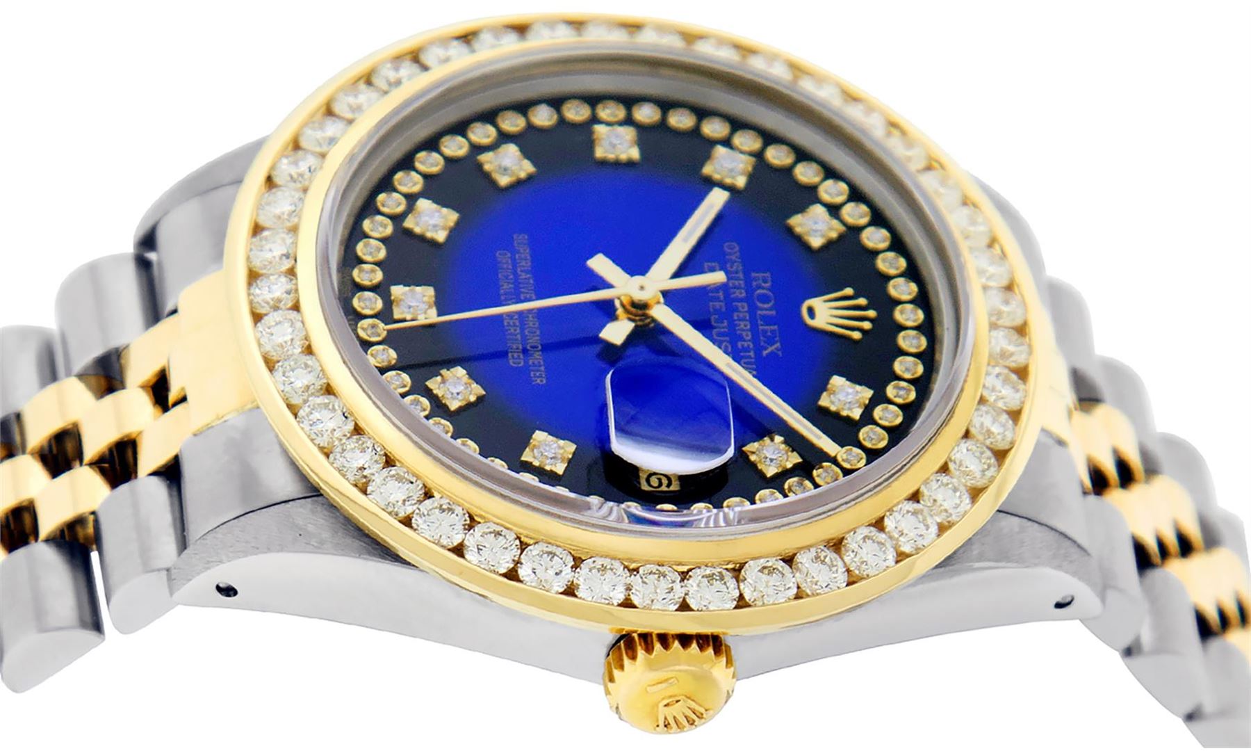 One Mens Pre Owned Yellow Gold Rolex Datejust Polished Bright with Satin Finish, Serviced & Electronically Tested, Rolex Stainless Steel Case: 36mm, Rolex Yellow Gold Crown, Custom Bezel: New 18K Yellow Gold 3ct Channel Set Diamond Bezel, Diamond Count: 4
