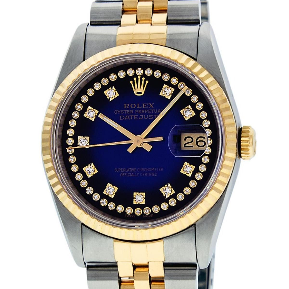 One Mens Yellow Gold Two Tone Rolex Datejust Polished, Serviced & Electronically Tested, Yellow Gold & Stainless Steel Case: 36mm, Yellow Gold Crown, Bezel: Yellow Gold Fluted Bezel. Custom Crystal: New Acrylic Cyclops Lens. Custom Hands: New Luminecent Hands. Movement: Automatic Winding Movement . Custom Dial: Blue Vignette String Dial Set With VS Diamond Hour Markers, Diamond Count: 58 Diamonds in Dial, G To H In Color, SI-VS Clarity. Date Window: 3 O'Clock Position Date Display, Quickset, Model: Datejust, Condition: G-6 Extra Fine. Bracelet: Two Tone Yellow Gold & Stainless Steel Jubilee. Bright Polish. 7.0 Inch Length, Adjustable. Standard Clasp, With Rolex Logo. This Watch Has Been Serviced And Polished It Is Free Of All Scratches And Dents.