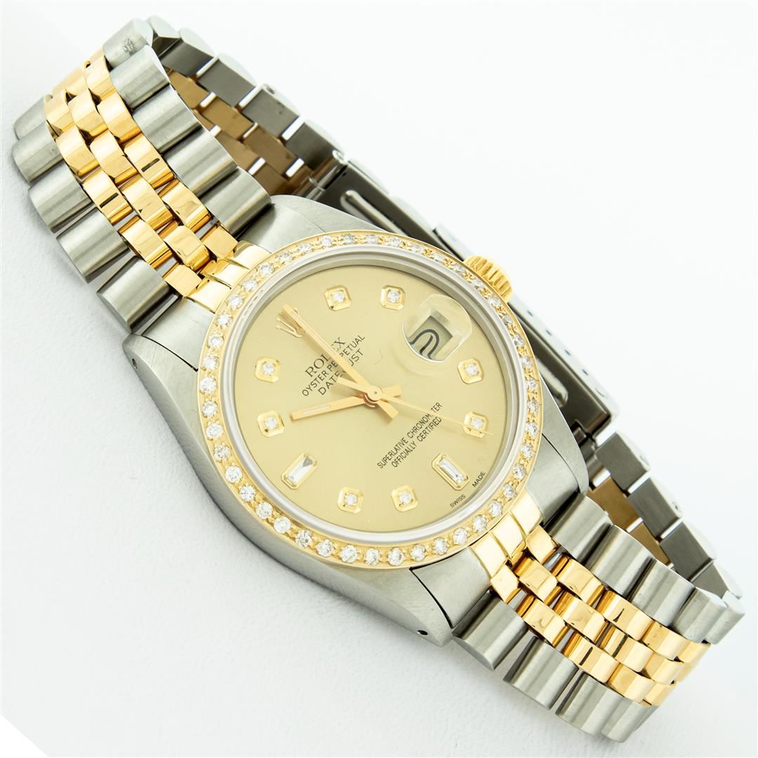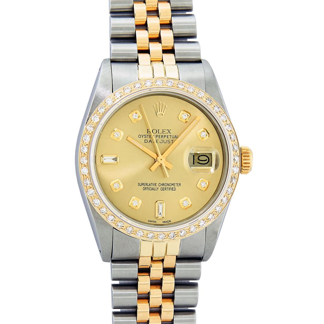 One Mens Pre Owned Yellow Gold Two Tone Rolex Datejust Polished, Serviced & Electronically Tested, Rolex 18K Yellow Gold & Stainless Steel Case: 36mm, Rolex 18K Yellow Gold Crown, Custom Bezel: New 18K Yellow Gold Beadset Diamond Bezel, Diamond Count: 44 Diamonds, Clarity: SI-VS, Color: G to H. Crystal: New Sapphire Magnified Lens. Custom Hands: New Luminescent Hands. Rolex Movement: Automatic Winding Movement. Custom Dial: Refinished To Champagne Custom Added Diamonds Baguette Diamond Hour Markers On 6 and 9, Diamond Count: 8 + 2 Baguette Diamonds in Dial G To H In Color, Clarity: VS2-SI1, Date Window: 3 O'Clock Position Date Display, Quickset, Model: Condition: G-6 Extra Fine. Rolex Bracelet: Two Tone Yellow Gold & Stainless Steel Jubilee. Bright Polish. 7.0 Inch Length, Adjustable. Standard Clasp, With Rolex Logo. This Watch Has Been Serviced Time Tested And Is In Excellent Condition It Is Free Of All Scratches And Dents.