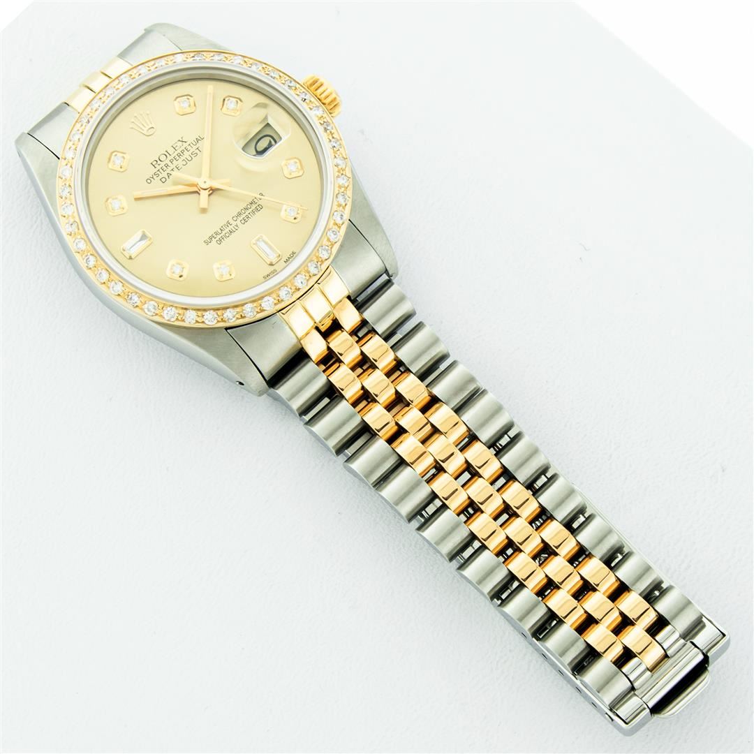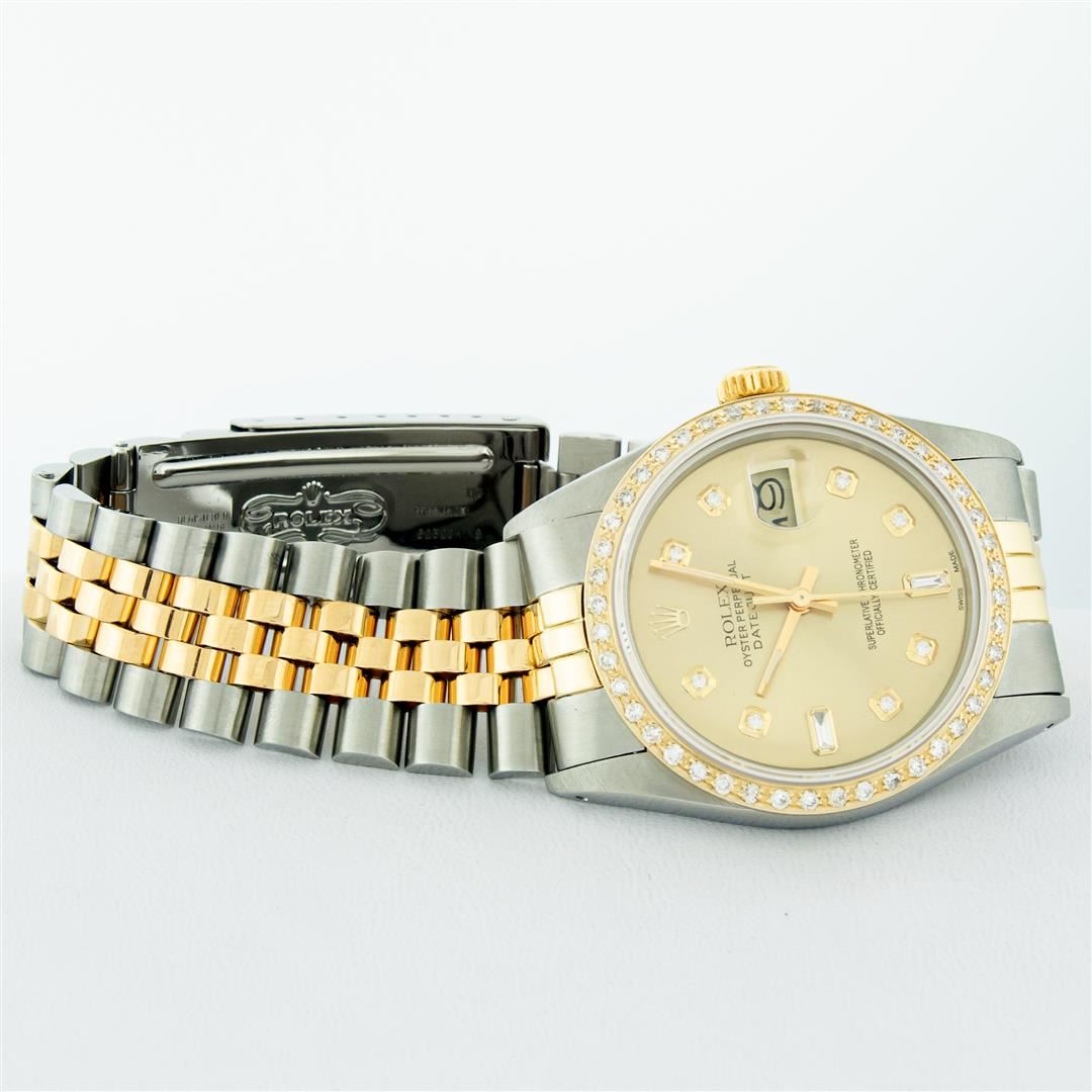 One Mens Pre Owned Yellow Gold Two Tone Rolex Datejust Polished, Serviced & Electronically Tested, Rolex 18K Yellow Gold & Stainless Steel Case: 36mm, Rolex 18K Yellow Gold Crown, Custom Bezel: New 18K Yellow Gold Beadset Diamond Bezel, Diamond Count: 44 Diamonds, Clarity: SI-VS, Color: G to H. Crystal: New Sapphire Magnified Lens. Custom Hands: New Luminescent Hands. Rolex Movement: Automatic Winding Movement. Custom Dial: Refinished To Champagne Custom Added Diamonds Baguette Diamond Hour Markers On 6 and 9, Diamond Count: 8 + 2 Baguette Diamonds in Dial G To H In Color, Clarity: VS2-SI1, Date Window: 3 O'Clock Position Date Display, Quickset, Model: Condition: G-6 Extra Fine. Rolex Bracelet: Two Tone Yellow Gold & Stainless Steel Jubilee. Bright Polish. 7.0 Inch Length, Adjustable. Standard Clasp, With Rolex Logo. This Watch Has Been Serviced Time Tested And Is In Excellent Condition It Is Free Of All Scratches And Dents.