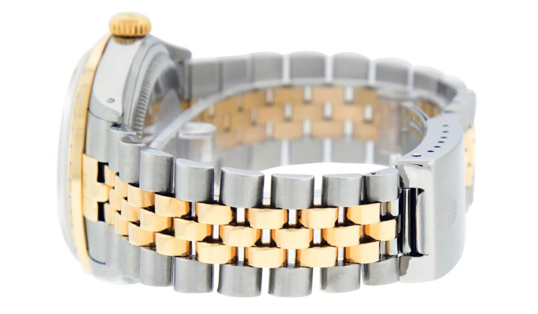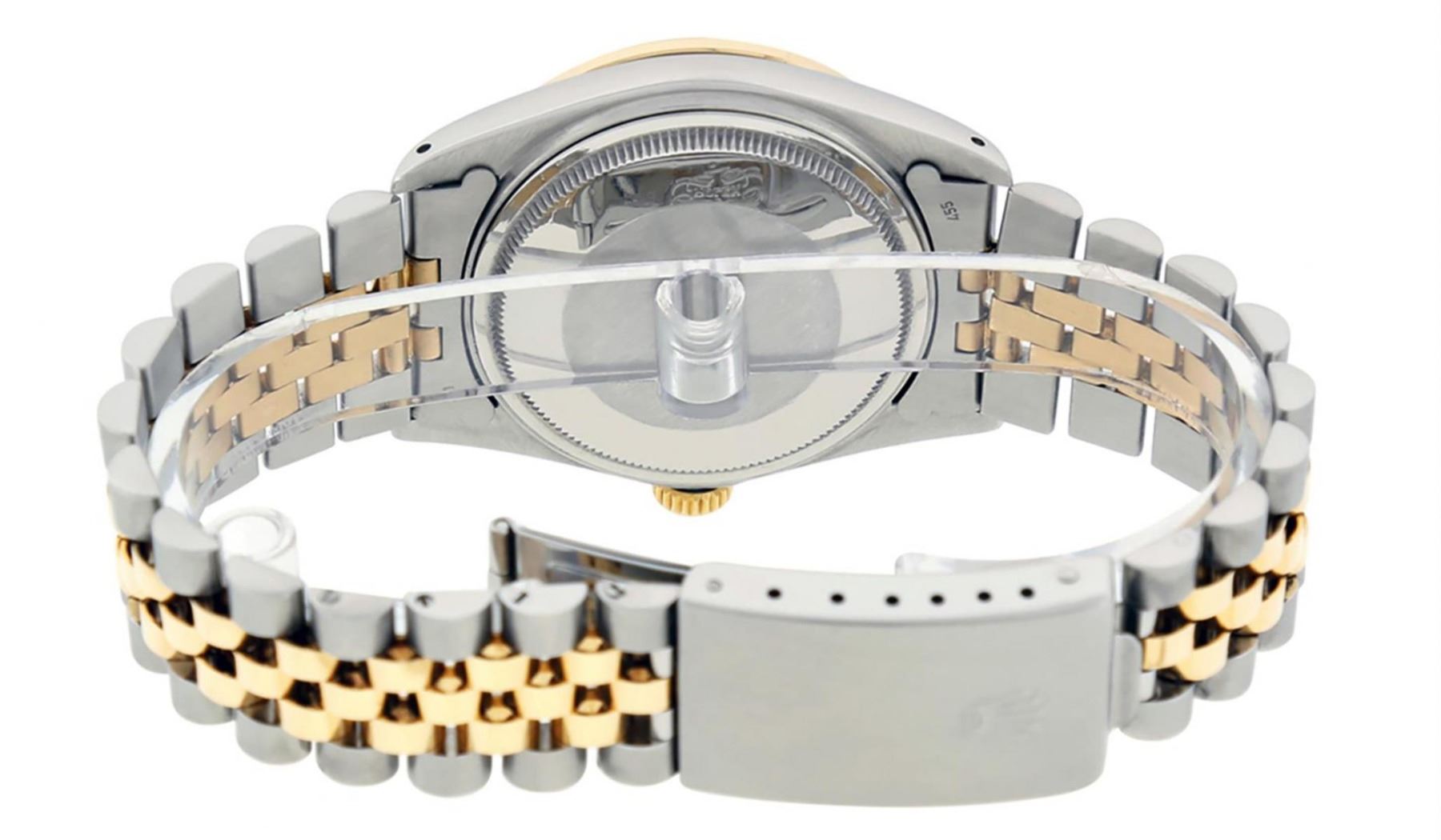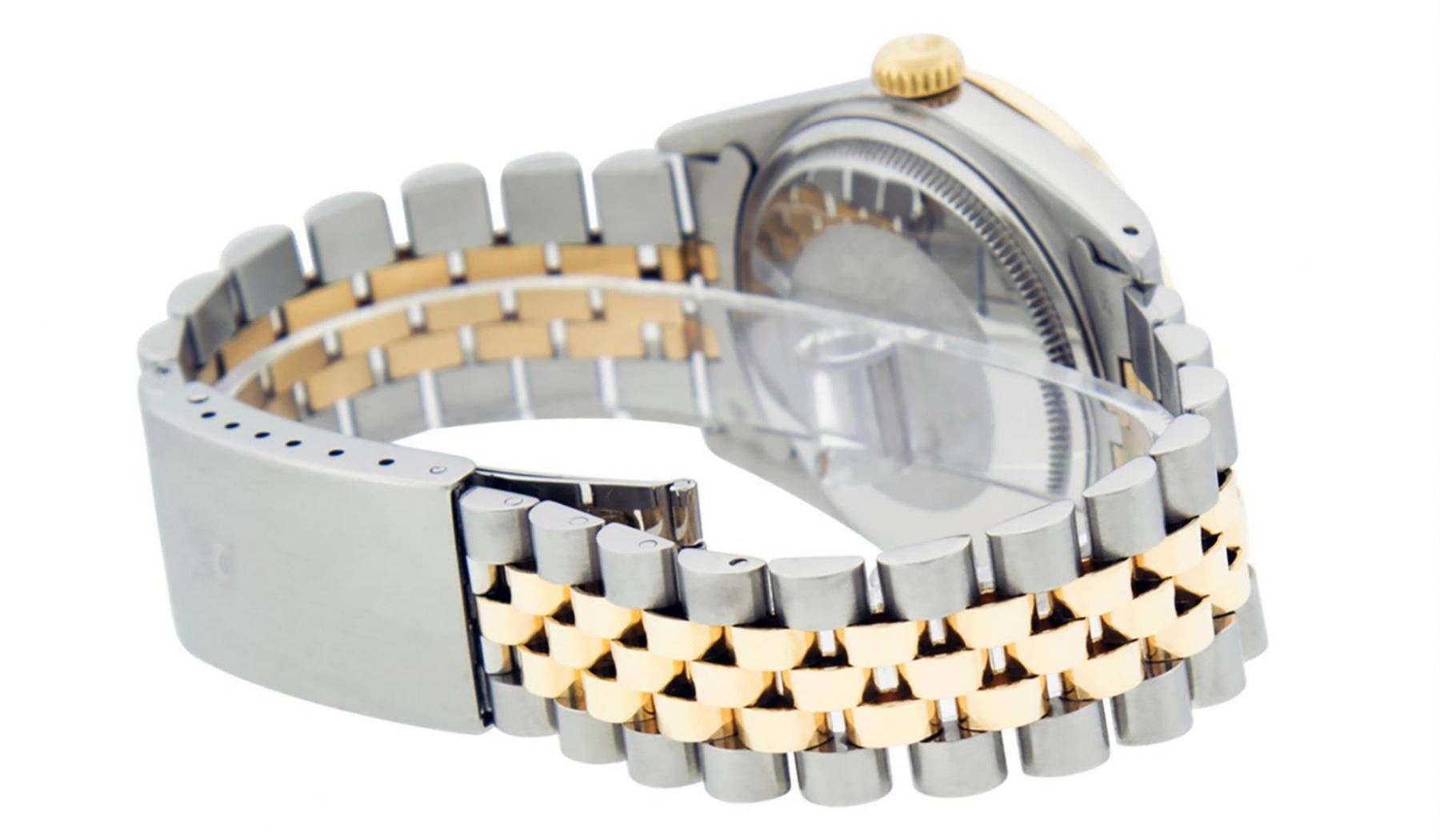 One Mens Yellow Gold Two Tone Rolex Datejust Polished, Serviced & Electronically Tested, Yellow Gold & Stainless Steel Case: 36mm, Yellow Gold Crown, Custom Bezel: New 18K Yellow Gold Beadset Diamond Bezel, Diamond Count: 44 Diamonds In Bezel, Total Weight 1.00 Carat, Clarity: SI-VS, Color: G to H. Custom Crystal: New Scratch Resistant Synthetic Sapphire Cyclops Lens. Custom Hands: New Luminecent Hands. Movement: Automatic Winding Movement. Custom Dial: Champagne With Diamond Hour Markers. Diamond Count: 10 Diamonds In Dial, Clarity: SI-VS, Color: Color G to H Date Window: 3 O'Clock Position Date Display, Quickset, Model: Datejust. Condition: G-6 Extra Fine. Bracelet:Two Tone Yellow Gold & Stainless Steel Jubilee. Bright Polish. 7.0 Inch Length, Adjustable. Standard Clasp, With Rolex Logo. This Watch Has Been Serviced Time Tested And Is In Excellent Condition It Is Free Of All Scratches And Dents.