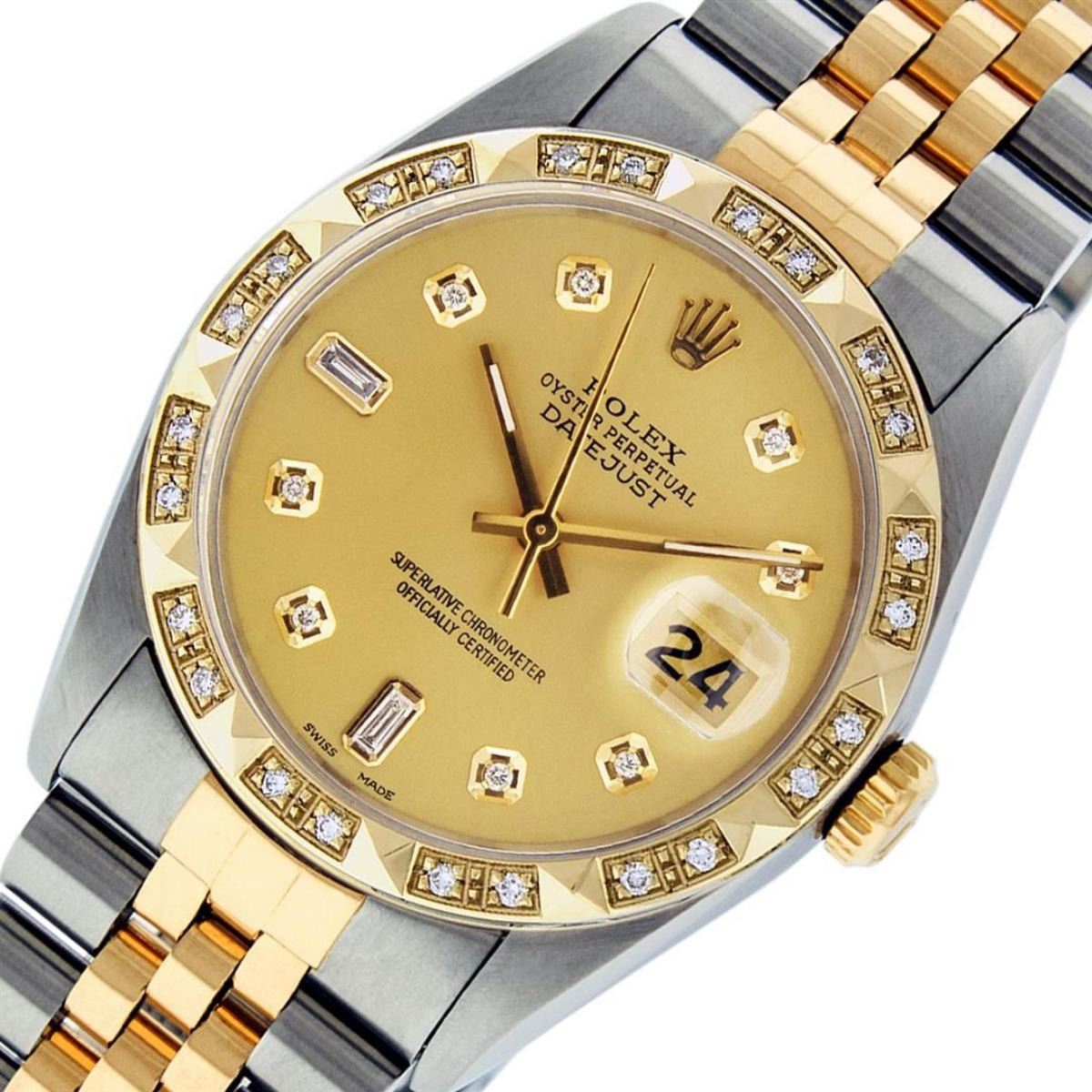 One Mens Yellow Gold Rolex Datejust Polished Bright with Satin Finish, Serviced & Electronically Tested, Stainless Steel Case: 36mm, Yellow Gold Crown, Custom Bezel: New 18K Yellow Gold Pyramid Diamond Bezel, Diamond Count: 24 Diamonds, Total Weight .75 Carat, Clarity: SI-VS, Color: G to H. Custom Crystal: New Synthetic Sapphire Cyclops Lens. Custom Hands: New Luminecent Hands. Movement: Automatic Winding Movement . Custom Dial: Champagne Diamond Dial, Diamond Count: 8 Diamonds + 2 Baguette Diamonds In Dial, Color: G to H, Clarity: VS. Date Window: 3 O'Clock Position Date Display, Quickset, Model: Datejust. Condition: G-6 Extra Fine. Bracelet: Yellow Gold And Stainless Steel Jubilee Band. Bright Polish & Satin Finish. 7.0 Inch Length, Adjustable. Standard Clasp, With Rolex Logo. This Watch Has Been Serviced And Polished It Is Free Of All Scratches And Dents.