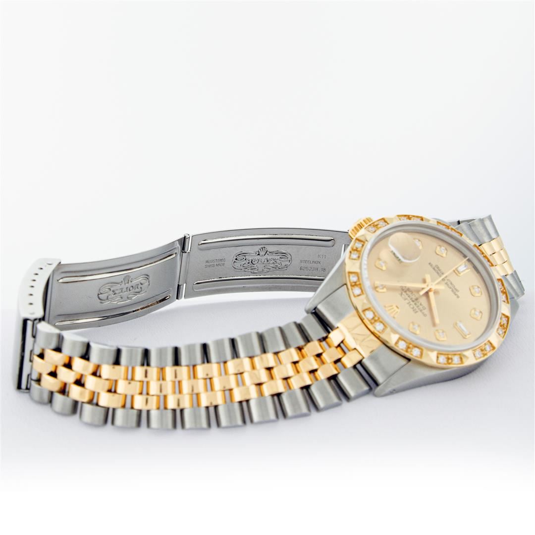 One Mens Pre Owned Yellow Gold Rolex Datejust Polished Bright with Satin Finish, Serviced & Electronically Tested, Rolex Stainless Steel Case: 36mm, Yellow Gold Crown, Custom Bezel: New 18K Yellow Gold Pyramid Diamond Bezel, Diamond Count: 24 Diamonds, Clarity: SI-VS, Color: G to H. Custom Crystal: New Sapphire Magnified Date. Custom Hands: New Luminescent Hands. Rolex Movement: Automatic Winding Movement. Custom Dial: Refinished Champagne Custom Diamonds, Diamond Count: 8 Diamonds + 2 Baguette Diamonds In Dial, Color: G to H, Clarity: VS. Date Window: 3 O'Clock Position Date Display, Quickset, Model: Datejust. Condition: G-6 Extra Fine. Rolex Bracelet: Yellow Gold And Stainless Steel Jubilee Band. Bright Polish & Satin Finish. 7.0 Inch Length, Adjustable. Standard Clasp, With Rolex Logo. This Watch Has Been Serviced And Polished It Is Free Of All Scratches And Dents.