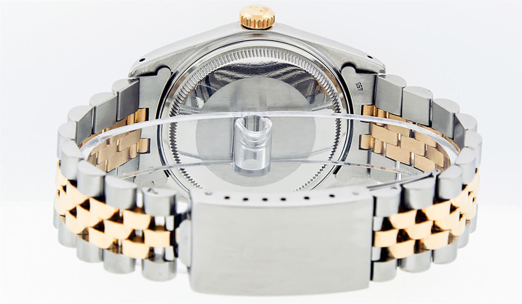 One Rolex Mens Pre Owned Yellow Gold And Stainless Steel Rolex Datejust Polished, Serviced & Electronically Tested, Yellow Gold & Stainless Steel Case: 36mm,14K Yellow Gold Crown, Bezel: 14K Yellow Gold Fluted Bezel. Custom Crystal: New Acrylic Cyclops Lens. Hands: Luminescent Hands. Rolex Movement: Automatic Winding Movement 3035. Rolex Dial: Champagne Dial With Index Hour Markers With Dash Track & Lumi Dots. Date Window: 3 O'Clock Position Date Display, Quickset, Model: Quickset Datejust. Condition: G-6 Extra Fine. Rolex Bracelet: 14K Two Tone Yellow Gold & Stainless Steel Jubilee Band. Bright Polish. 7.0 Inch Length, Adjustable. Standard Clasp, With Rolex Logo. This Watch Has Been Serviced Time Tested And Is In Excellent Condition It Is Free Of All Scratches And Dents.