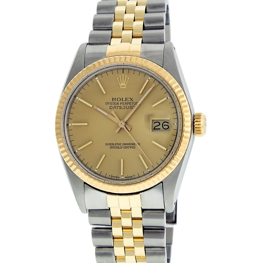 One Rolex Mens Pre Owned Yellow Gold And Stainless Steel Rolex Datejust Polished, Serviced & Electronically Tested, Yellow Gold & Stainless Steel Case: 36mm,14K Yellow Gold Crown, Bezel: 14K Yellow Gold Fluted Bezel. Custom Crystal: New Acrylic Cyclops Lens. Hands: Luminescent Hands. Rolex Movement: Automatic Winding Movement 3035. Rolex Dial: Champagne Dial With Index Hour Markers With Dash Track & Lumi Dots. Date Window: 3 O'Clock Position Date Display, Quickset, Model: Quickset Datejust. Condition: G-6 Extra Fine. Rolex Bracelet: 14K Two Tone Yellow Gold & Stainless Steel Jubilee Band. Bright Polish. 7.0 Inch Length, Adjustable. Standard Clasp, With Rolex Logo. This Watch Has Been Serviced Time Tested And Is In Excellent Condition It Is Free Of All Scratches And Dents.