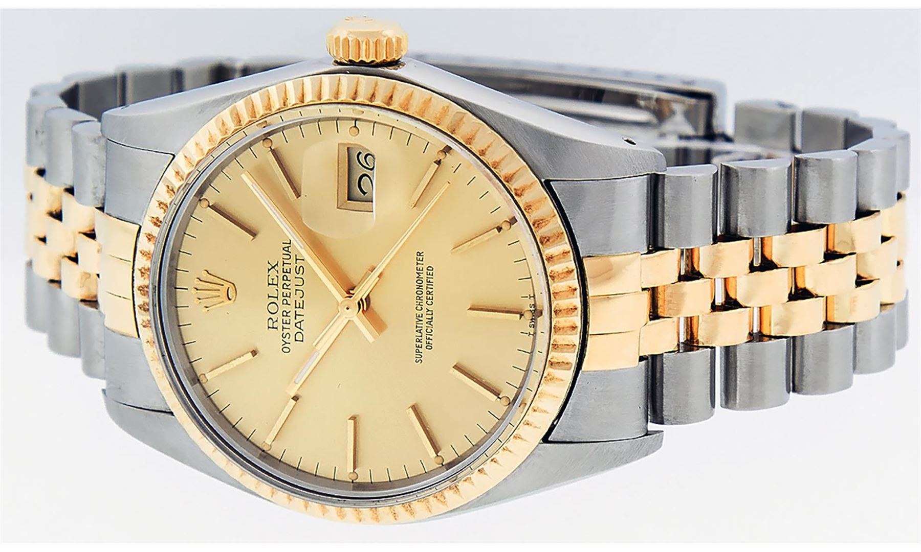 One Rolex Mens Pre Owned Yellow Gold And Stainless Steel Rolex Datejust Polished, Serviced & Electronically Tested, Yellow Gold & Stainless Steel Case: 36mm,14K Yellow Gold Crown, Bezel: 14K Yellow Gold Fluted Bezel. Custom Crystal: New Acrylic Cyclops Lens. Hands: Luminescent Hands. Rolex Movement: Automatic Winding Movement 3035. Rolex Dial: Champagne Dial With Index Hour Markers With Dash Track & Lumi Dots. Date Window: 3 O'Clock Position Date Display, Quickset, Model: Quickset Datejust. Condition: G-6 Extra Fine. Rolex Bracelet: 14K Two Tone Yellow Gold & Stainless Steel Jubilee Band. Bright Polish. 7.0 Inch Length, Adjustable. Standard Clasp, With Rolex Logo. This Watch Has Been Serviced Time Tested And Is In Excellent Condition It Is Free Of All Scratches And Dents.