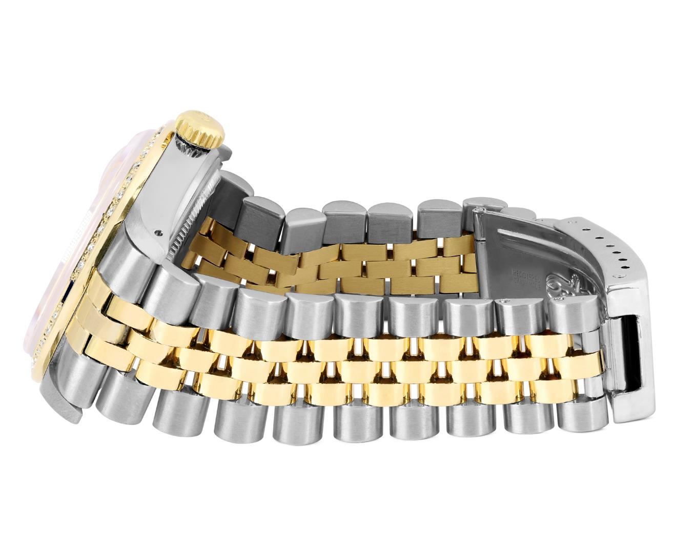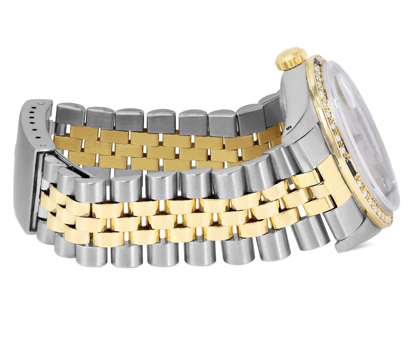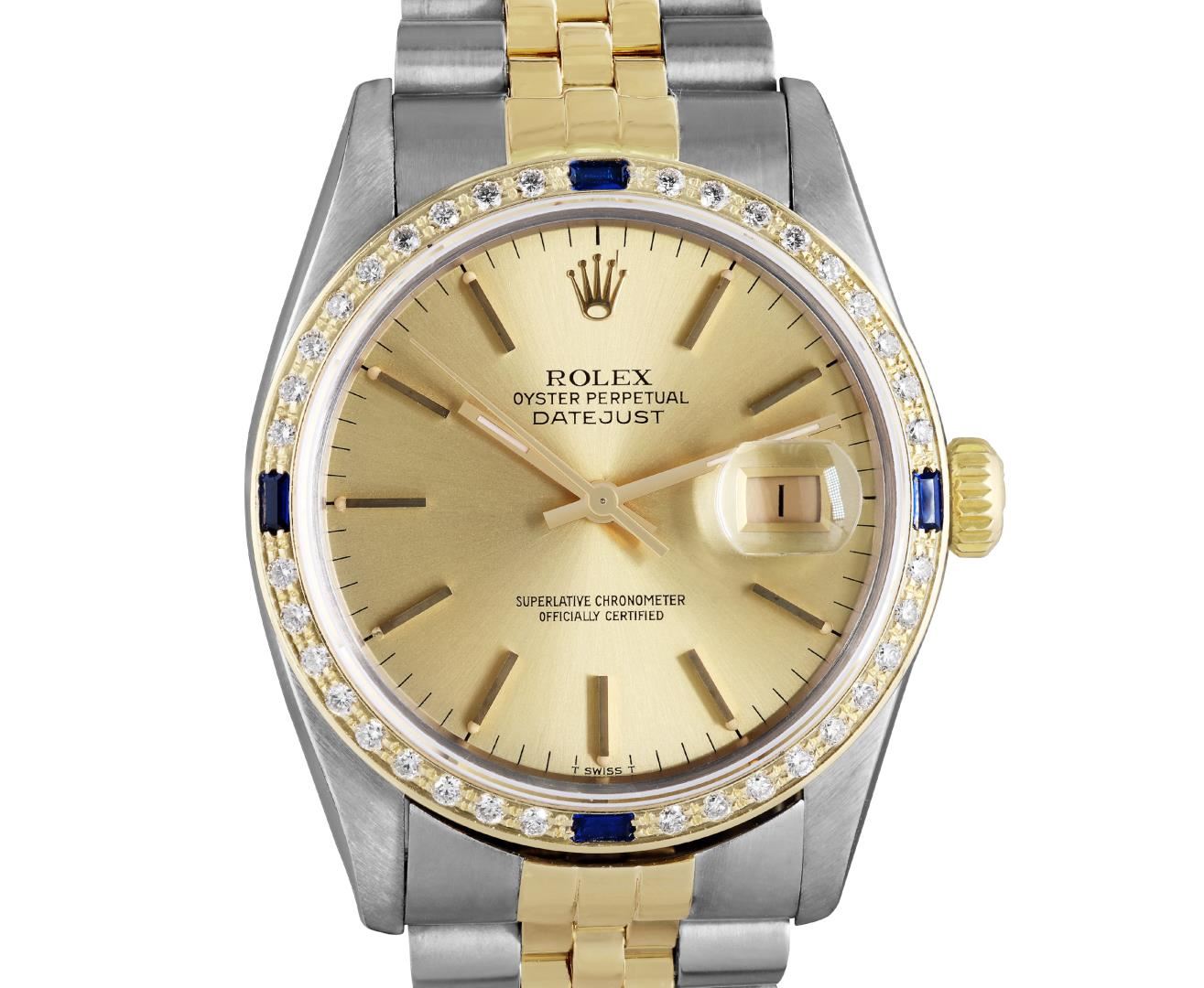 One Mens Pre Owned Two Tone Yellow Gold And Stainless Steel Rolex Datejust Polished, Serviced And Electronically Tested, Yellow Gold And Stainless Steel Case: 36mm, Rolex Yellow Gold Crown, Custom Bezel: New 18K Yellow Gold Sapphire Beadset Diamond Bezel, Diamond Count: 36 Diamonds + 4 Sapphires. Custom Crystal: New Sapphire With Magnified Date Window. Custom Hands: New Hands. Rolex Movement: Automatic Winding Movement 3035. Rolex Factory Dial: Champagne Index With Dash Track And Lumi Dots. Date Window: 3 O'Clock Position Date Display, Quickset, Model: Quickset Datejust. Condition: G-6 Extra Fine. Rolex Bracelet: Two Tone Yellow Gold And Stainless Steel Jubilee Band. Bright Polish. 7.0 Inch Length, Adjustable. Standard Clasp, With Rolex Logo. This Watch Has Been Serviced Time Tested And Is In Excellent Condition It Is Free Of All Scratches And Dents.