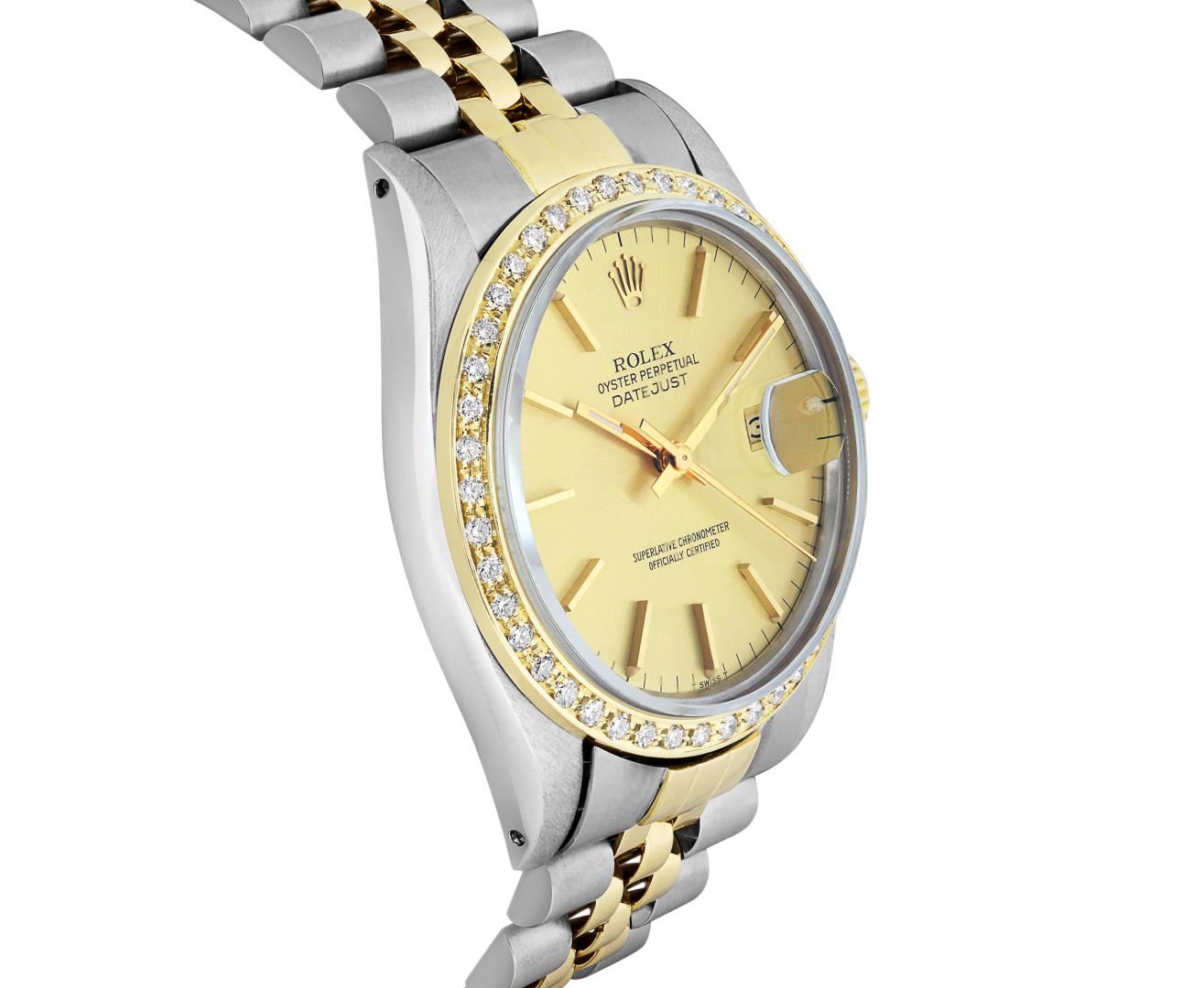 One Mens Pre Owned Yellow Gold Two Tone Rolex Datejust Polished, Serviced & Electronically Tested, Rolex Yellow Gold And Stainless Steel Case: 36mm, Rolex Yellow Gold Crown, Custom Bezel: New 18K Yellow Gold Beadset Diamond Bezel, Diamond Count: 44 Diamonds. Custom Crystal: New Sapphire With Magnified Date Window. Custom Hands: New Luminecent Hands. Rolex Movement: Automatic Winding Movement 3035. Rolex Dial: Champagne Dial With Index Hour Markers and Dash Track With Lumi Dots. Date Window: 3 O'Clock Position Date Display, Quickset, Model: Quickset Datejust. Condition: G-6 Extra Fine. Rolex Bracelet: Two Tone Yellow Gold & Stainless Steel Jubilee Band. Bright Polish. 7.0 Inch Length, Adjustable. Standard Clasp, With Rolex Logo. This Watch Has Been Serviced Time Tested And Is In Excellent Condition It Is Free Of All Scratches And Dents.