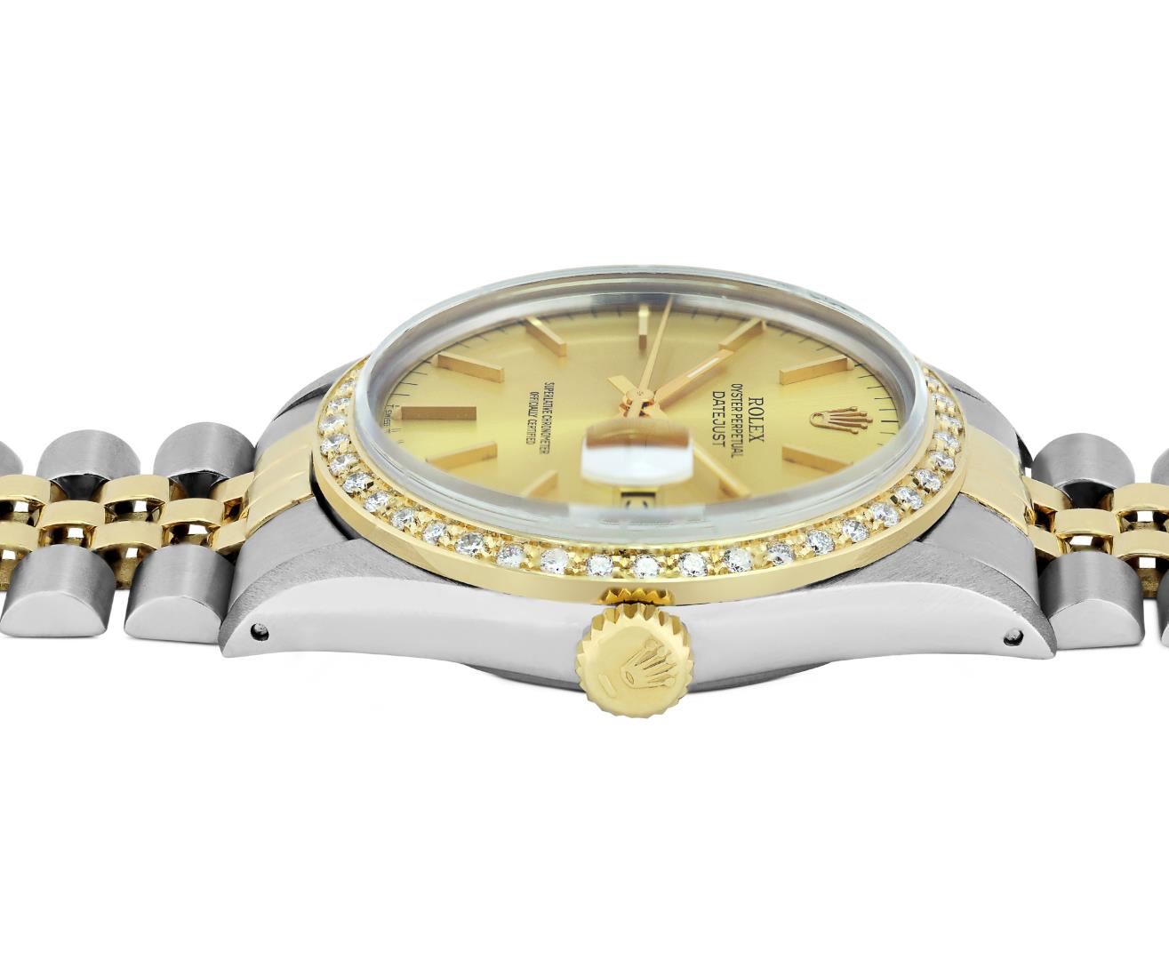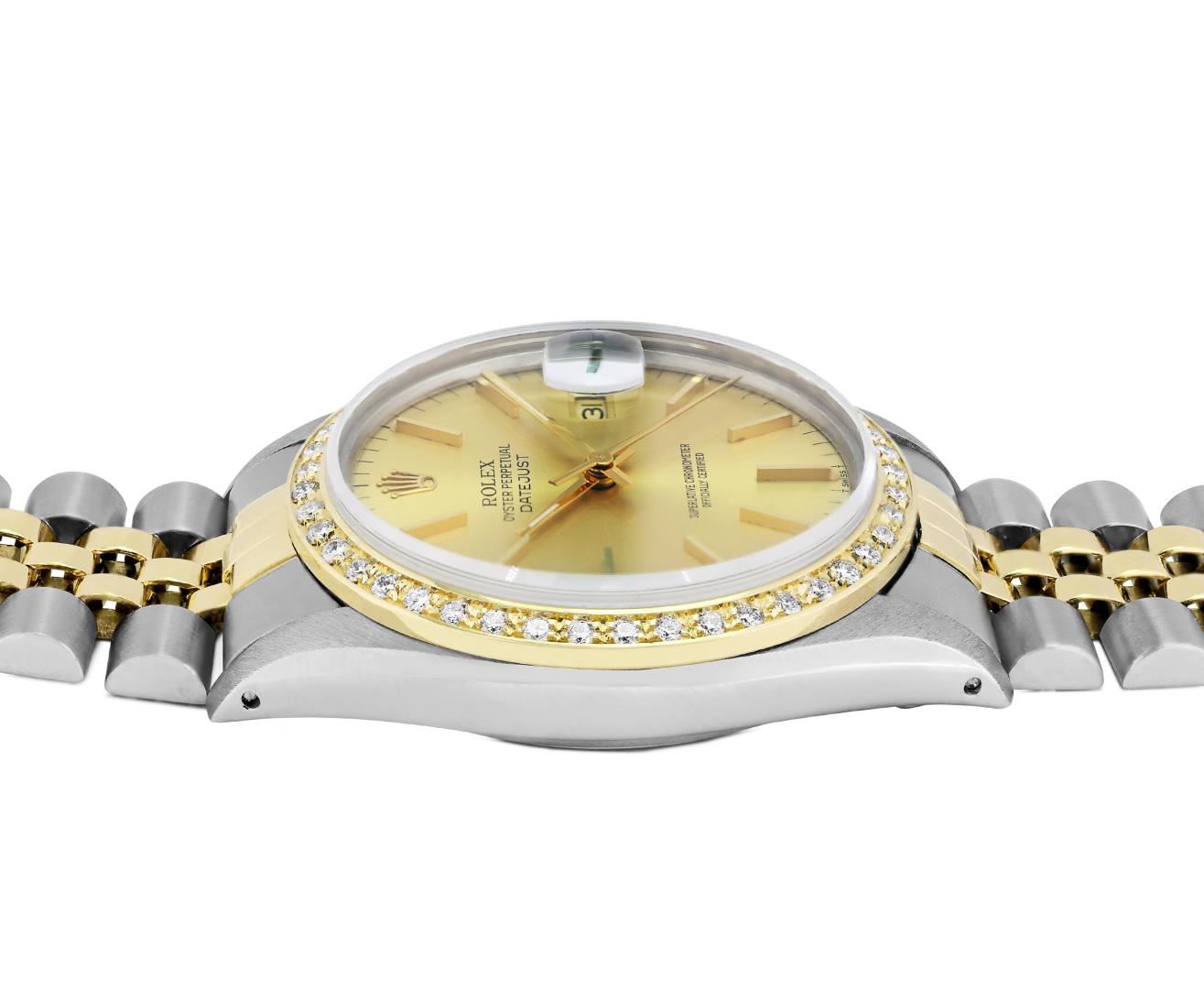 One Mens Pre Owned Yellow Gold Two Tone Rolex Datejust Polished, Serviced & Electronically Tested, Rolex Yellow Gold And Stainless Steel Case: 36mm, Rolex Yellow Gold Crown, Custom Bezel: New 18K Yellow Gold Beadset Diamond Bezel, Diamond Count: 44 Diamonds. Custom Crystal: New Sapphire With Magnified Date Window. Custom Hands: New Luminecent Hands. Rolex Movement: Automatic Winding Movement 3035. Rolex Dial: Champagne Dial With Index Hour Markers and Dash Track With Lumi Dots. Date Window: 3 O'Clock Position Date Display, Quickset, Model: Quickset Datejust. Condition: G-6 Extra Fine. Rolex Bracelet: Two Tone Yellow Gold & Stainless Steel Jubilee Band. Bright Polish. 7.0 Inch Length, Adjustable. Standard Clasp, With Rolex Logo. This Watch Has Been Serviced Time Tested And Is In Excellent Condition It Is Free Of All Scratches And Dents.