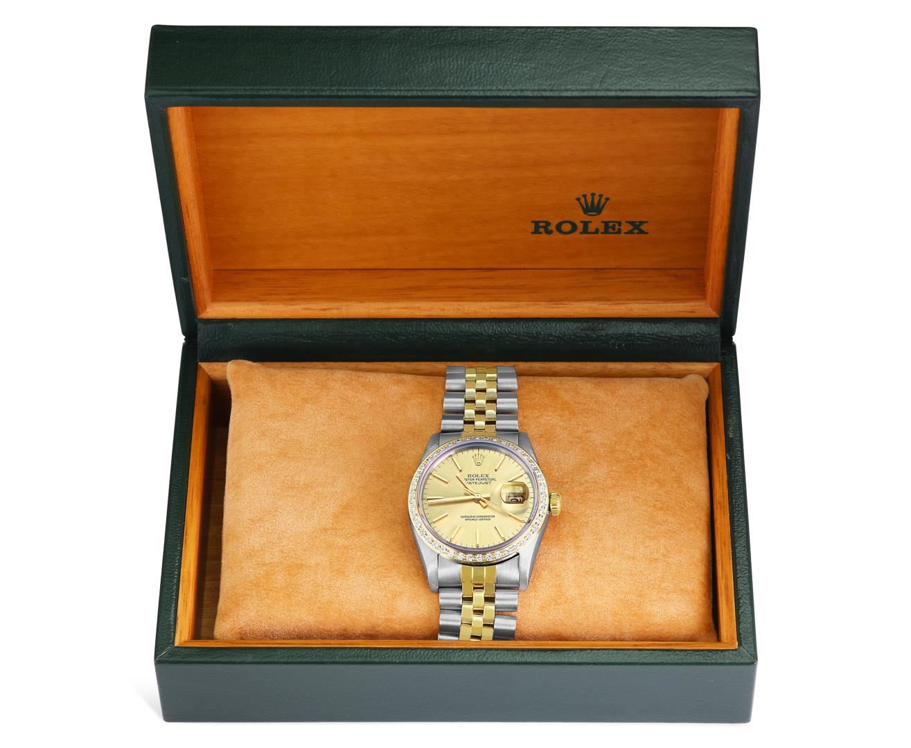 One Mens Pre Owned Yellow Gold Two Tone Rolex Datejust Polished, Serviced & Electronically Tested, Rolex Yellow Gold And Stainless Steel Case: 36mm, Rolex Yellow Gold Crown, Custom Bezel: New 18K Yellow Gold Beadset Diamond Bezel, Diamond Count: 44 Diamonds. Custom Crystal: New Sapphire With Magnified Date Window. Custom Hands: New Luminecent Hands. Rolex Movement: Automatic Winding Movement 3035. Rolex Dial: Champagne Dial With Index Hour Markers and Dash Track With Lumi Dots. Date Window: 3 O'Clock Position Date Display, Quickset, Model: Quickset Datejust. Condition: G-6 Extra Fine. Rolex Bracelet: Two Tone Yellow Gold & Stainless Steel Jubilee Band. Bright Polish. 7.0 Inch Length, Adjustable. Standard Clasp, With Rolex Logo. This Watch Has Been Serviced Time Tested And Is In Excellent Condition It Is Free Of All Scratches And Dents.