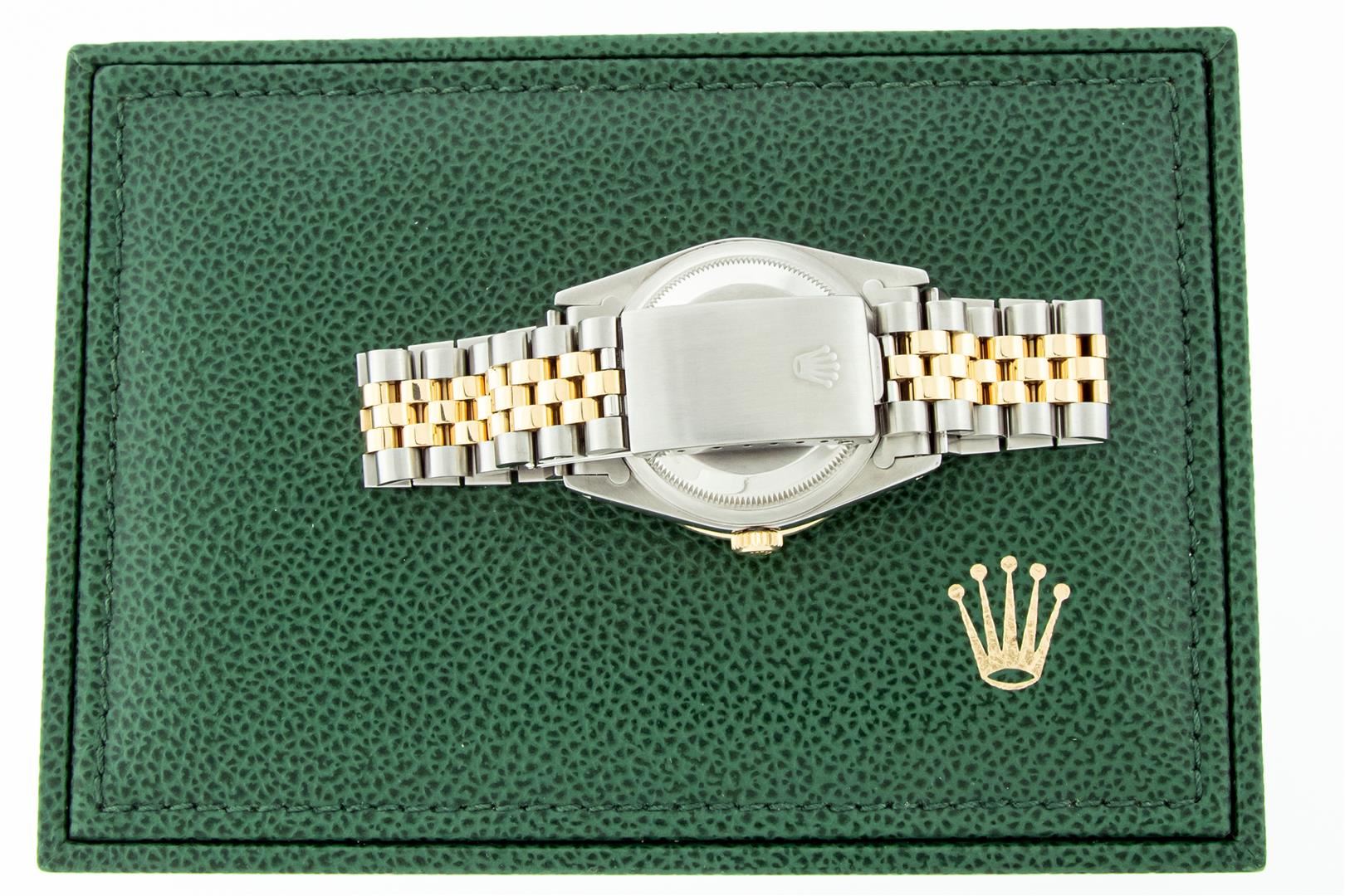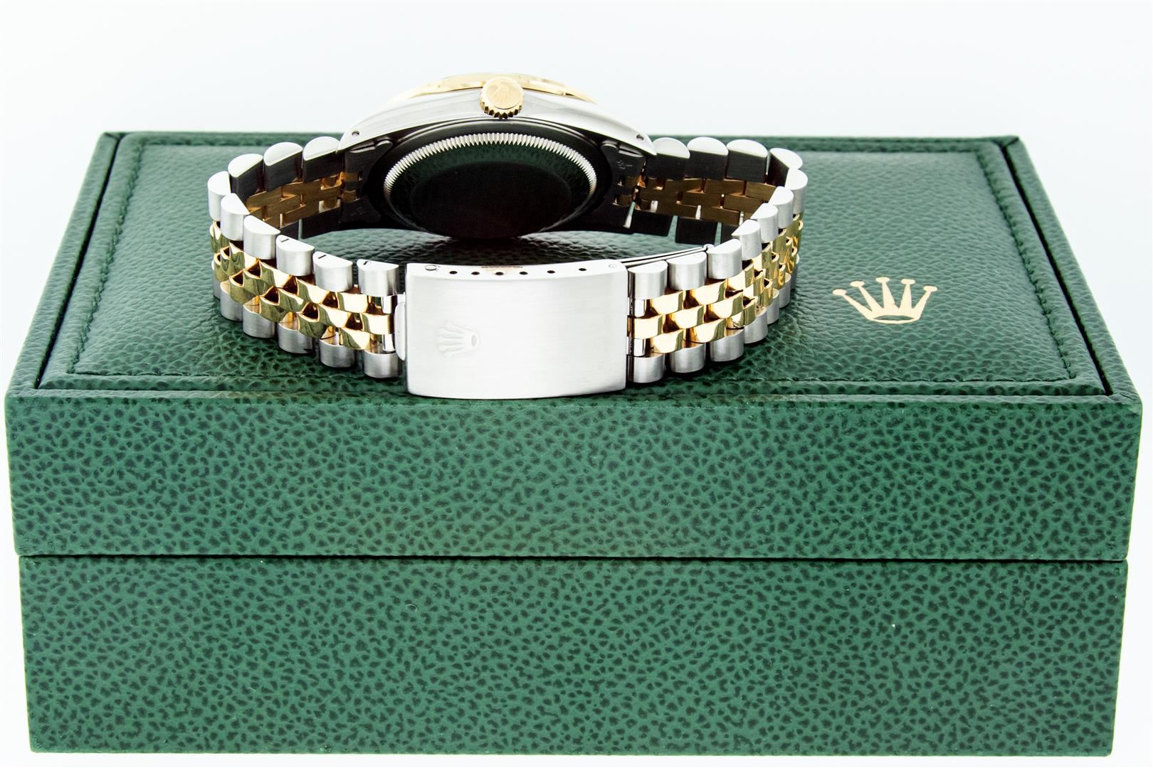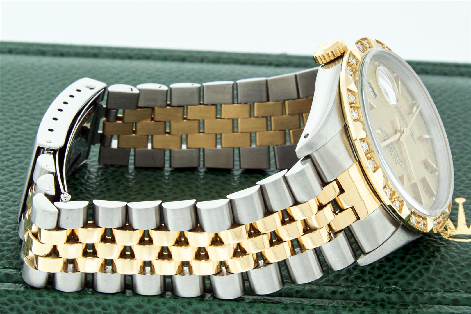 One Mens Pre Owned Yellow Gold Two Tone Rolex Datejust Polished, Serviced & Electronically Tested, Rolex Yellow Gold & Stainless Steel Case: 36mm,Rolex 14K Yellow Gold Crown, Custom Bezel: New 18K Yellow Gold Pyramid Diamond Bezel, Diamond Count: 24 Diamonds, Total Weight .75 Carat, Clarity: SI-VS, Color: G to H. Custom Crystal: New Scratch Resistant Synthetic Sapphire Cyclops Lens. Custom Hands: New Luminecent Hands. Rolex Movement: Automatic Winding Movement. Rolex Dial: Champagne Jubilee Dial With Index Hour Markers and Small Track With Lumi Dots. Date Window: 3 O'Clock Position Date Display, Quickset, Model: Datejust. Condition: G-6 Extra Fine. Rolex Bracelet: Two Tone Yellow Gold & Stainless Steel Jubilee Band. Bright Polish. 7.0 Inch Length, Adjustable. Standard Clasp, With Rolex Logo. This Watch Has Been Serviced Time Tested And Is In Excellent Condition It Is Free Of All Scratches And Dents. This Watch Comes With A Rolex Box.