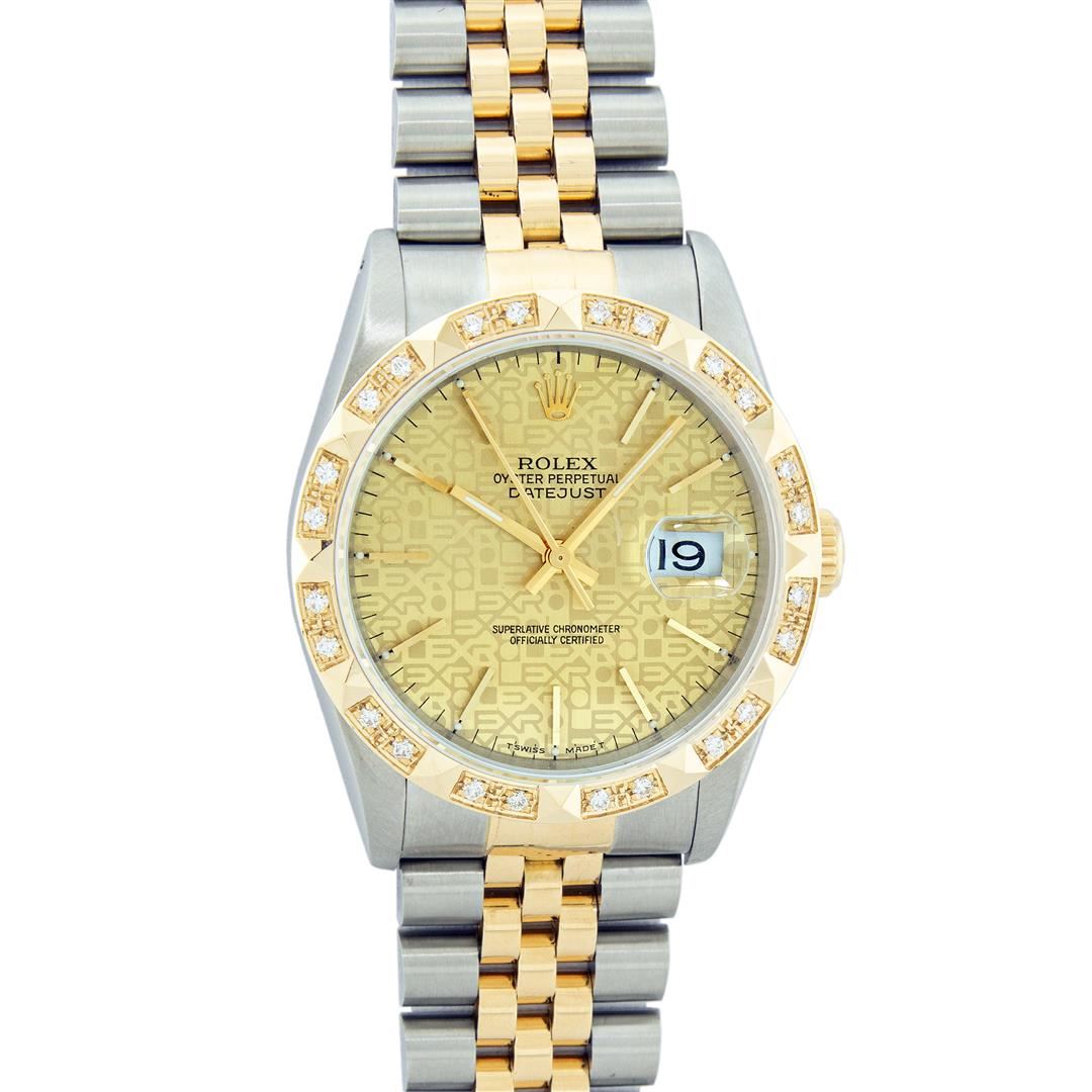 One Mens Pre Owned Yellow Gold Two Tone Rolex Datejust Polished, Serviced & Electronically Tested, Rolex Yellow Gold & Stainless Steel Case: 36mm,Rolex 14K Yellow Gold Crown, Custom Bezel: New 18K Yellow Gold Pyramid Diamond Bezel, Diamond Count: 24 Diamonds, Total Weight .75 Carat, Clarity: SI-VS, Color: G to H. Custom Crystal: New Scratch Resistant Synthetic Sapphire Cyclops Lens. Custom Hands: New Luminecent Hands. Rolex Movement: Automatic Winding Movement. Rolex Dial: Champagne Jubilee Dial With Index Hour Markers and Small Track With Lumi Dots. Date Window: 3 O'Clock Position Date Display, Quickset, Model: Datejust. Condition: G-6 Extra Fine. Rolex Bracelet: Two Tone Yellow Gold & Stainless Steel Jubilee Band. Bright Polish. 7.0 Inch Length, Adjustable. Standard Clasp, With Rolex Logo. This Watch Has Been Serviced Time Tested And Is In Excellent Condition It Is Free Of All Scratches And Dents.