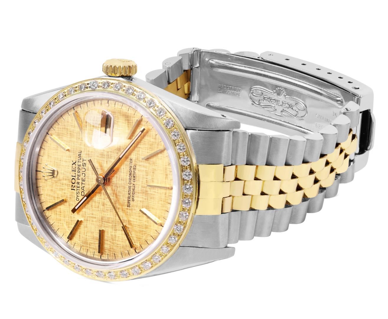 One Mens Pre Owned Yellow Gold Two Tone Rolex Datejust Polished, Serviced And Electronically Tested, Rolex Yellow Gold And Stainless Steel Case: 36mm, Rolex Yellow Gold Crown, Custom Bezel: New 18K Yellow Gold Beadset Diamond Bezel, Diamond Count: 44 Diamonds. Custom Crystal: New Sapphire With Magnified Date Window. Custom Hands: New Luminecent Hands. Rolex Movement: Automatic Winding Movement 3035. Rolex Dial: Champagne Linen Dial With Index Hour Markers and Dash Track With Lumi Dots. Date Window: 3 O'Clock Position Date Display, Quickset, Model: Quickset Datejust. Condition: G-6 Extra Fine. Rolex Bracelet: Two Tone Yellow Gold And Stainless Steel Jubilee Band. Bright Polish. 7.0 Inch Length, Adjustable. Standard Clasp, With Rolex Logo. This Watch Has Been Serviced Time Tested And Is In Excellent Condition It Is Free Of All Scratches And Dents.