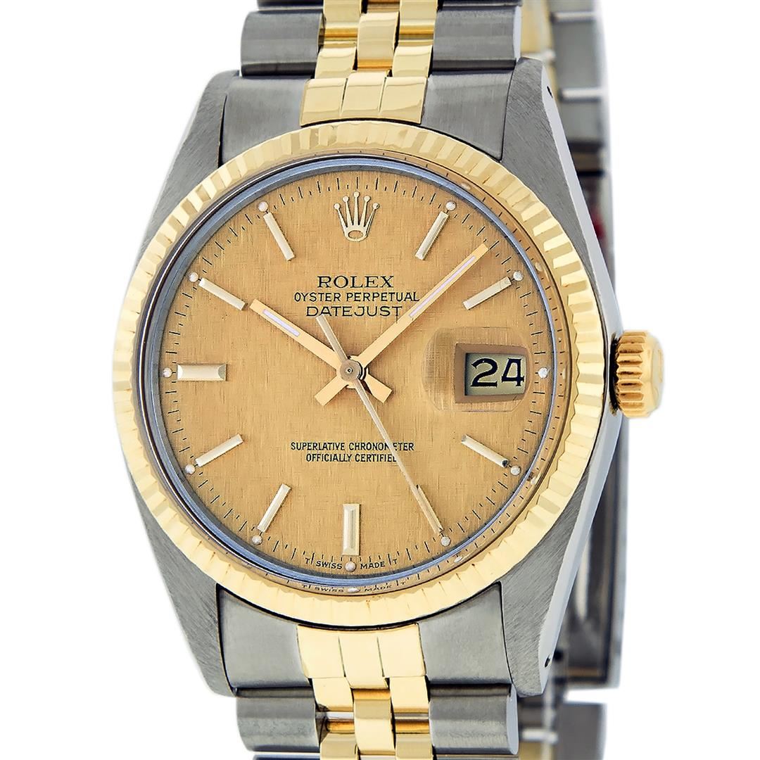 One Mens Yellow Gold Two Tone Rolex Datejust Polished, Serviced & Electronically Tested, Yellow Gold & Stainless Steel Case: 36mm, Yellow Gold Crown, Bezel: Yellow Gold Fluted Bezel. Custom Crystal: New Acrylic Cyclops Lens. Hands: Luminescent Hands. Movement: Automatic Winding Movement. Dial: Champagne Linen Dial With Index Hour Markers and Small Track With Lumi Dots. Date Window: 3 O'Clock Position Date Display, Quickset, Model: Datejust. Condition: G-6 Extra Fine. Bracelet: Two Tone Yellow Gold & Stainless Steel Jubilee Band. Bright Polish. 7.0 Inch Length, Adjustable. Standard Clasp, With Rolex Logo. This Watch Has Been Serviced Time Tested And Is In Excellent Condition It Is Free Of All Scratches And Dents.