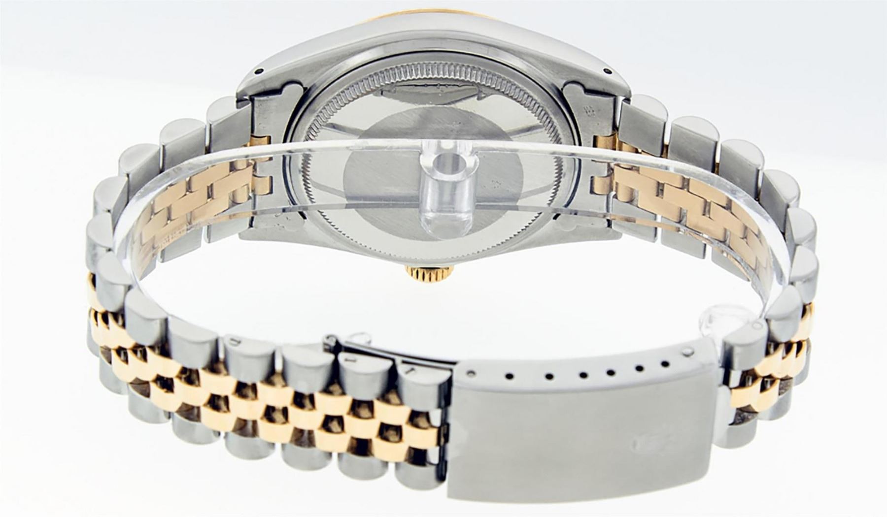 One Mens Yellow Gold Two Tone Rolex Datejust Polished, Serviced & Electronically Tested, Yellow Gold & Stainless Steel Case: 36mm, 14K Yellow Gold Crown, Bezel: Yellow Gold Fluted Bezel. Custom Crystal: New Acrylic Cyclops Lens. Hands: Luminescent Hands. Movement: Automatic Winding Movement. Dial: Champagne Tapestry Dial With Index Hour Markers and Small Track With Lumi Dots. Date Window: 3 O'Clock Position Date Display, Quickset, Model: Datejust, Condition: G-6 Extra Fine. Bracelet: Two Tone Yellow Gold & Stainless Steel Jubilee Band. Bright Polish. 7.0 Inch Length, Adjustable. Standard Clasp, With Rolex Logo. This Watch Has Been Serviced Time Tested And Is In Excellent Condition It Is Free Of All Scratches And Dents.